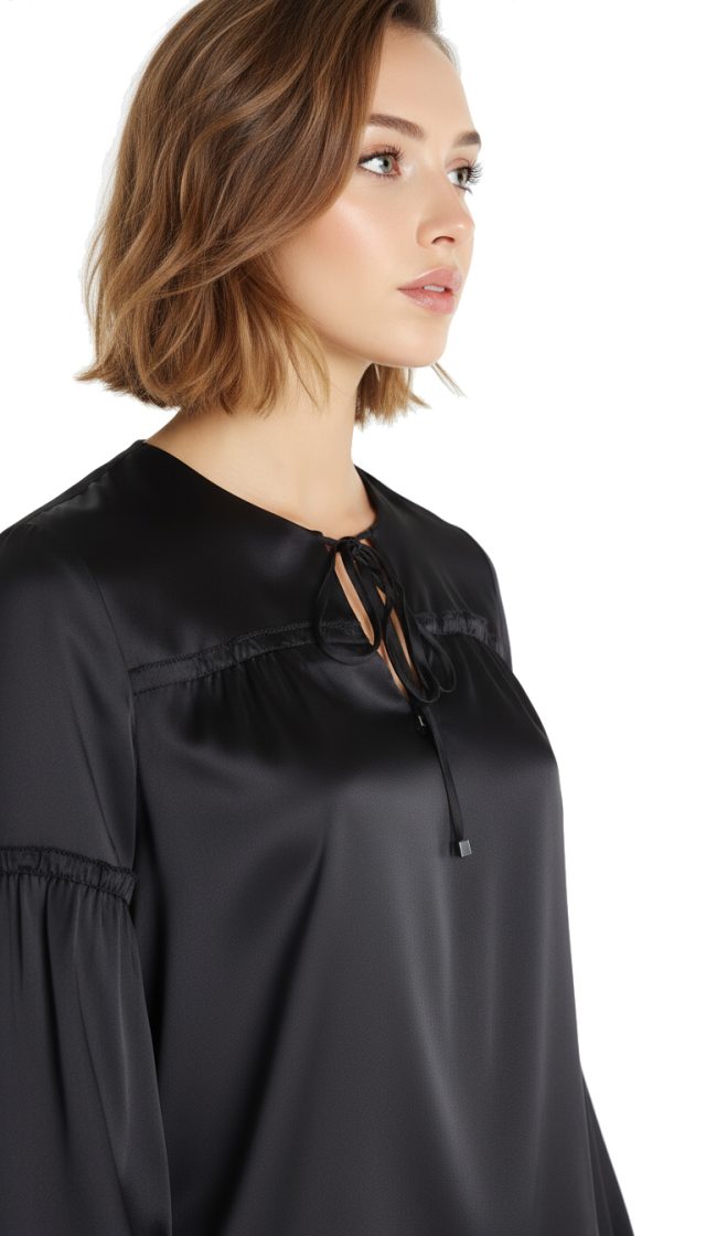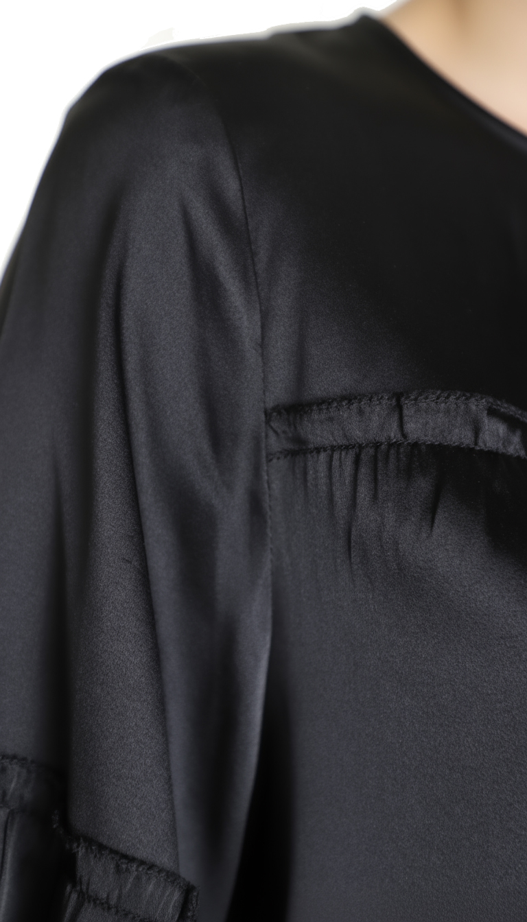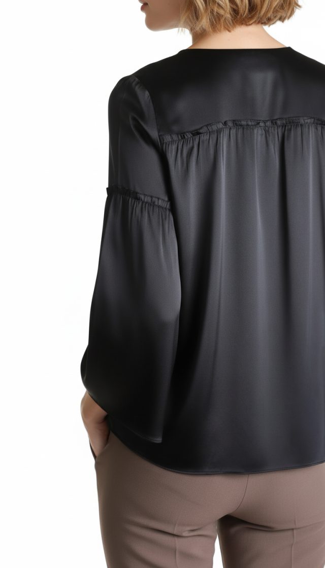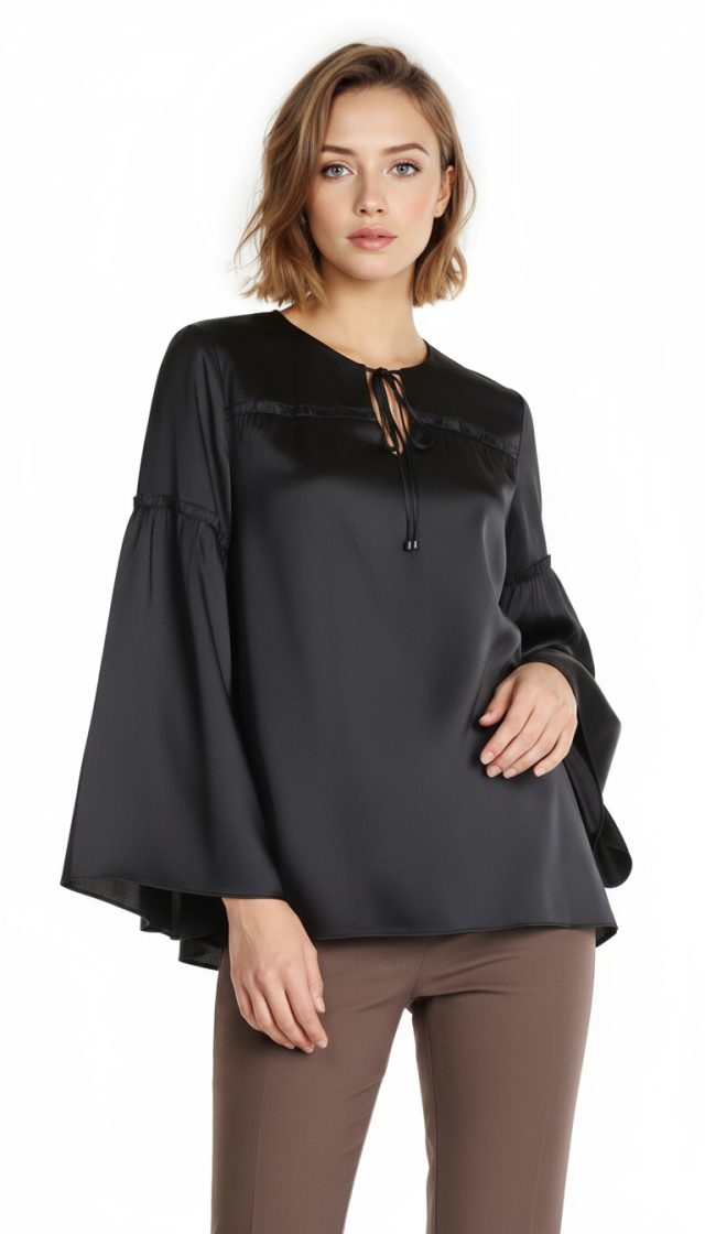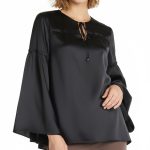 Новая дизайнерская шелковая блуза Catherine Malandrino глубокого черного цвета. Свободный покрой «трапеция» с расклешенным рукавом, присборенной кокеткой и подвязкой на кантик по горловине. В составе: 95% натуральный шелк, 5% спандекс — ткань экстра качества: плотная, мягкая, с великолепным шелковистым блеском. Состояние — новое, с фирменной биркой Catherine Malandrino. Цена на бирке — 188$ (!).