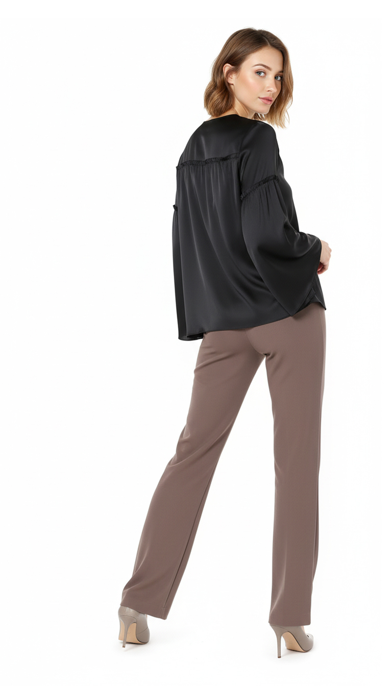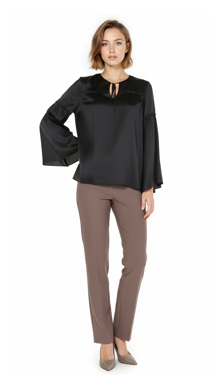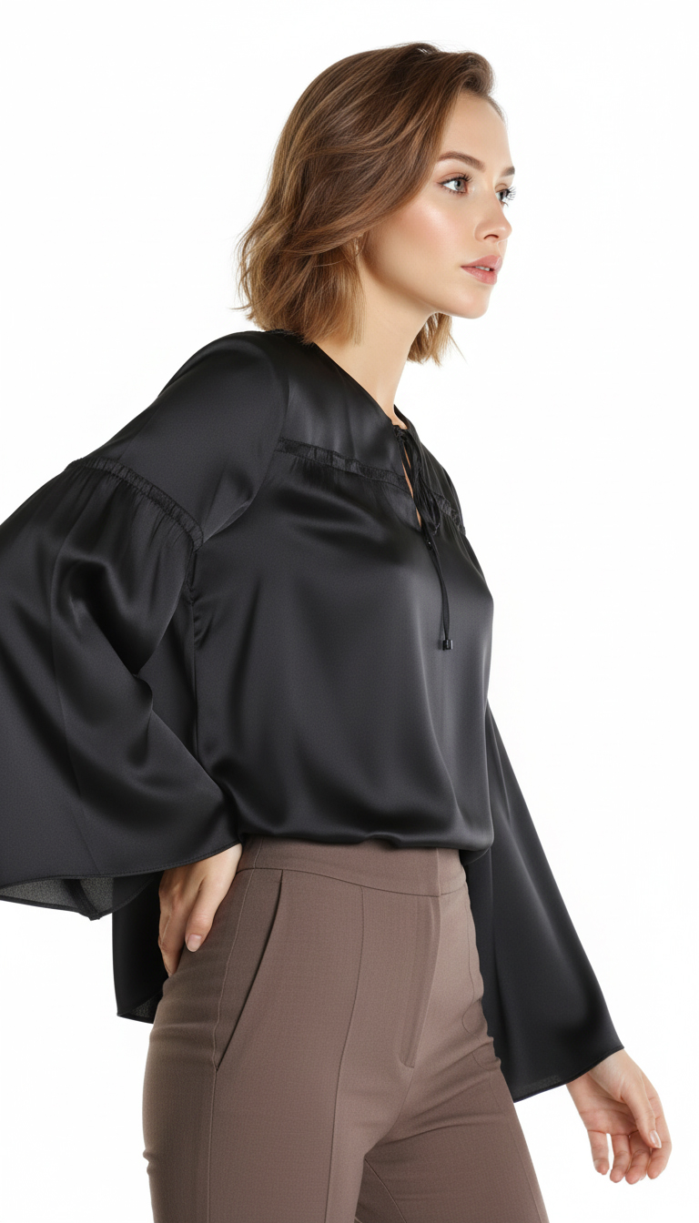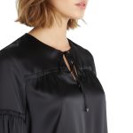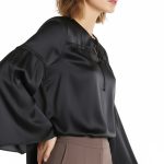 Новая дизайнерская шелковая блуза Catherine Malandrino глубокого черного цвета. Свободный покрой «трапеция» с расклешенным рукавом, присборенной кокеткой и подвязкой на кантик по горловине. В составе: 95% натуральный шелк, 5% спандекс — ткань экстра качества: плотная, мягкая, с великолепным шелковистым блеском. Состояние — новое, с фирменной биркой Catherine Malandrino. Цена на бирке — 188$ (!).