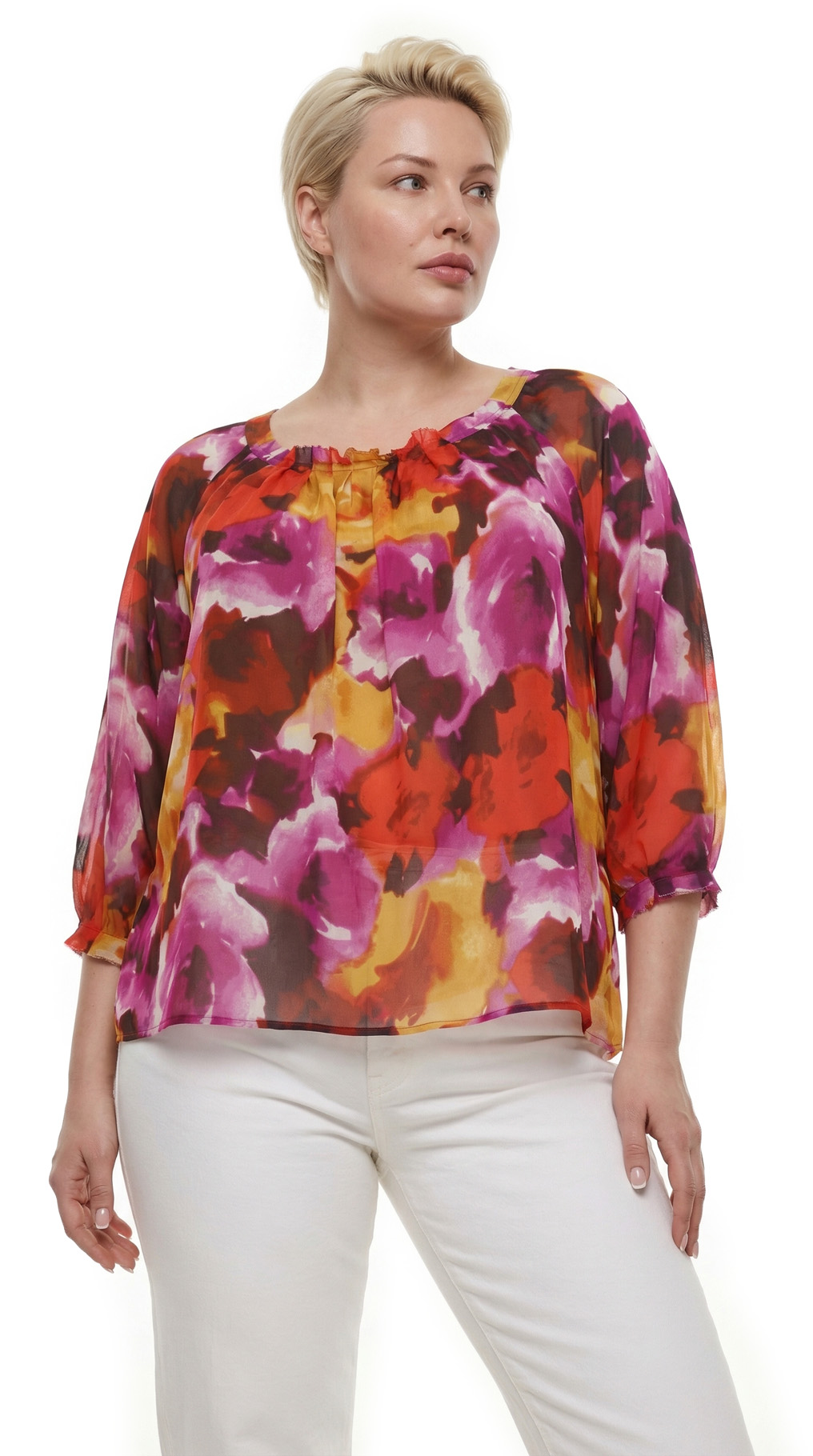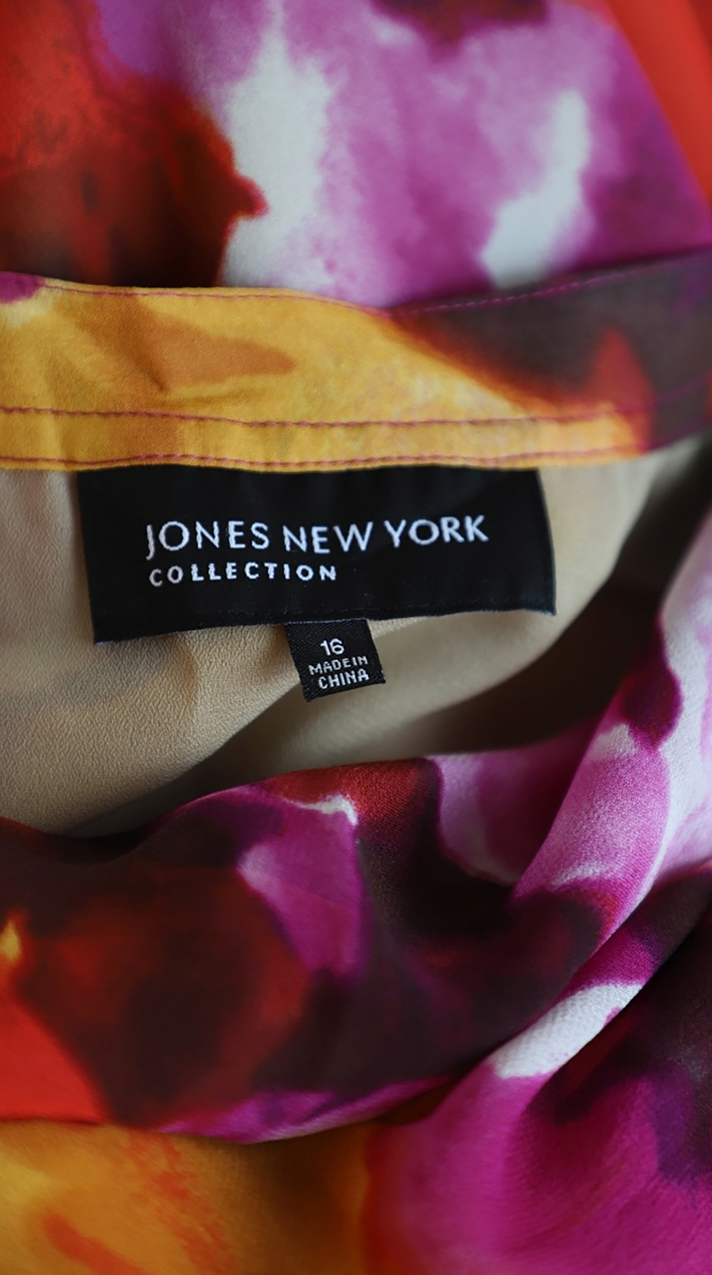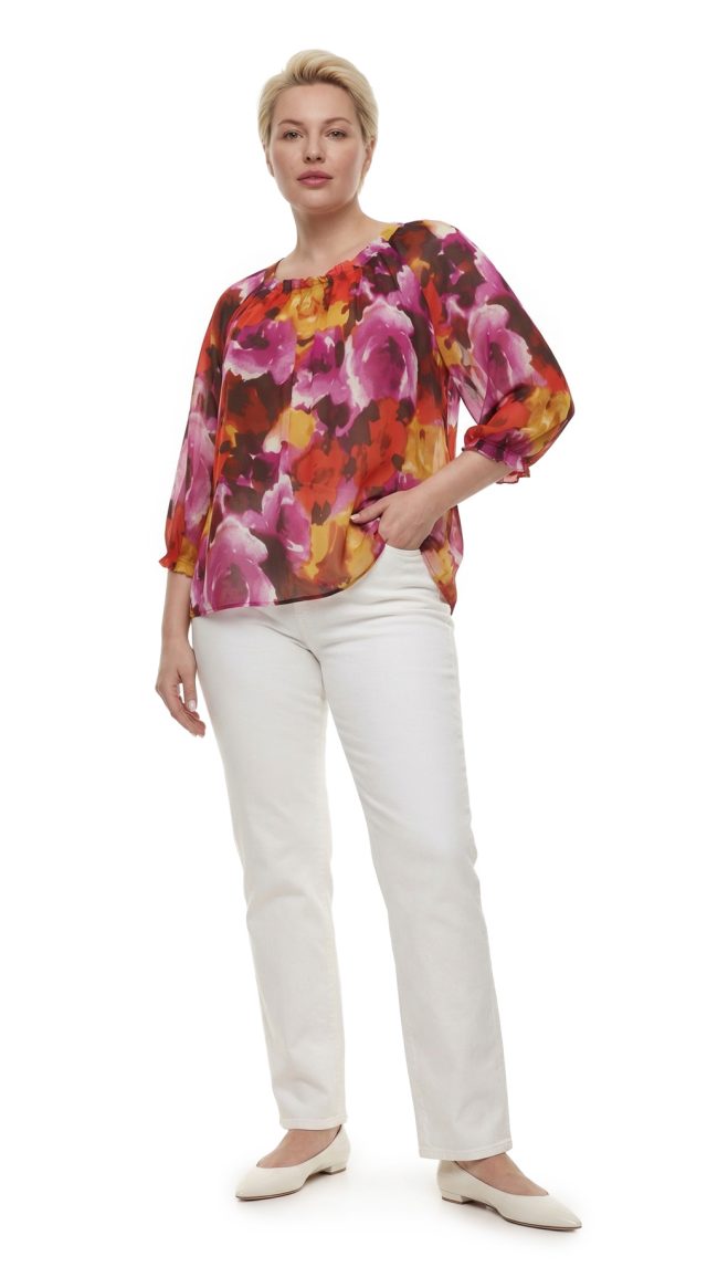Великолепная шелковая блуза американского бренда Jones New York с яркими цветочными мотивами в оттенках красного, жёлтого и фиолетового. Свободный двухслойный прямой фасон из легкого полупрозрачного шифона по более плотному светло-бежевому шифону. Рукав 3/4 с манжетой с оборкой. Скругленный вырез горловины с красивыми складочками защипами по центру. В составе: 100 шелк (верх, подклад). Состояние — отличное — есть пара мелких затяжек, незаметных при ярком рисунке.