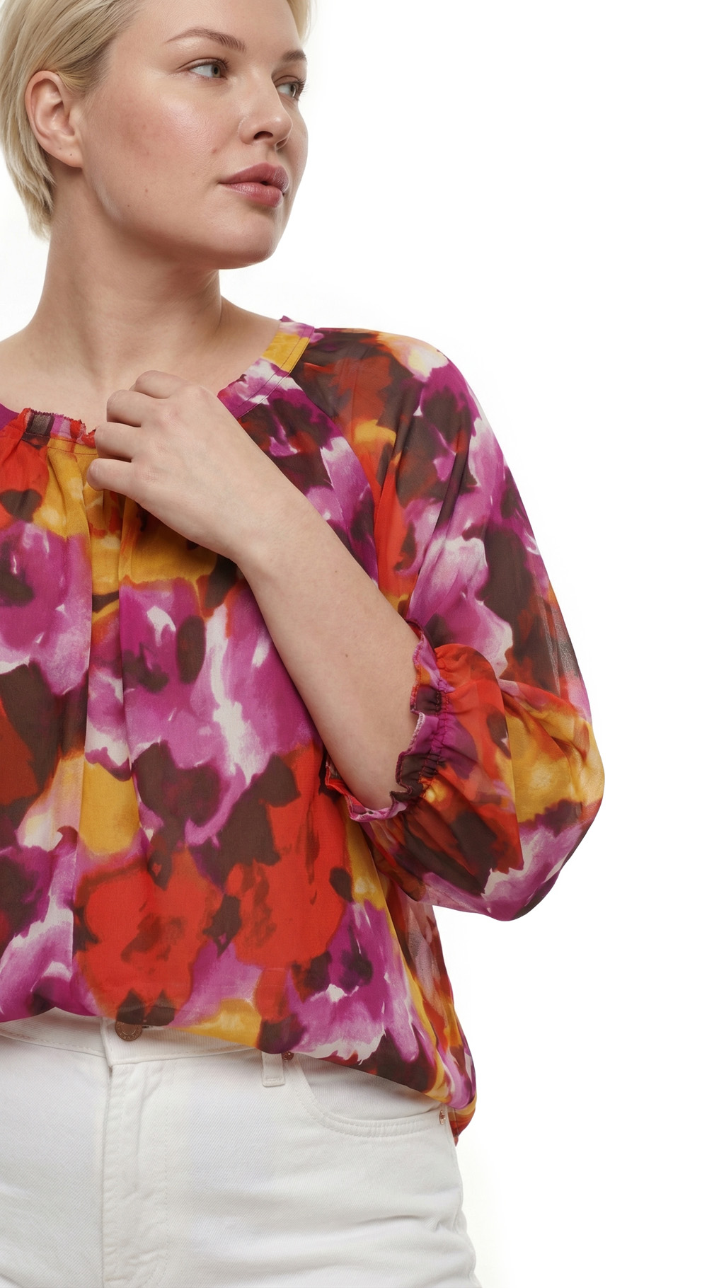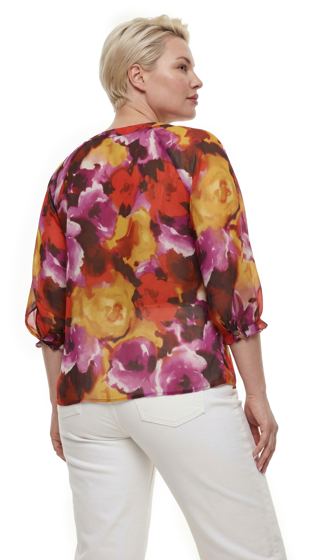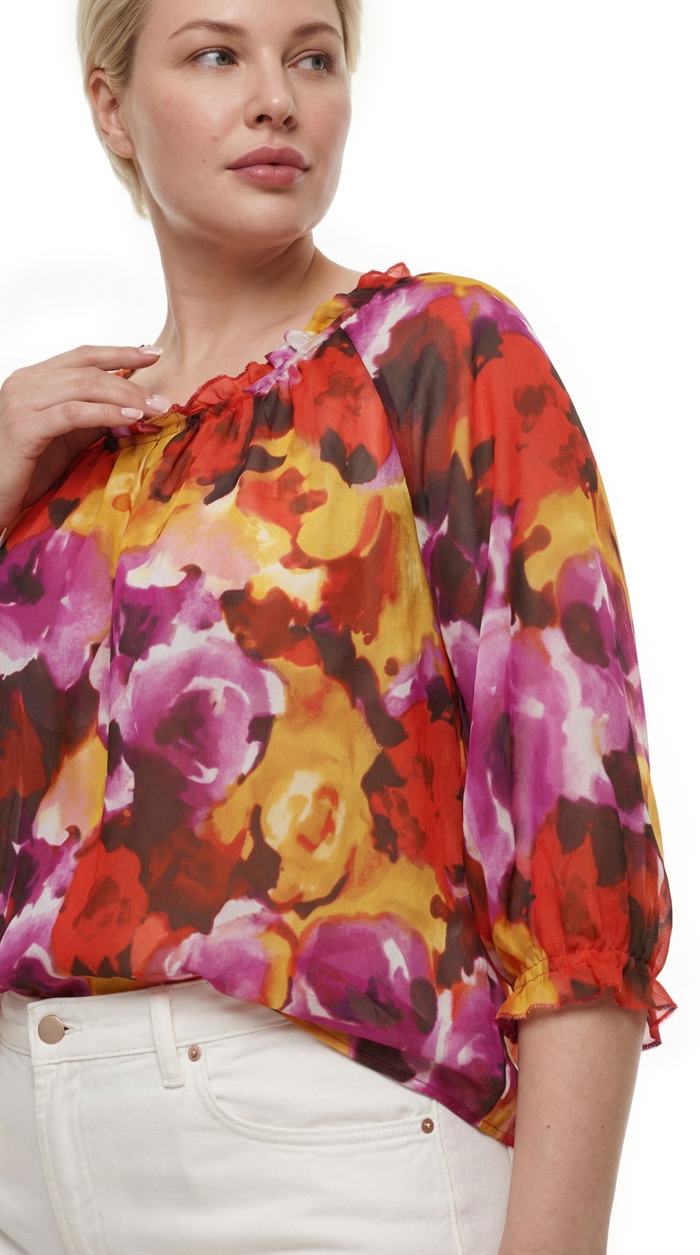 Великолепная шелковая блуза американского бренда Jones New York с яркими цветочными мотивами в оттенках красного, жёлтого и фиолетового. Свободный двухслойный прямой фасон из легкого полупрозрачного шифона по более плотному светло-бежевому шифону. Рукав 3/4 с манжетой с оборкой. Скругленный вырез горловины с красивыми складочками защипами по центру. В составе: 100 шелк (верх, подклад). Состояние — отличное — есть пара мелких затяжек, незаметных при ярком рисунке.
