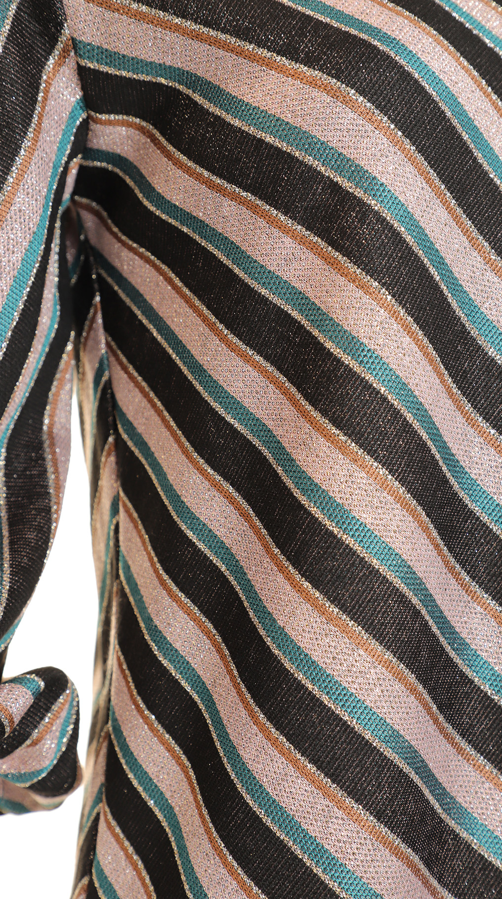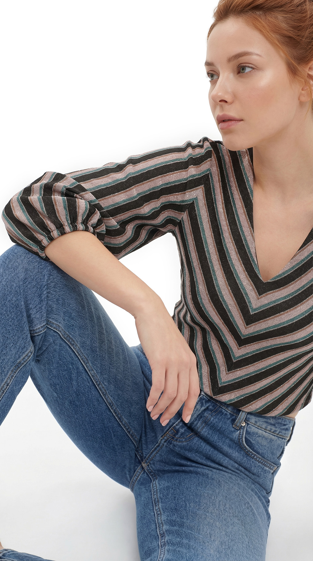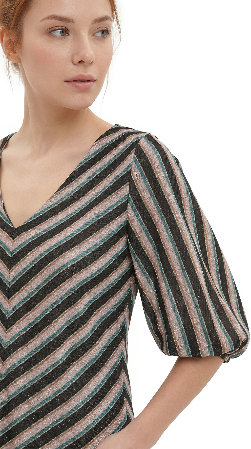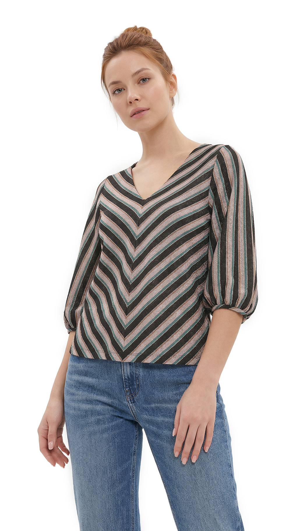 Оригинал. Новая яркая трикотажная блуза концерна Max Mara (линия ‘S Max Mara) в полоску черных, серебристых, бирюзовых и горчичных тонов. Приталенный фасон трапеция с объемным рукавом фонарик, длиной 3/4 и V-вырезом горловины. В составе: 81% вискоза, 12% полиамид, 6% п.э, 1% эластан — ткань мягкая, приятная к телу, с легким серебристым блеском. Пошив — Европа (Румыния). Состояние — новое, из аутлета концерна Max Mara (ярлык бренда надрезан — это политика аутлета).