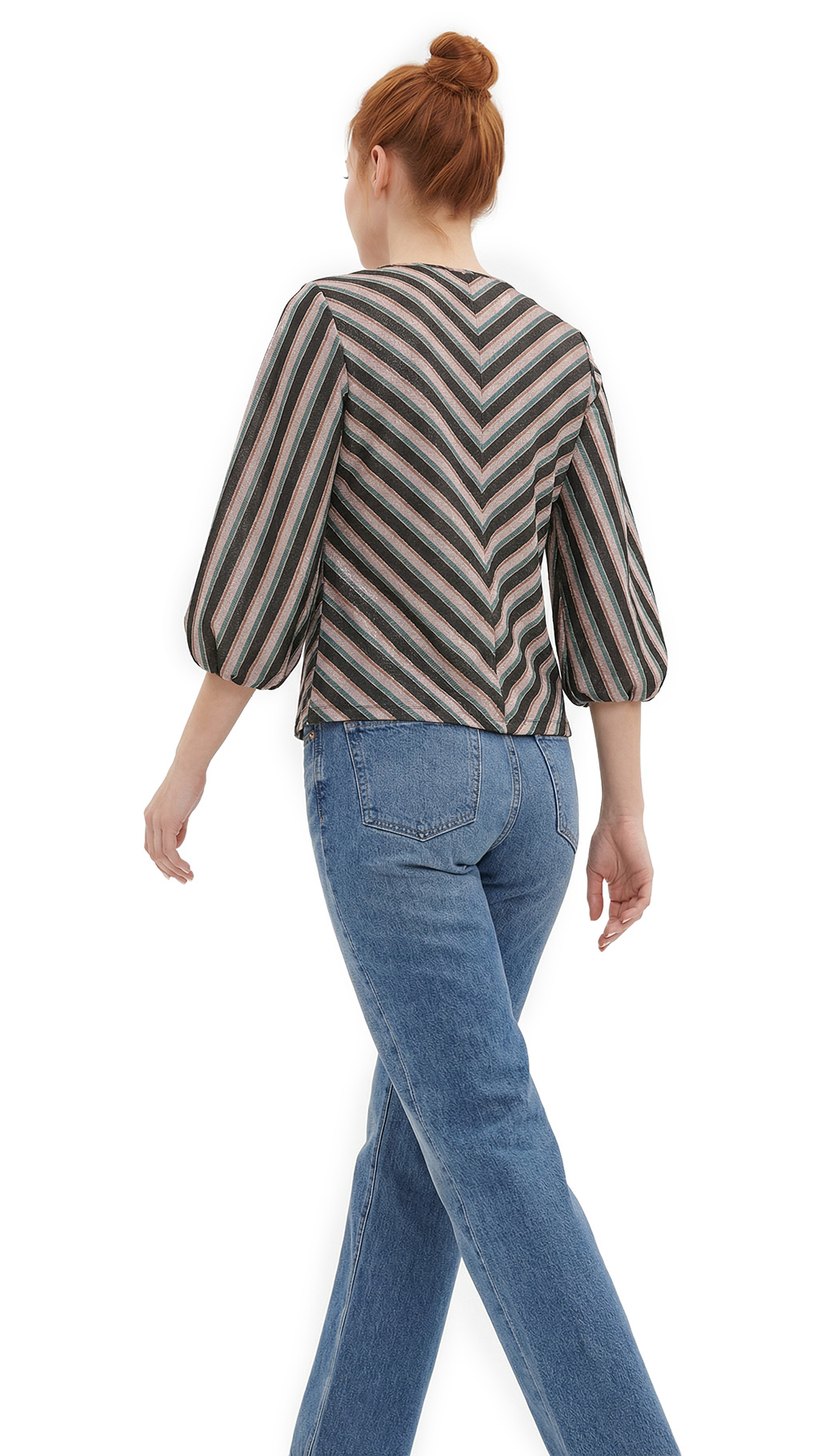 Новая яркая трикотажная блуза в полоску Max Mara ('S Max Mara) фасона трапеция с объемным рукавом фонарик, длиной 3/4 и V-вырезом горловины.