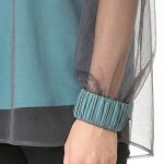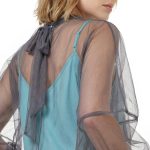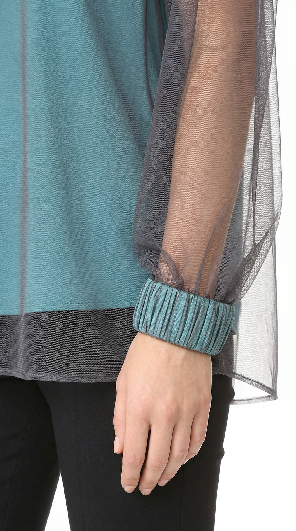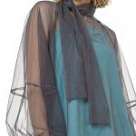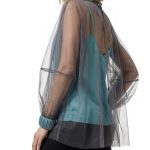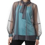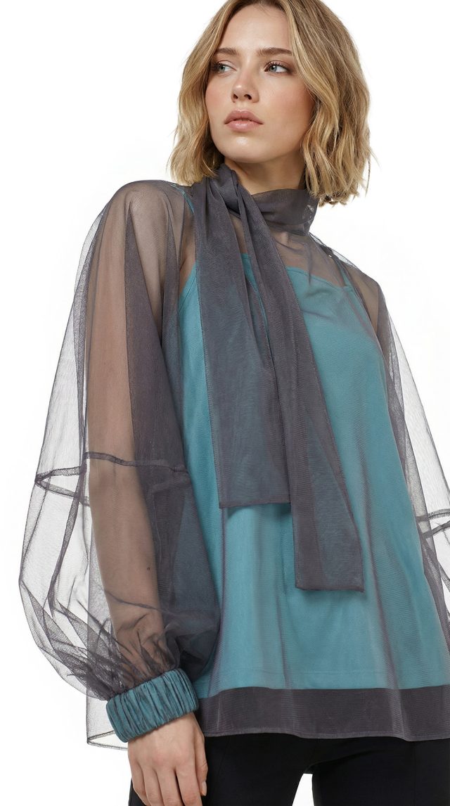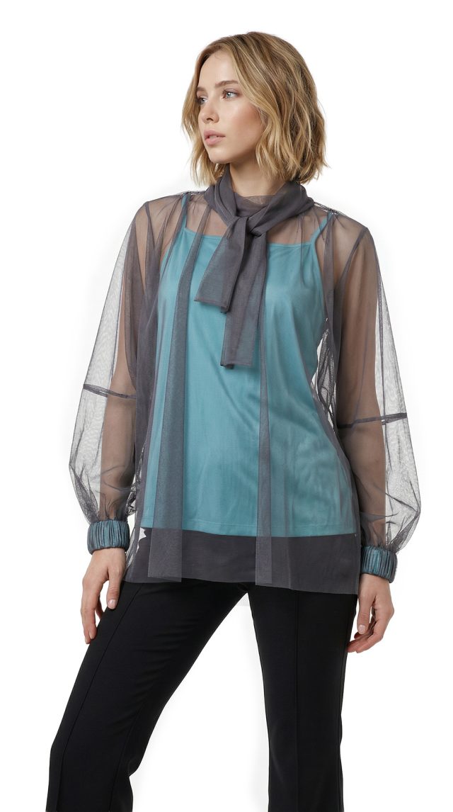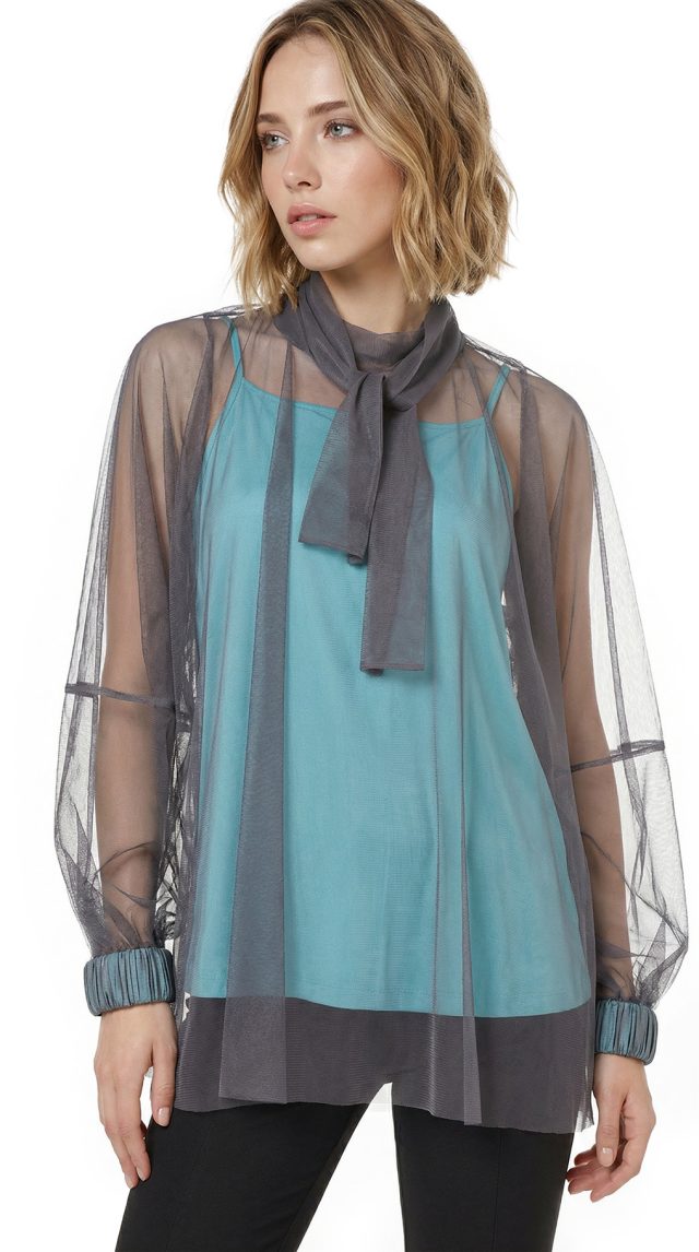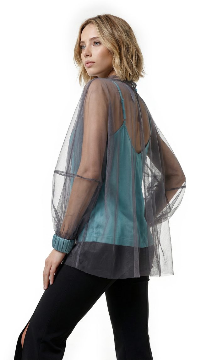 Оригинал. Новая эффектная двухслойная блуза концерна Max Mara (линия Studio) из темно-серой сеточки по топику бирюзового цвета. Свободный фасон с объемным рукавом реглан и воротничком стойка с длинными клинышками, которые можно обвязать вокруг шеи или подвязать в элегантный бант. Вырез «капелька» по спинке с застежкой на пуговку. Широкая манжета на резинке в тон топика. Топик — трикотажный, на регулируемых нонких бретелях. В составе: 100% п.э (сеточка и топик) — ткань легкая, воздушная, мягкая, эластичная, приятная в носке. Состояние — новое, из аутлета концерна Max Mara (ярлык бренда надрезан — это политика аутлета).