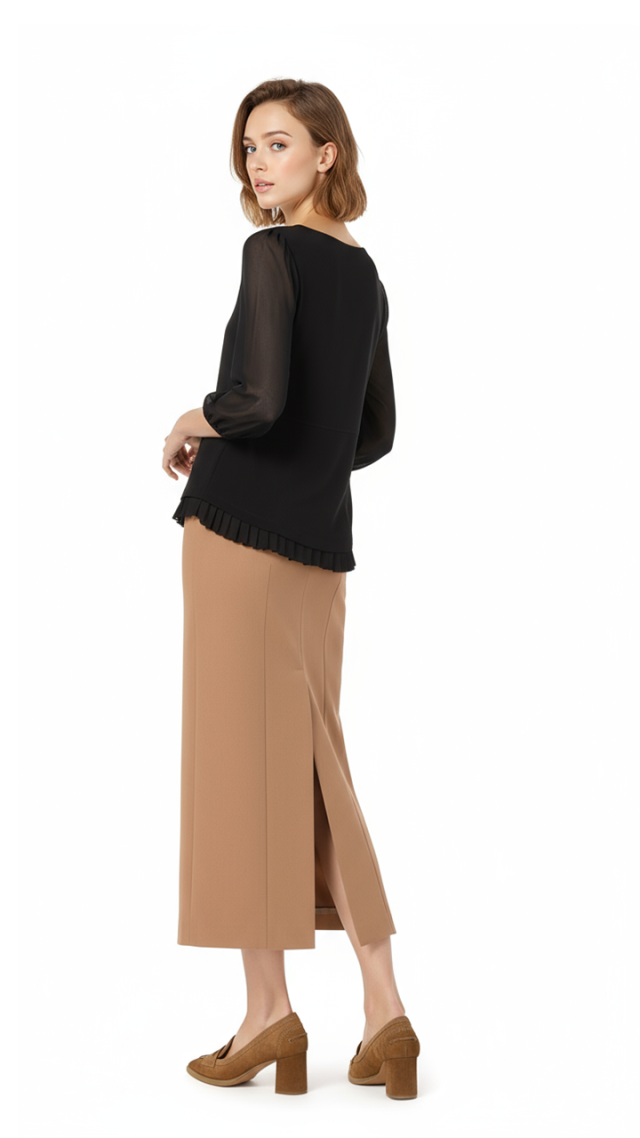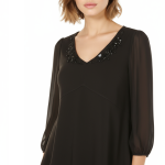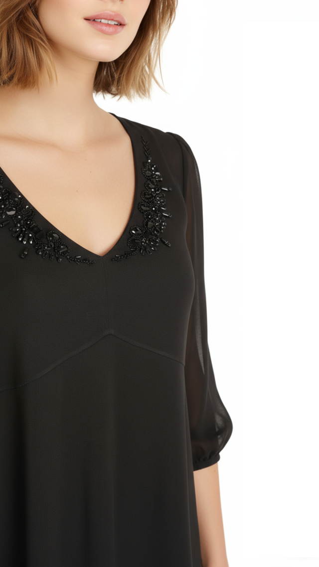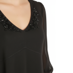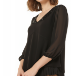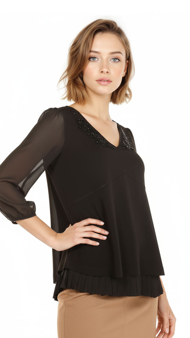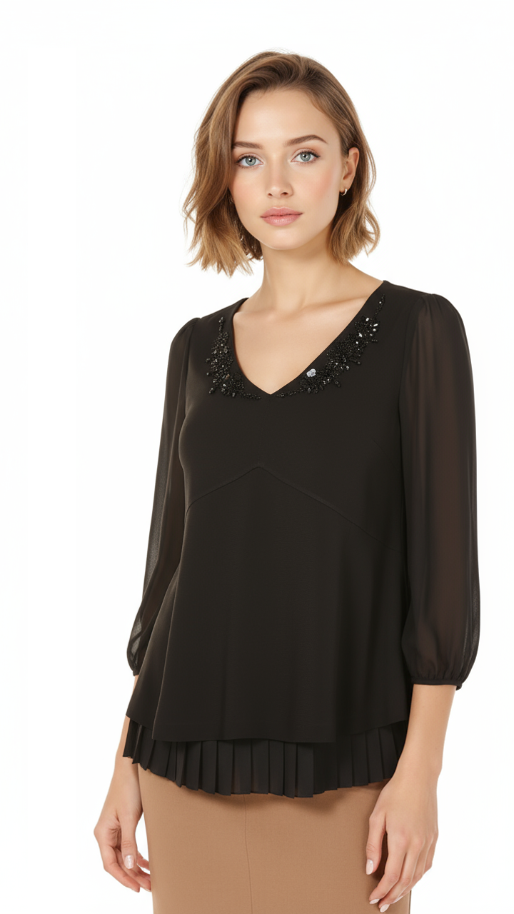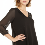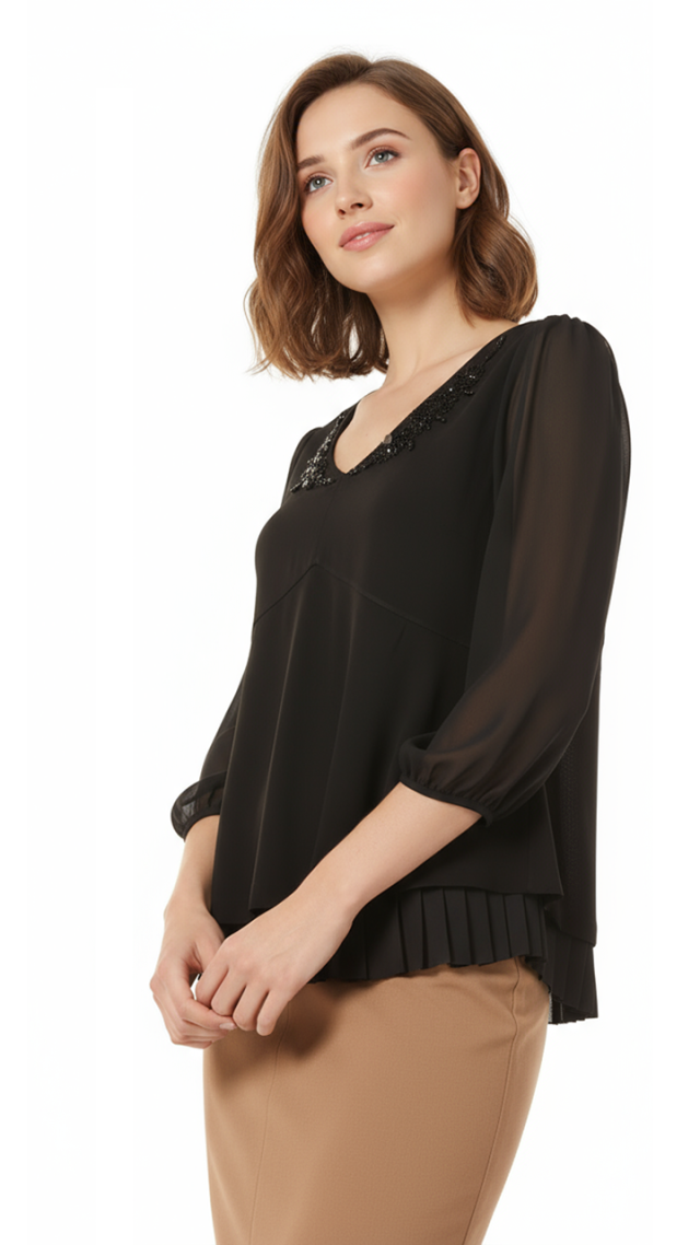 Оригинал. Новая блуза концерна Max Mara (линия Studio) черного цвета с декороом по линии горловины. Свободный двухслойный фасон «трапеция» из плотного трикотажного топа поверх легкого шифонового подклада со складками внизу. Полупрозрачный рукав длиной 3/4. Пошив — Италия. В составе: 98 вискоза, 2% эластан (топ), п.э (подклад) — ткань экстра качества: мягкая, приятная к телу, эластичная. Состояние — новое, из аутлета концерна MaxMara (ярлык бренда надрезан — это политика аутлета).