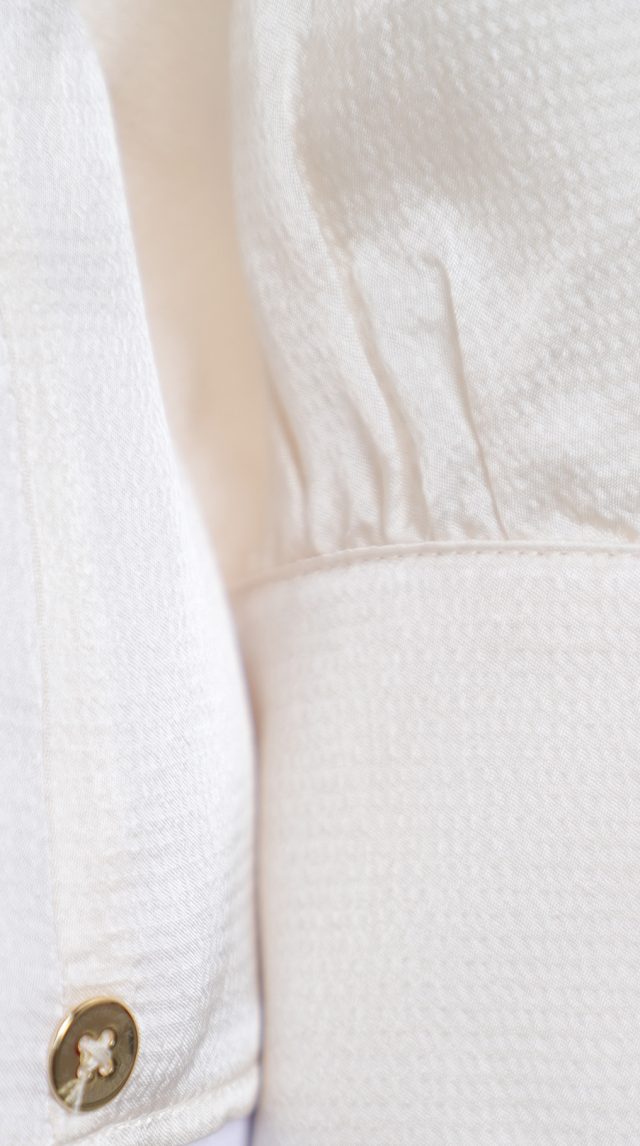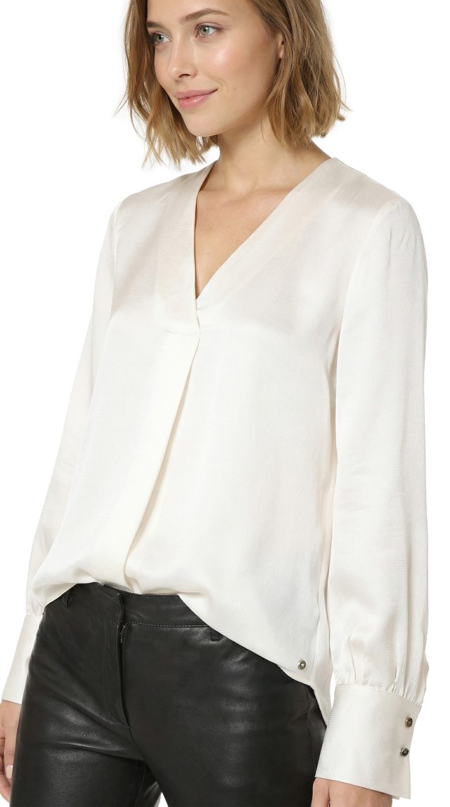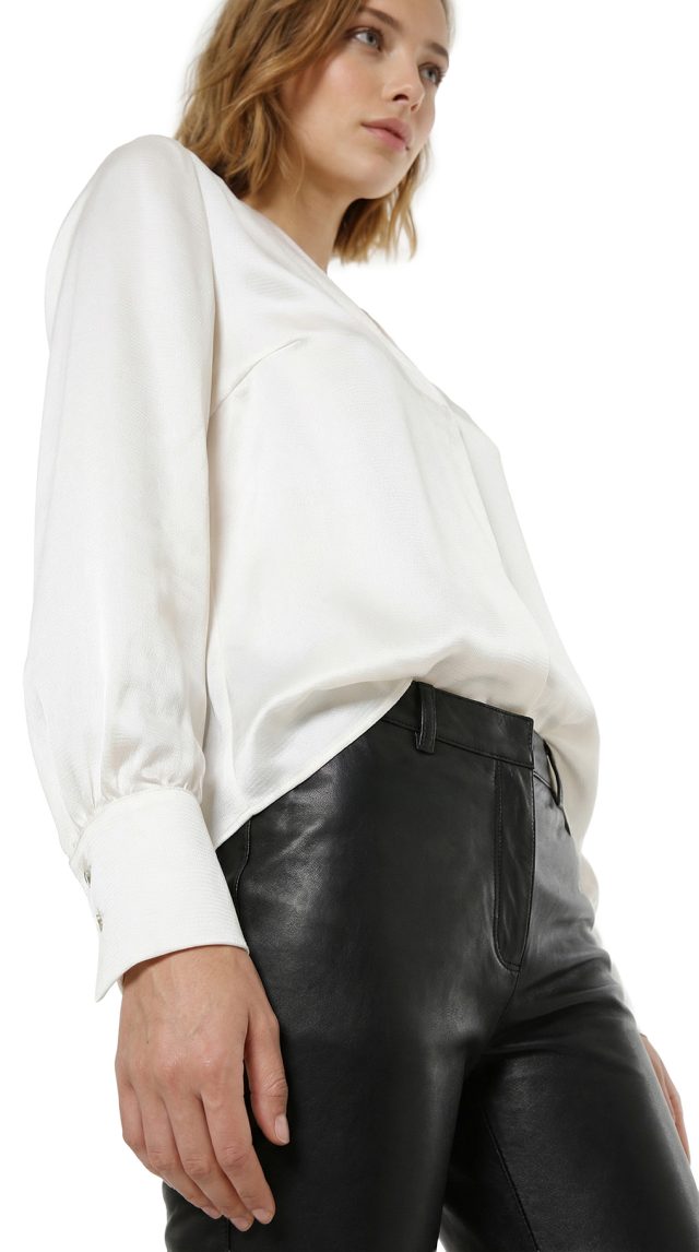 Новая блузка итальянского концерна Max Mara (линия PennyBlack) молочно-белого цвета. Прямой фасон с V-вырезом горловины и длинным рукавом на широкой манжете, декорированной золотыми пуговками. Изюминка блузы — складочка по переду, придающая фасону легкость и женственность. Фирменный золотой шильдик с гравировкой бренда. Пошив — Молдова. В составе: 100% вискоза: ткань экстра качества: легкая, шелковистая, фактурная. Состояние — новое, с оригинальной биркой PennyBlack.