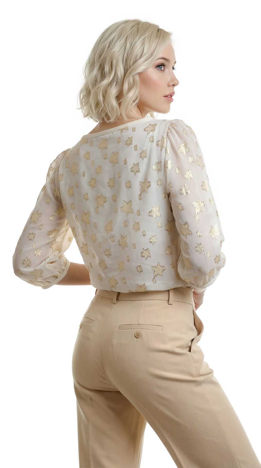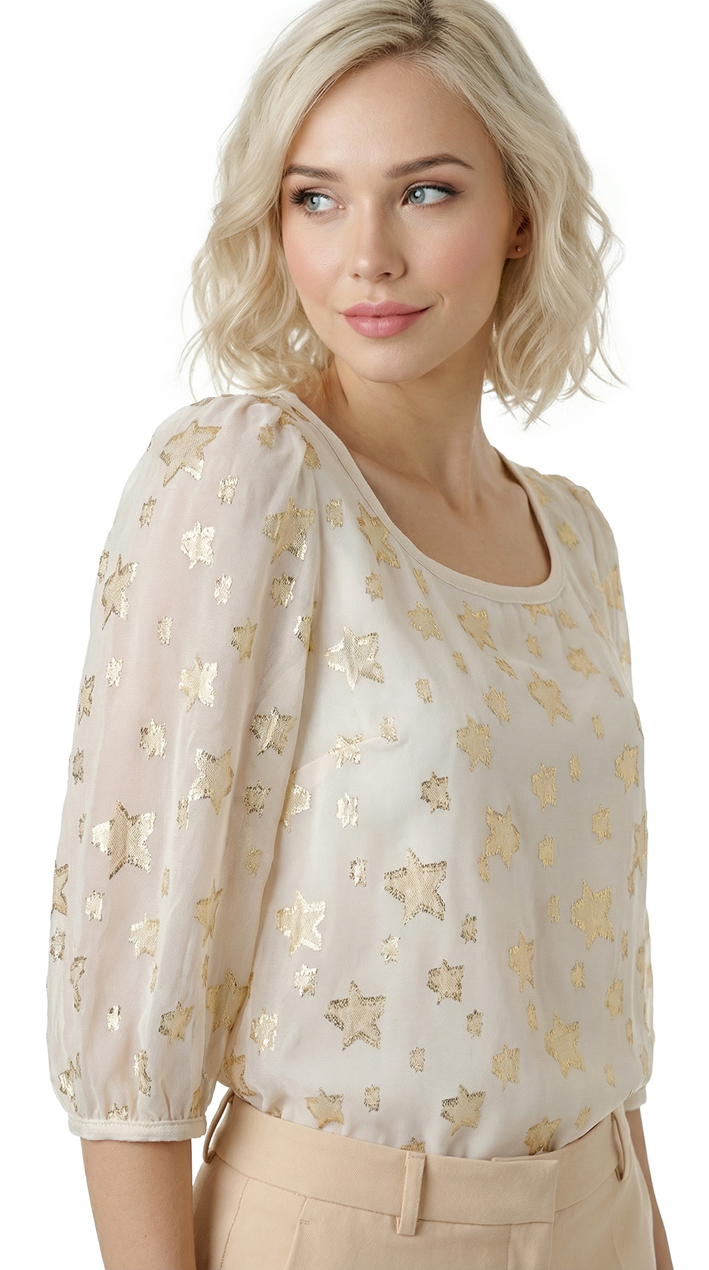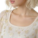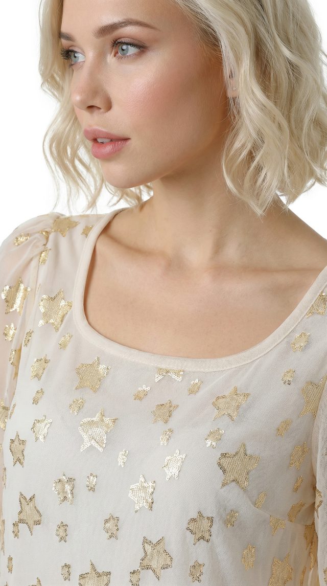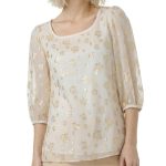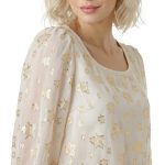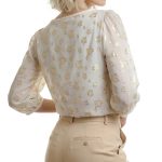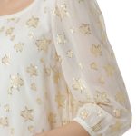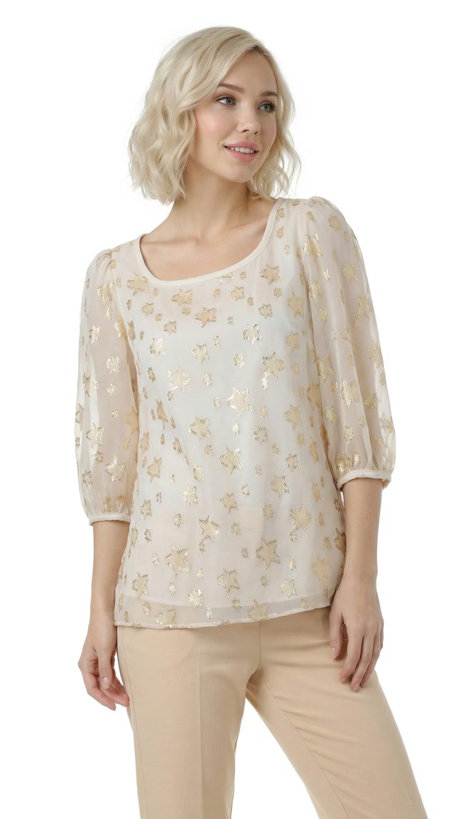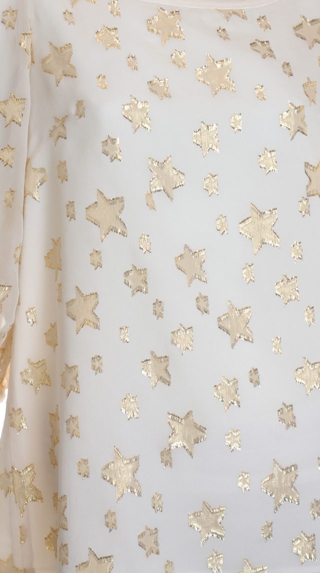 Оригинал. Новая шелковая блуза концерна Max Mara (линия Weekend) молочного цвета со «звездной» золотой вышивкой нитями металлик. Свободный двухслойный крой из шифонового прозрачного верха на нежном подкладе. Объемный рукав «фонарик» (без подклада). Широкая горловина с мягким бархатным кантиком. В составе: 87% натуральный шелк, 13% фибра металлик (верх), п.э (подклад). Пошив — Европа (Болгария). Состояние — новое, из аутлета концерна Max Mara (ярлык бренда надрезан — это политика аутлета).
