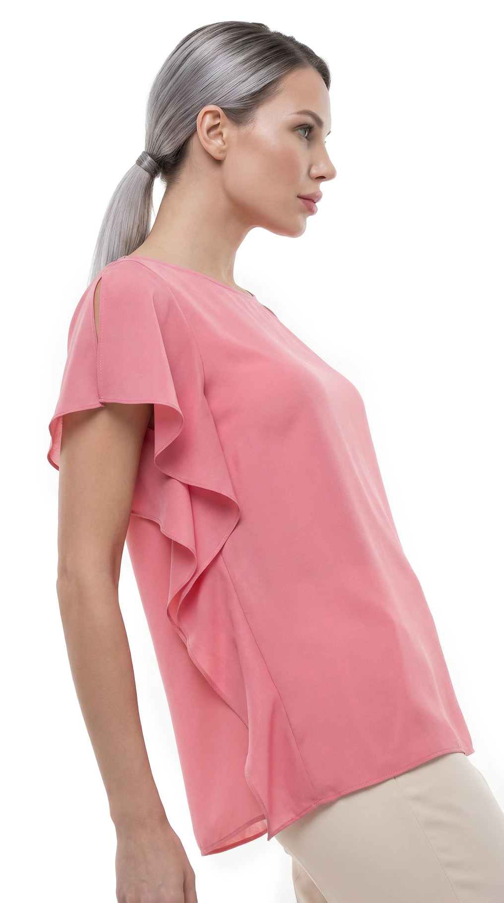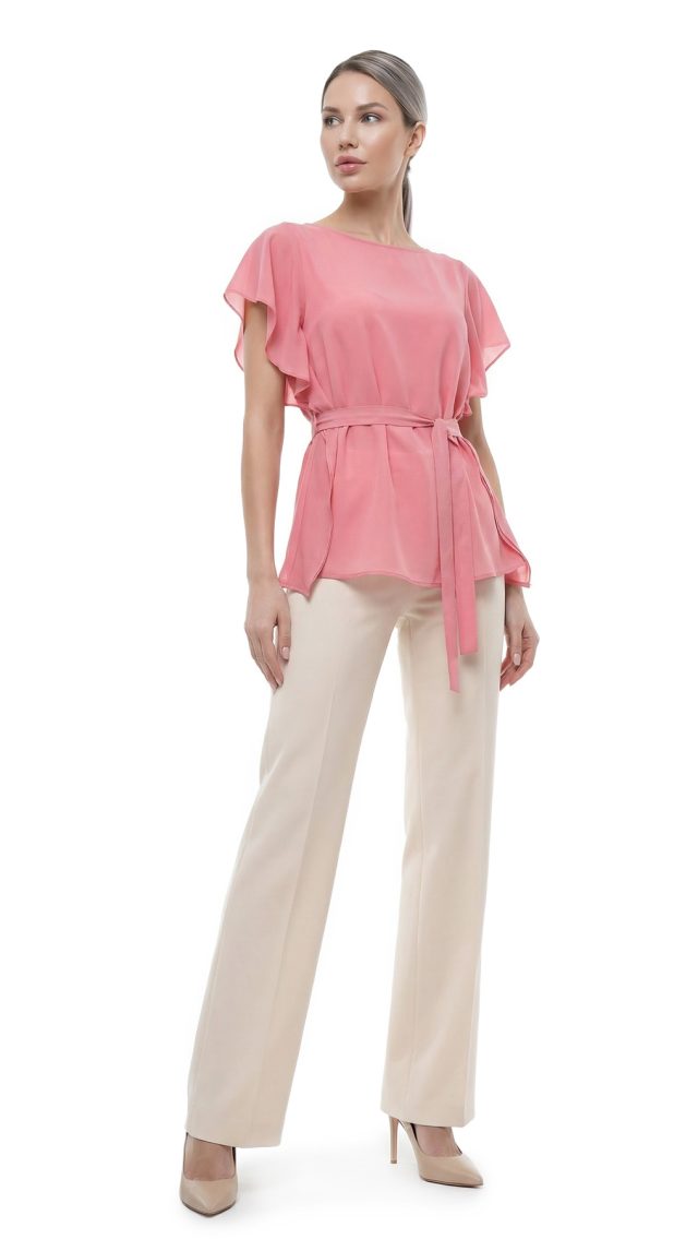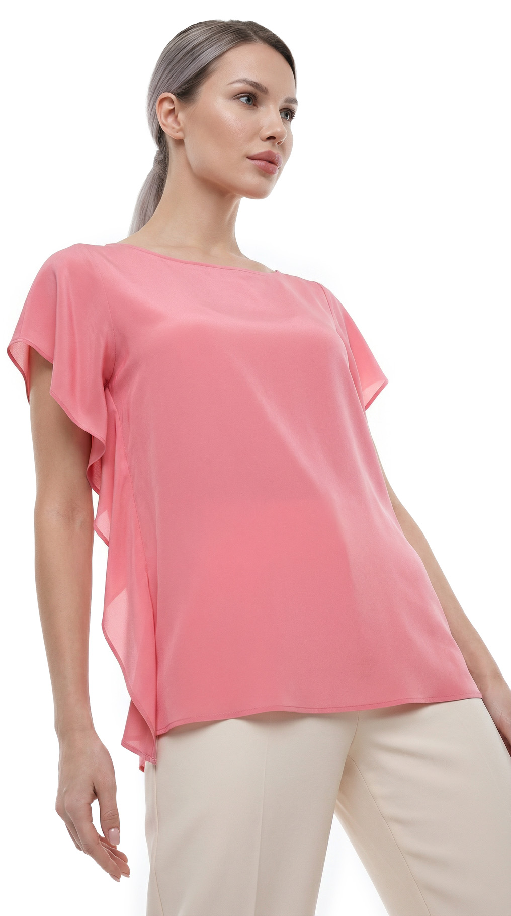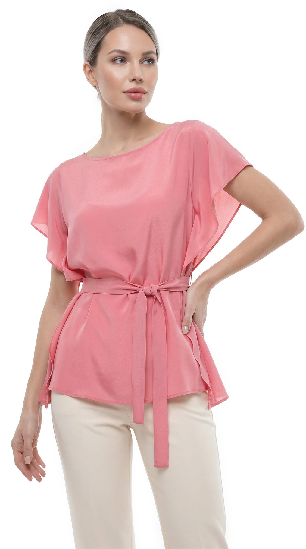 Оригинал. Новая элегантная блуза концерна Max Mara (линия Weekend) нежного цвета пыльной розы. Свободный покрой трапеция, расширяющийся от груди, с воланами по бокам и коротким рукавом с вырезом по линии плеча. Элегантный вырез «лодочка», который визуально удлиняет шею. Пояс в тон ткани, который можно завязать в бант или носить блузу навыпуск. Без застежки. В составе: 100% натуральный шелк премиального качества — легкий, мягкий, приятный к телу, с характерным матовым блеском натурального шелка. Пошив — Европа (Албания). Состояние — новое, из аутлета концерна Max Mara (ярлык бренда надрезан — это политика аутлета).