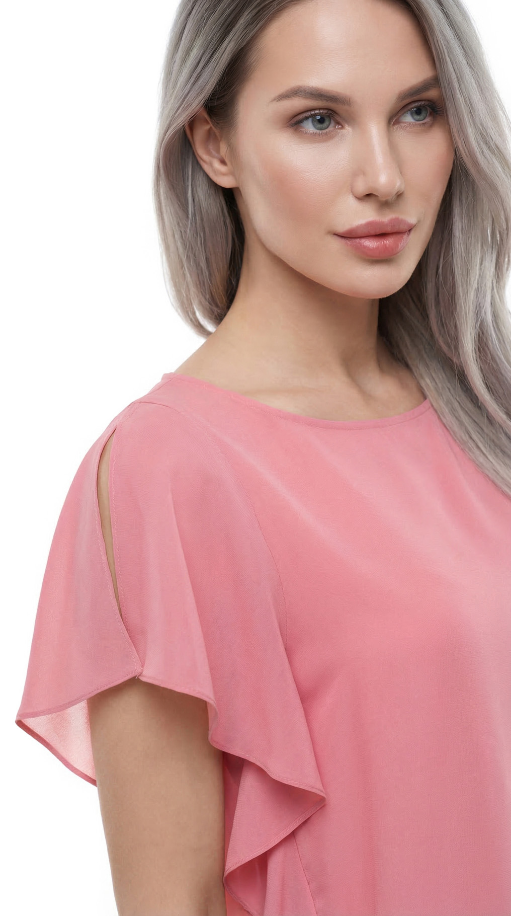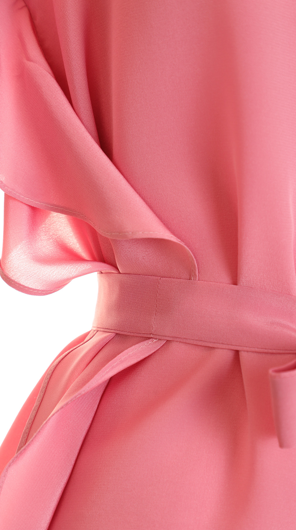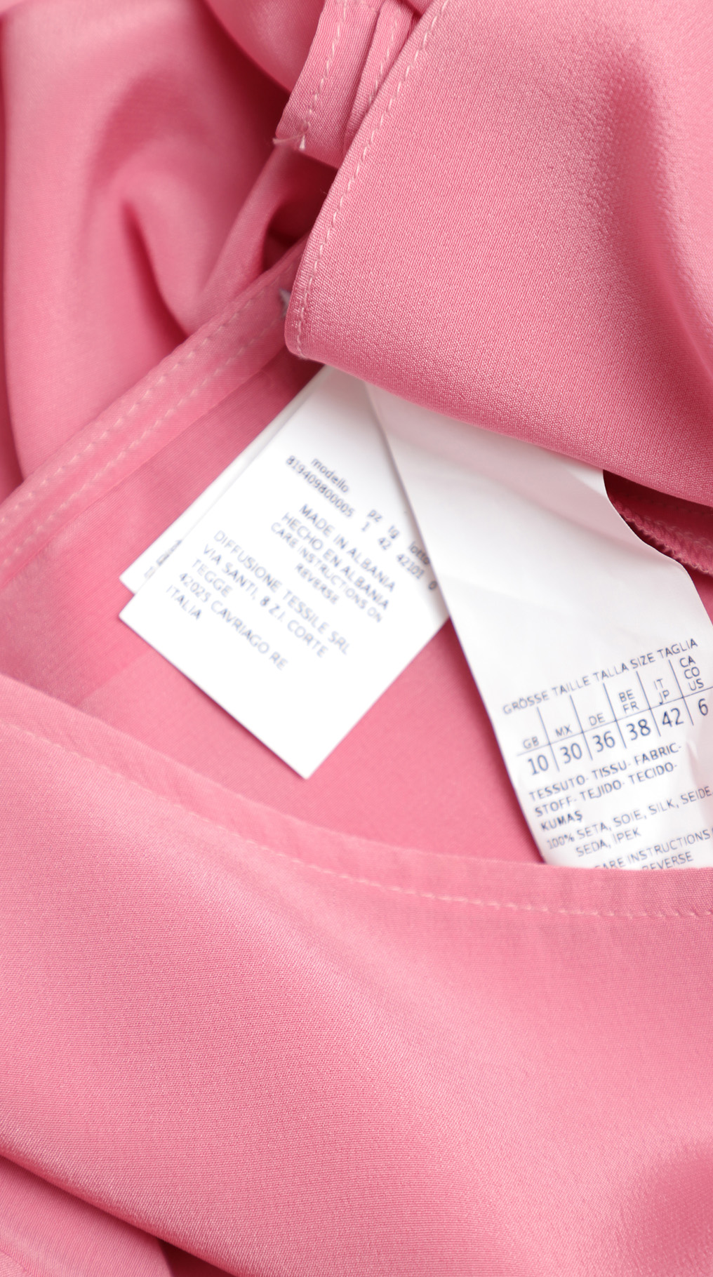 Оригинал. Новая элегантная блуза концерна Max Mara (линия Weekend) нежного цвета пыльной розы. Свободный покрой трапеция, расширяющийся от груди, с воланами по бокам и коротким рукавом с вырезом по линии плеча. Элегантный вырез «лодочка», который визуально удлиняет шею. Пояс в тон ткани, который можно завязать в бант или носить блузу навыпуск. Без застежки. В составе: 100% натуральный шелк премиального качества — легкий, мягкий, приятный к телу, с характерным матовым блеском натурального шелка. Пошив — Европа (Албания). Состояние — новое, из аутлета концерна Max Mara (ярлык бренда надрезан — это политика аутлета).