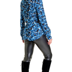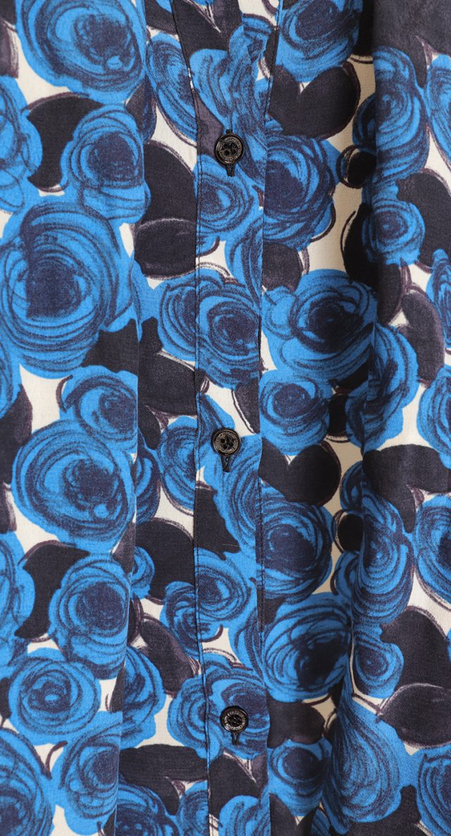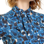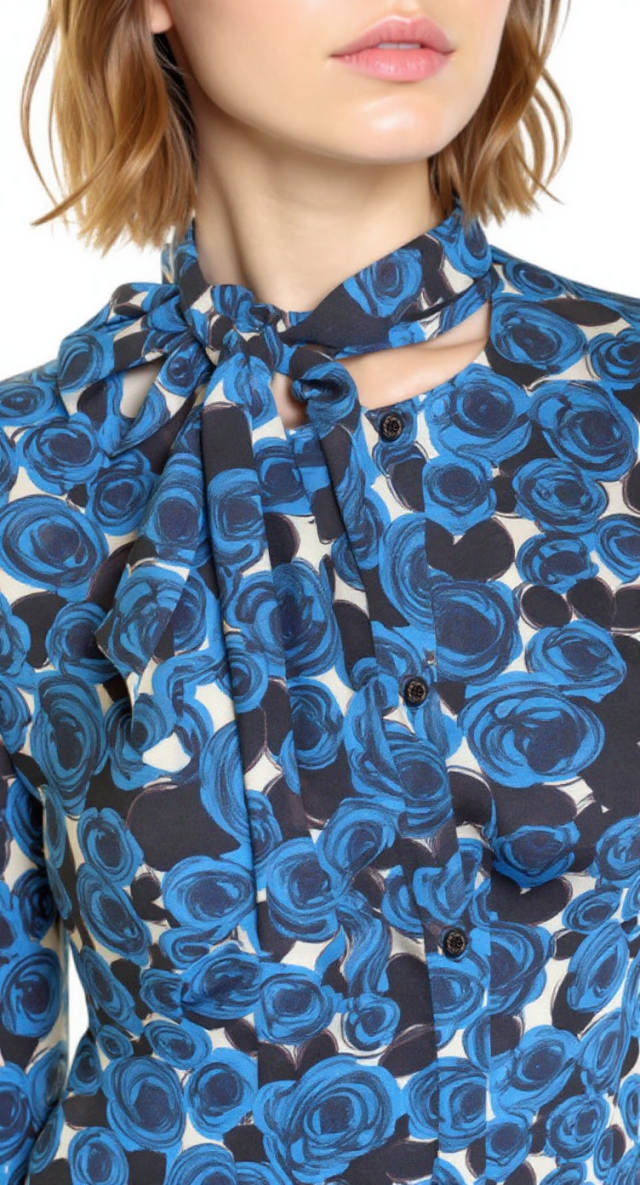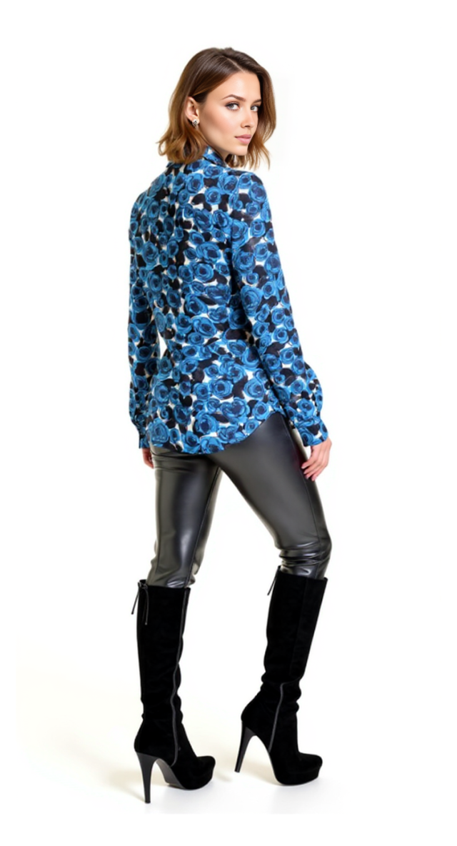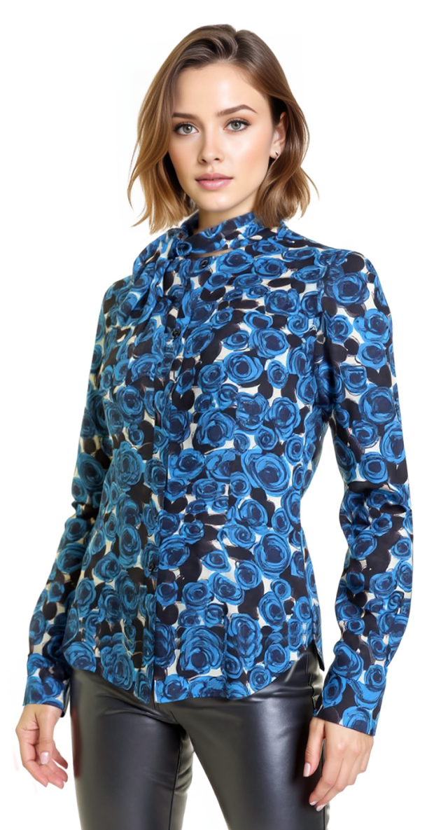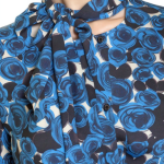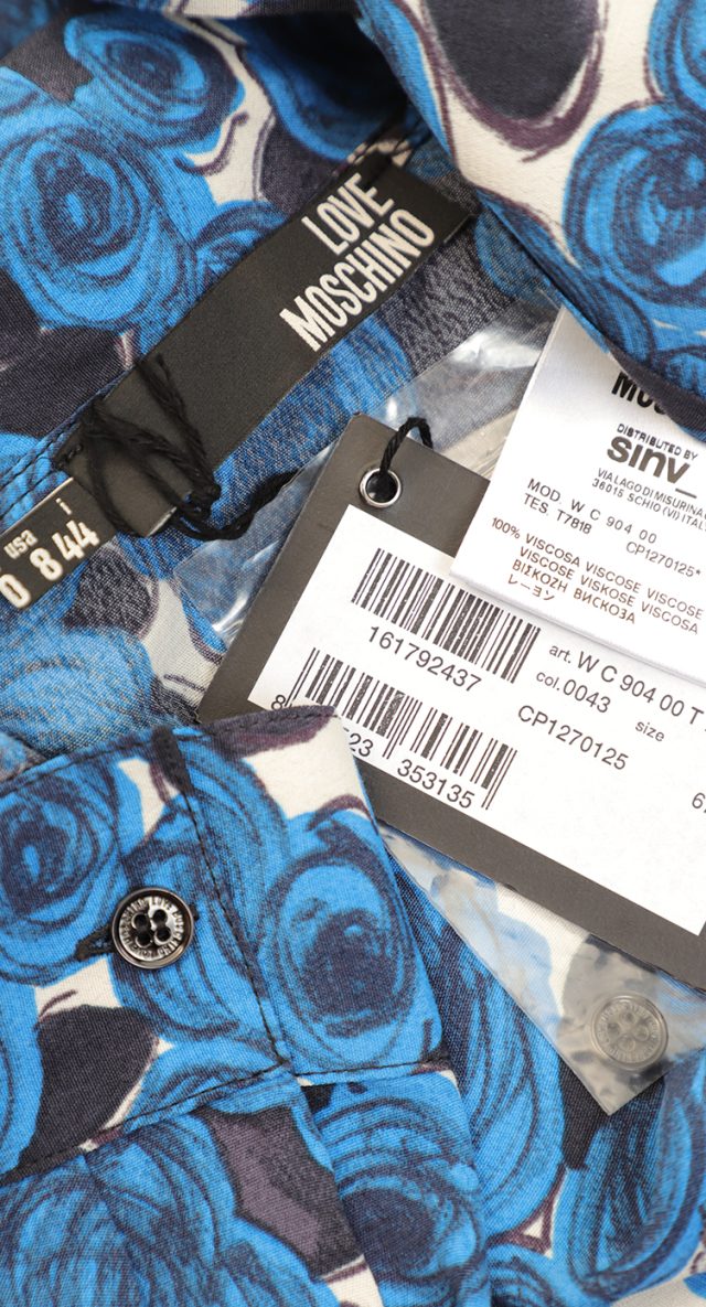 Новая блуза премиального итальянского бренда Moschino (коллекция Love Moschino) с небесно-голубым флористическим принтом на черном фоне. Женственный полу-приталенный фасон со скругленной горловиной и удлиненными клинышками, которые можно подвязать в бант. Длинный рукав с широкой манжетой. Застежка на брендированные пуговки. Пошив — Италия. В составе: 100% вискоза — ткань экстра качества: средней плотности, очень мягкая и шелковистая. Состояние — новое, с оригинальной биркой Love Moschino.
