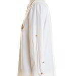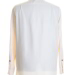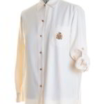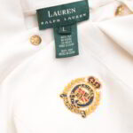 Фирменная блуза Ralph Lauren нежного молочного цвета из 100% натурального шелка крепе — ткань плотная, фактурная «в рубчик». Накладной кармашек на груди с золотой вышивкой лейбла Ralph Lauren. Застежка на золотые пуговки с гербовой гравировкой. Длинный приспущенный рукав, отворачиваемый в 3/4 на пуговку. Прямой рубашечный покрой. Воротничок «стойка». Длина ниже ягодиц. Стильный вариант на любое время года. Состояние — идеальное, как новое, после чистки. Из гардероба российской знаменитости. Эксклюзив, в единственном экземпляре.
