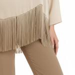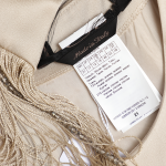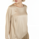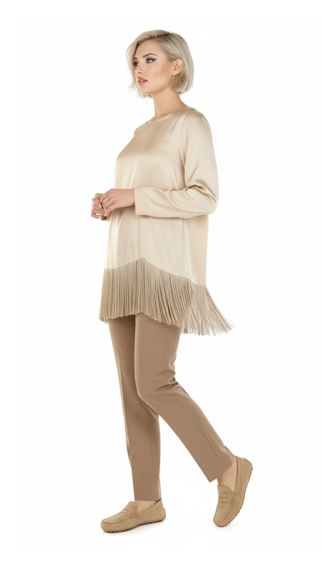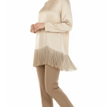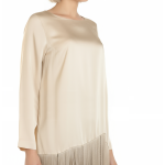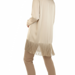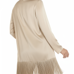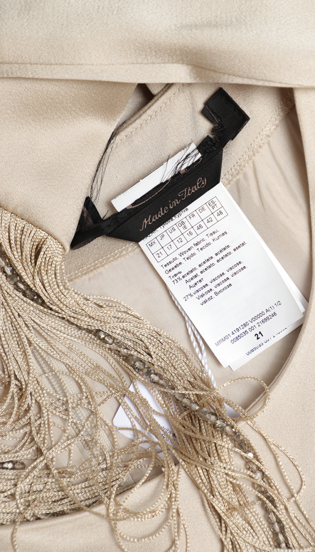 Новая блуза туника концерна Max Mara (линия Marina Rinaldi) светло-бежево-кремового цвета. Свободный прямой удлиненный фасон с длинным рукавом и бахромой, декорированной стразами. Застежка по спинке на молнию. Элегантное дополнение к юбочке или брючкам. В составе: 73% шелковый триацетат, 27% високоза — ткань экстра качества: средней плотности, шелковистая, с перламутровым отливом. Пошив — Италия. Состояние — новое, из аутлета концерна Max Mara (ярлык бренда надрезан — это политика аутлета).