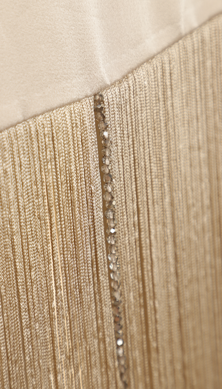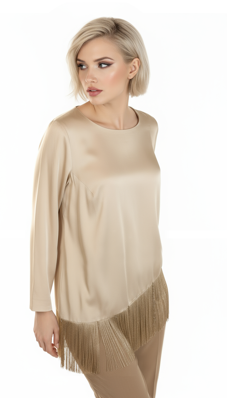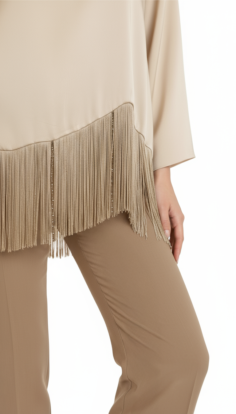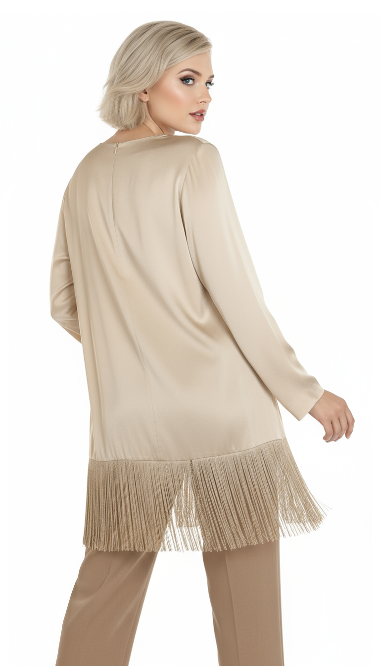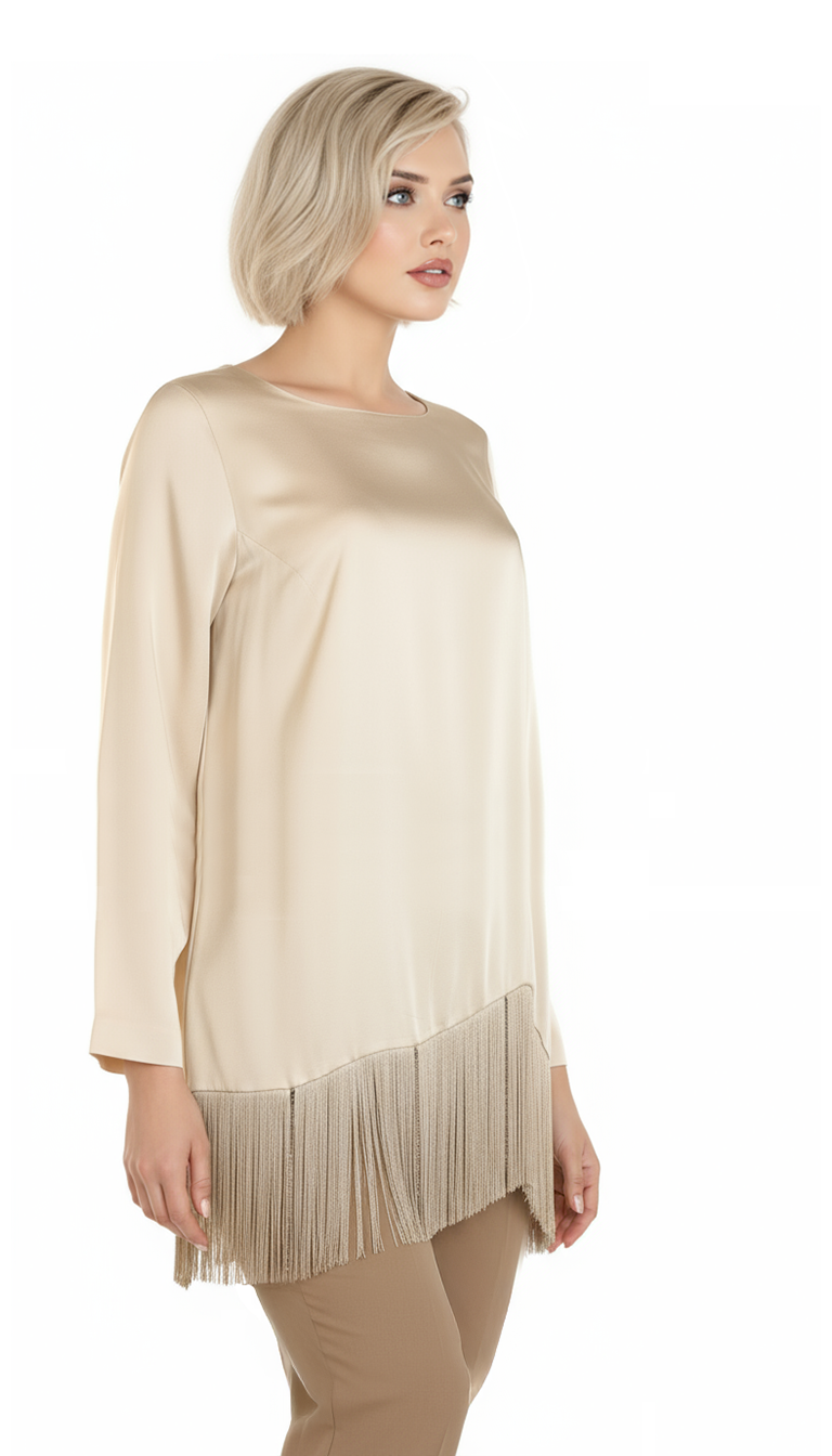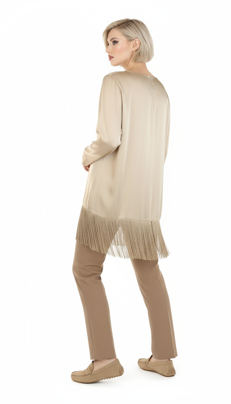 Новая блуза туника концерна Max Mara (линия Marina Rinaldi) светло-бежево-кремового цвета. Свободный прямой удлиненный фасон с длинным рукавом и бахромой, декорированной стразами. Застежка по спинке на молнию. Элегантное дополнение к юбочке или брючкам. В составе: 73% шелковый триацетат, 27% високоза — ткань экстра качества: средней плотности, шелковистая, с перламутровым отливом. Пошив — Италия. Состояние — новое, из аутлета концерна Max Mara (ярлык бренда надрезан — это политика аутлета).