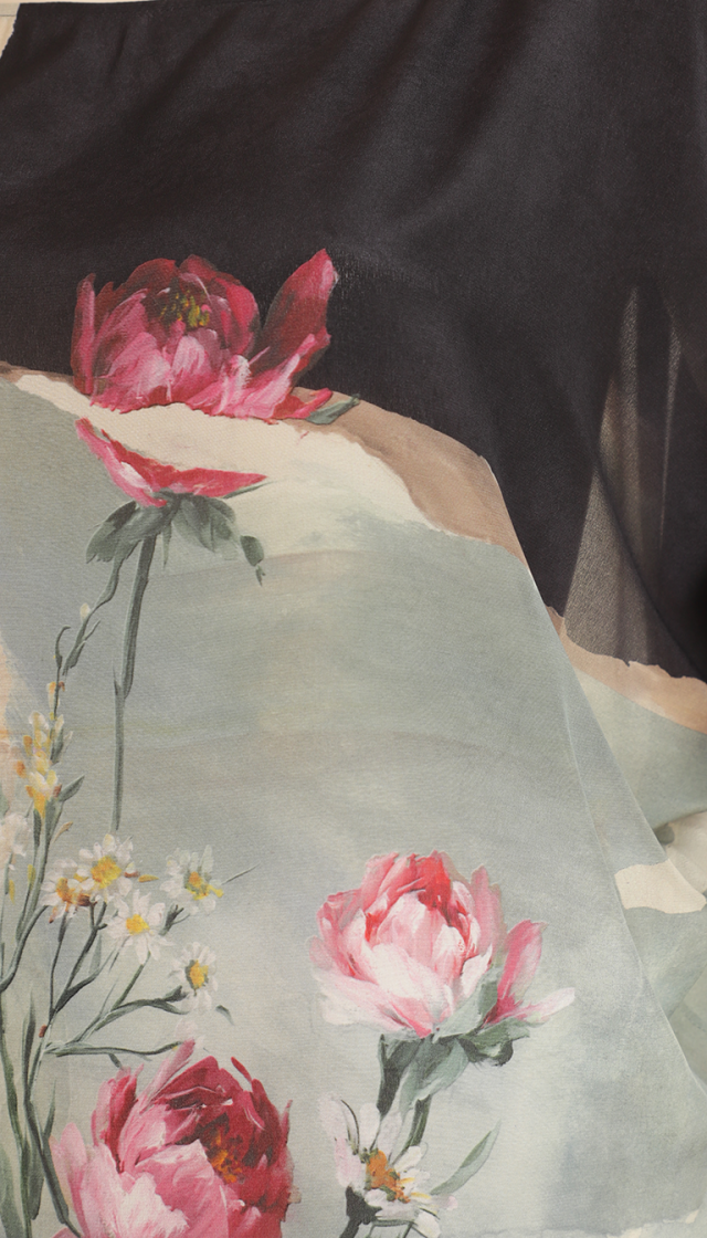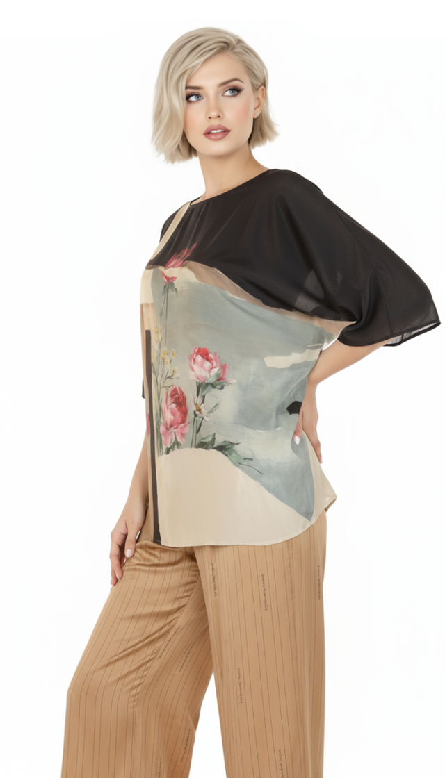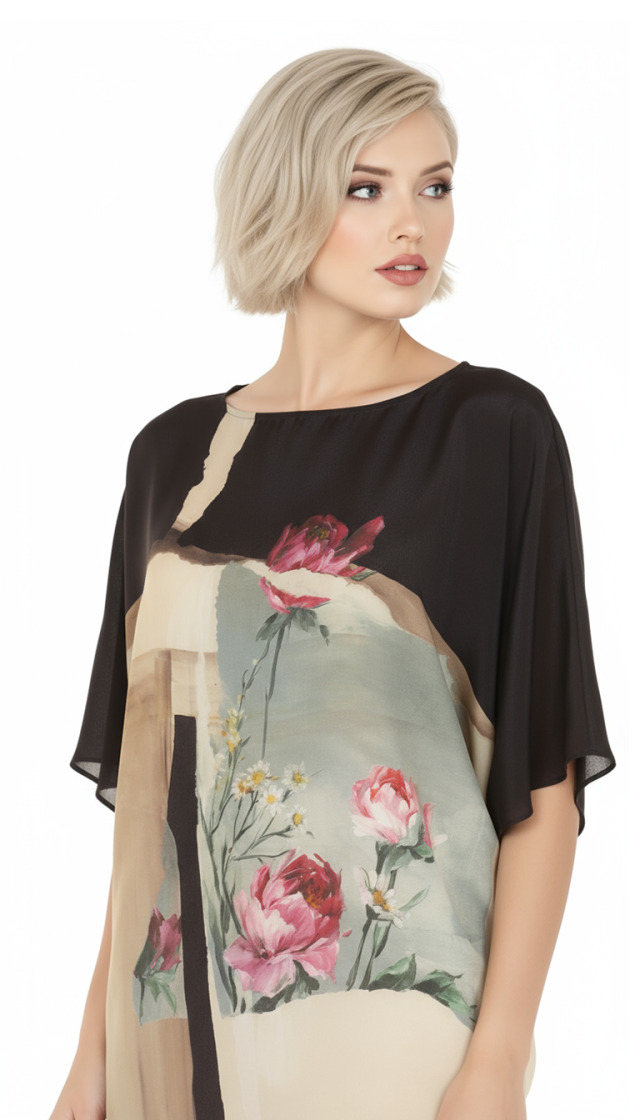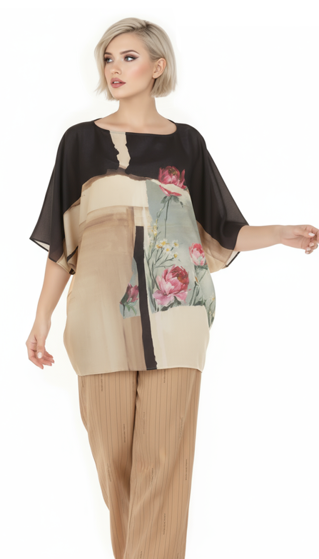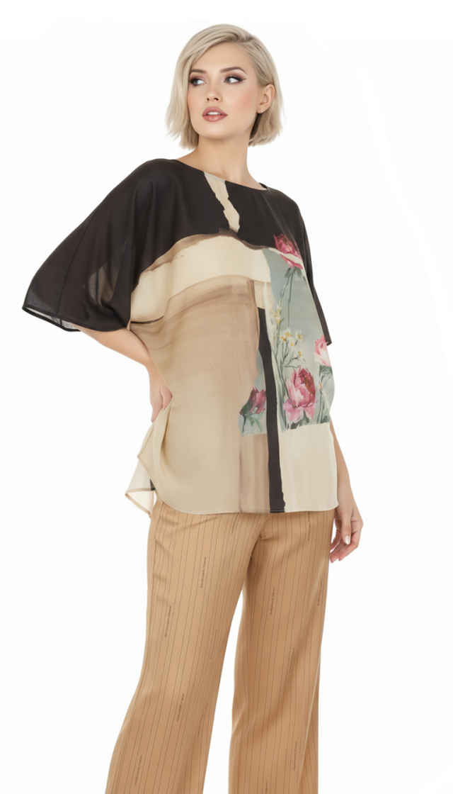 Новая шелковая блуза туника концерна Max Mara (линия Marina Rinaldi) с нежным цветочным принтом в акварельной технике. Удлиненный, свободный в груди и талии, и зауженный к бедрам фасон, с приспущенным рукавом длиной 1/2. Без застежки. В составе: 100% натуральный шелк — ткань экстра качества: легкая, приятная к телу, с неповторимым матовым шелковым отливом. Пошив — Тунис. Состояние — новое, из аутлета концерна Max Mara (ярлык бренда надрезан — это политика аутлета).