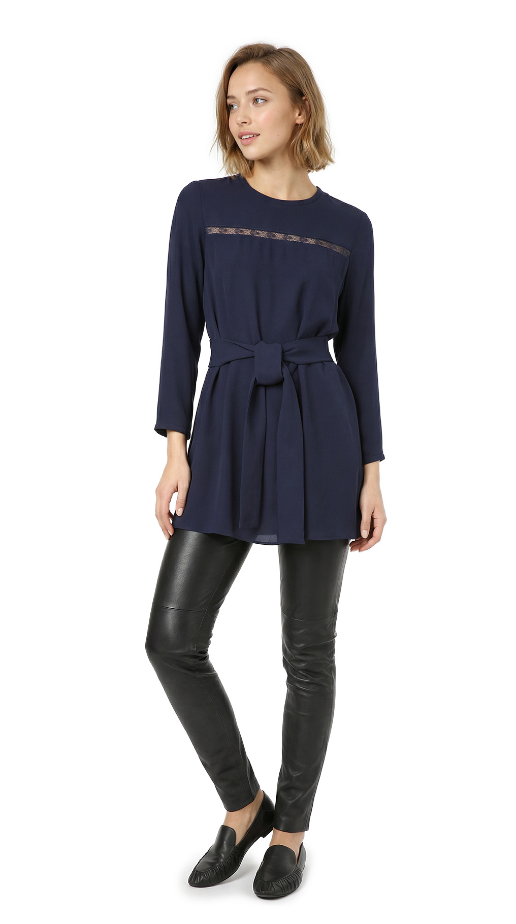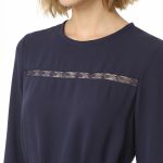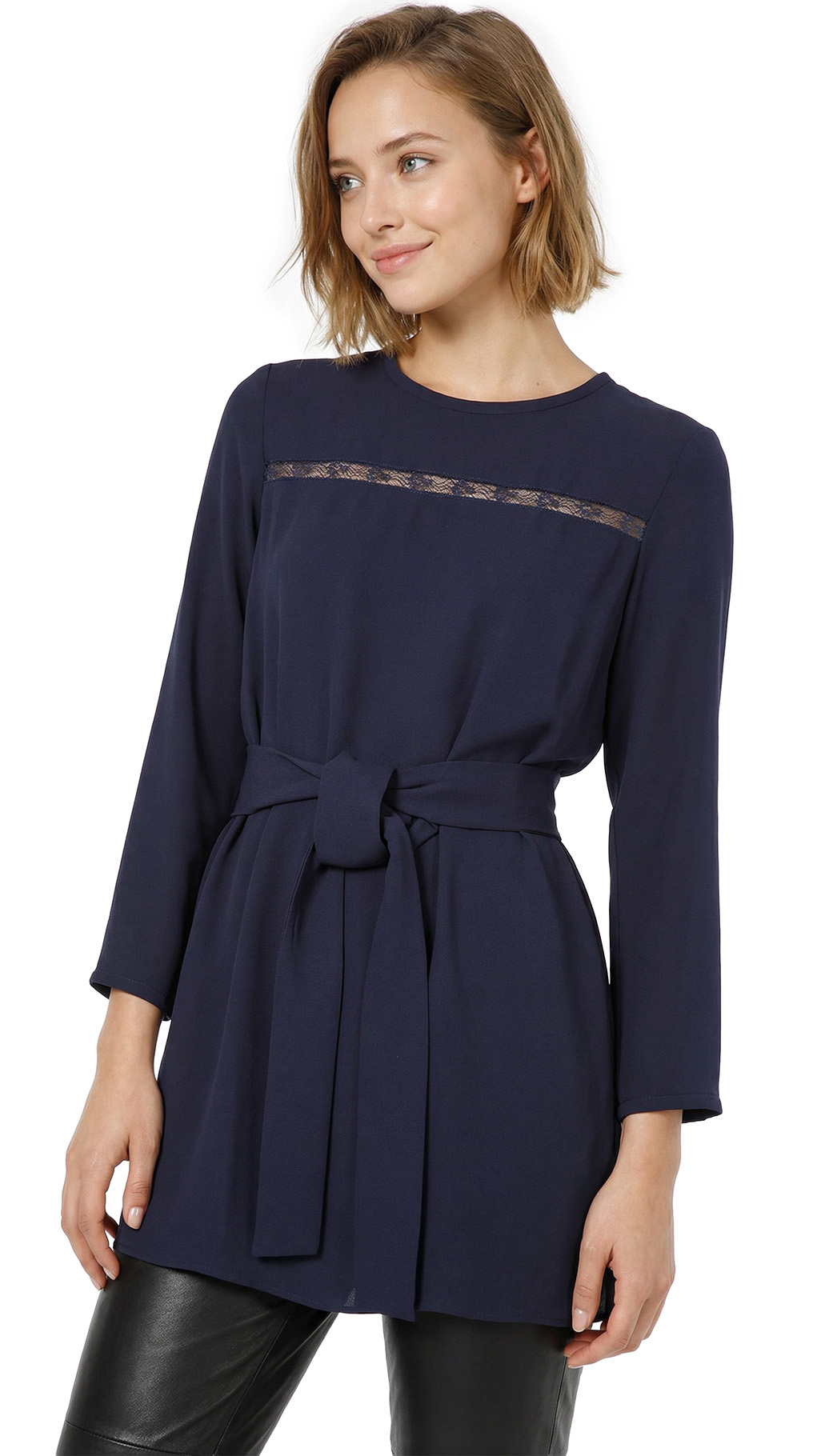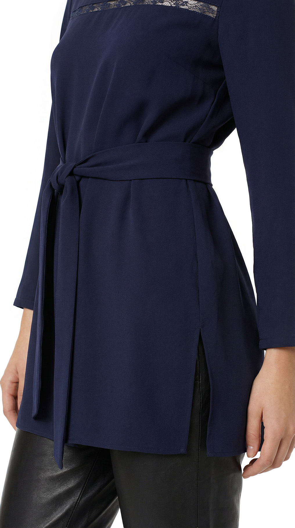 Оригинал. Новая блузка-туника концерна Max Mara (линия Studio) темно-синего цвета со вставкой из кружевной ленты. Женственный удлиненный свободный покрой, слегка расклешенный от талии, с подвязкой на пояс (в комплекте). Скругленная линия горловины. Застежка по спинке на молнию. Рукав длиной 3/4. Пошив — Италия. В составе: 73% триацетат, 27% п.э — ткань очень мягкая, бархатистая. Состояние — новое, из аутлета концерна Max Mara (ярлык бренда надрезан — это политика аутлета).