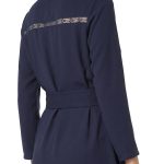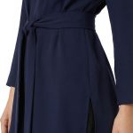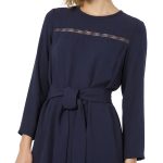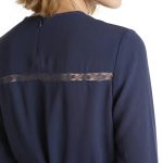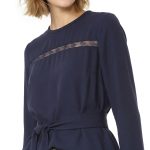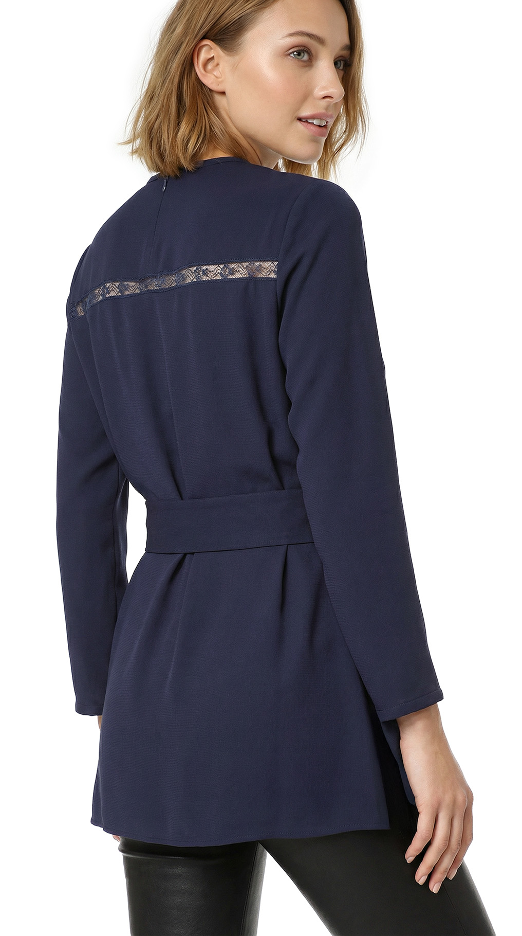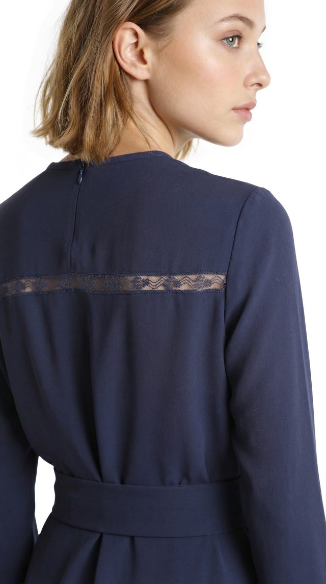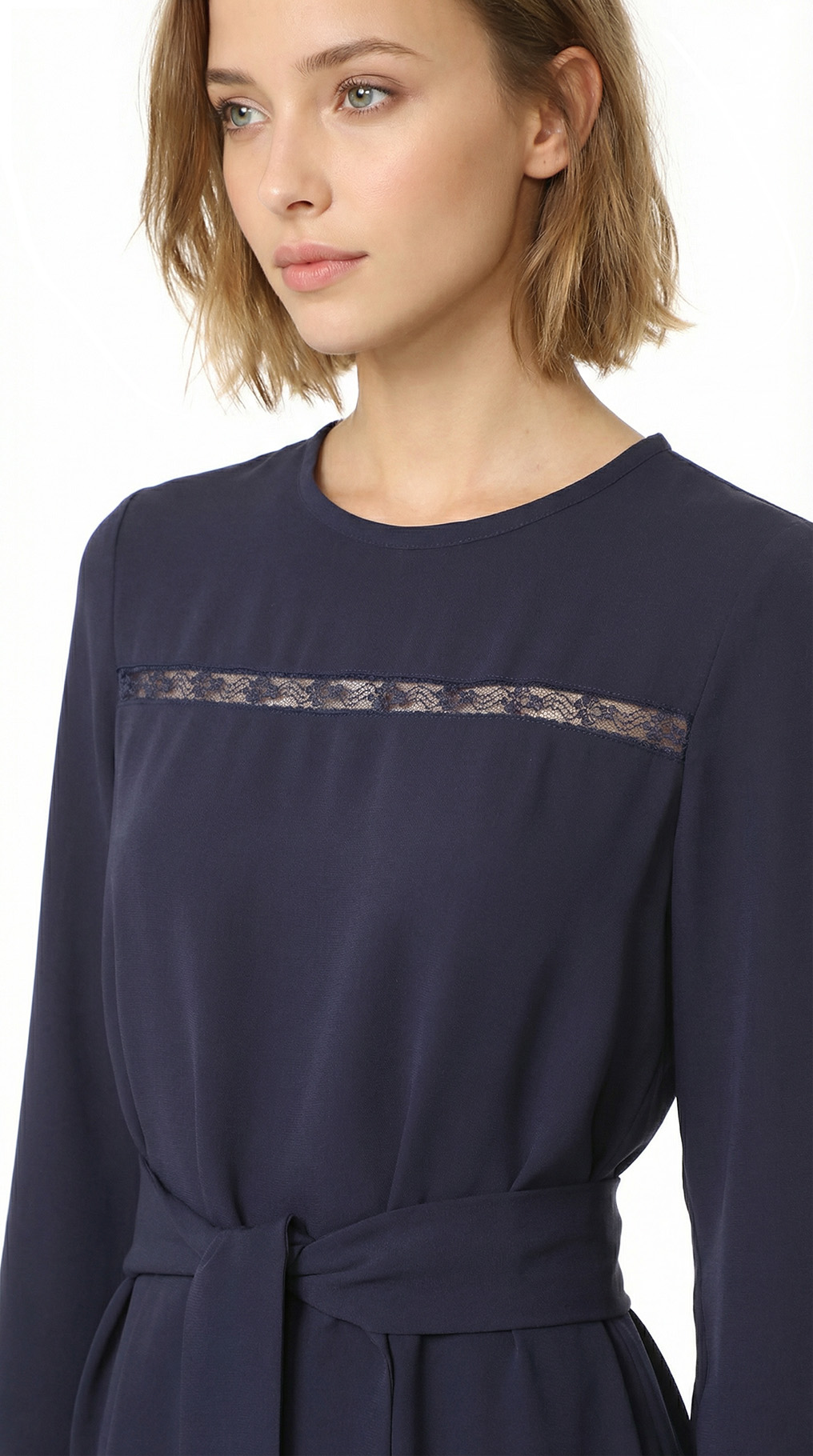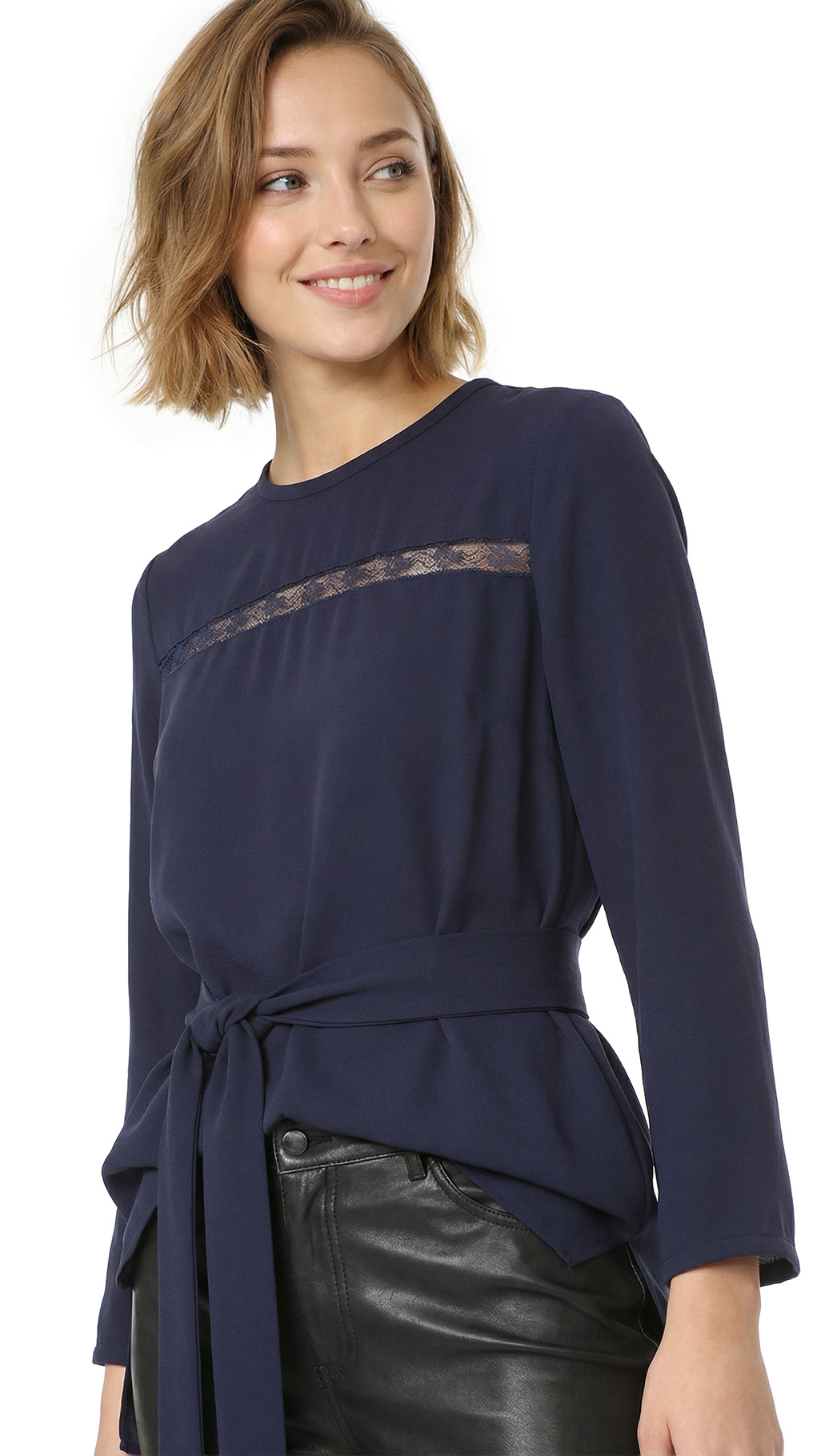 Оригинал. Новая блузка-туника концерна Max Mara (линия Studio) темно-синего цвета со вставкой из кружевной ленты. Женственный удлиненный свободный покрой, слегка расклешенный от талии, с подвязкой на пояс (в комплекте). Скругленная линия горловины. Застежка по спинке на молнию. Рукав длиной 3/4. Пошив — Италия. В составе: 73% триацетат, 27% п.э — ткань очень мягкая, бархатистая. Состояние — новое, из аутлета концерна Max Mara (ярлык бренда надрезан — это политика аутлета).