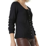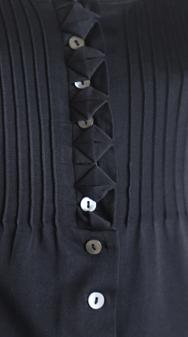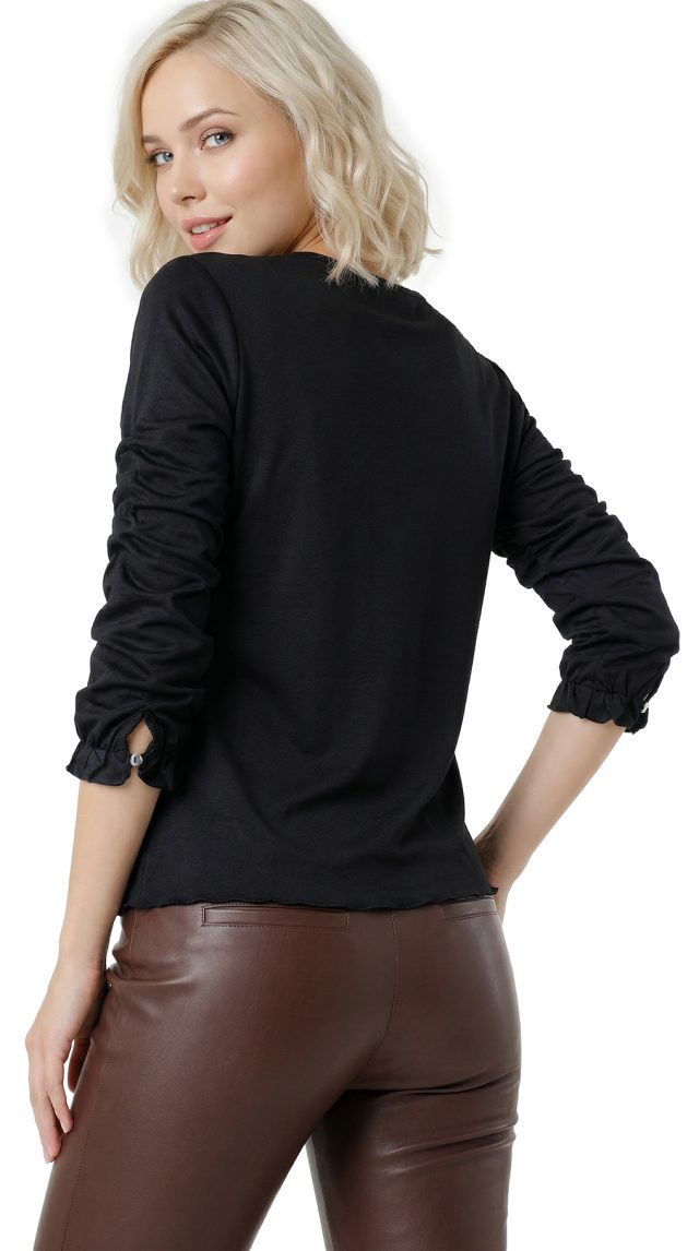 Новая трикотажная блуза французского бренда класса «люкс» Zapa Paris черного цвета. Оригинальный дизайнерский фасон с отстроченными складочками и объемными петлями на горловине и длинном рукаве. Застежка на перламутровые пуговки. Премиальное качество пошива и материалов. В составе 70% натуральный шелк, 30% хлопок — ткань экстра качества: очень мягкая, шелковистая. Эксклюзив: в единственном экземпляре в России. Состояние — новое, с фирменной биркой Zapa. Цена на бирке — 160 евро (!)