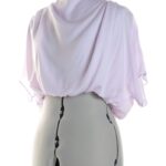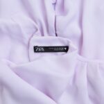 Укороченная блуза Zara нежно-сиреневого цвета с открытой спинкой, драпировкой по горловине, свободно спадающим коротким рукавом «летучая мышь» и присборенным низом с подвязкой на кантик. Застежка по спинке на пуговки. В составе: 100% п.э, на подкладе из п/э — ткань мягкая, легкая. Состояние — идеальное, как новое.