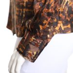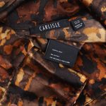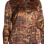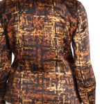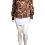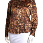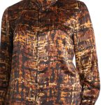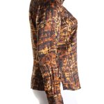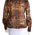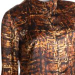 Дизайнерская шелковая блузка премиального американского бренда Carlisle с ярким принтом в золотисто-коричневых оттенках. Женственный приталенный фасон с горловиной «стойка» и застежкой на янтарные пуговки с золотой окантовкой. Красиво оформленная линия плеча, переходящая в длинный присборенный рукав на широкой манжете. Вырезы в боковых швах для комфортной посадки. В составе: 100% натуральный шелк — ткань экстра класса: средней плотности в несколько плетений, очень мягкая и нежная к телу. Оригинал из США — в единственном экземпляре в России. Состояние — отличное.