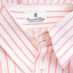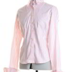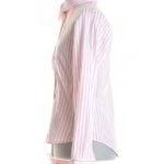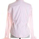 Блузка Emanuel Berg белого цвета в розовую полоску из 100% хлопка. Женственный приталенный покрой. Длинный рукав с широкой отворачиваемой манжетой, застегиваемой на запонки. Воротничок «стойка». Застежка на перламутровые пуговки. Ткань легкая, шелковистая, приятная к телу. Длина по начало ягодиц. Состояние — идеальное, как новое.