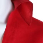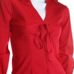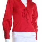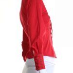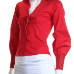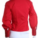 Новая хлопковая блузка французского бренда «прет-а-порте» L’Etincelle de Paris яркого красного цвета. Женственный приталенный фасон с длинным рукавом «фонарик». Мягкий отложной воротничок и манжеты из натурального атласного шелка. V-образный вырез горловины. Застежка на перламутровые пуговки с подвязкой на декоративный кантик. В составе 90% хлопок, 5% эластан, 5% шелк — ткань легкая, «хрустящая». Состояние — новое, с фирменной биркой магазина Etincelle.