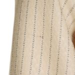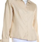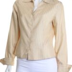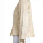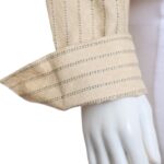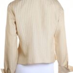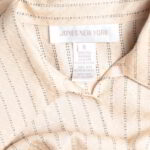 Шелковая блузка американского бренда Jones New York нежного, светло-кремового цвета в полоску с красивым набивным принтом. Женственный приталенный фасон с отложным воротничком, глубоким V-образным вырезом горловины и длинным рукавом с широкой отворачиваемой манжетой. Застежка на перламутровые пуговки. В составе: 100% натуральный шелк — легкий как пушинка, средней плотности, с естественным блеском. Состояние — отличное, но на правом рукаве есть небольшая затяжка (см предпоследнее фото).