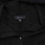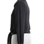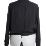 Вискозная блузка американского бренда Karen Kane бархатистого черного цвета. Модный фасон с подвязкой по талии. Отложной воротник. Застежка на перламутровые пуговки. Длинный рукав с широкой манжетой. Накладные кармашки спереди. Длина по начало ягодиц. Состав: 100% вискоза — легкая, мягкая, комфортная в носке. Состояние — отличное, как новое, после стирки.