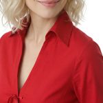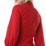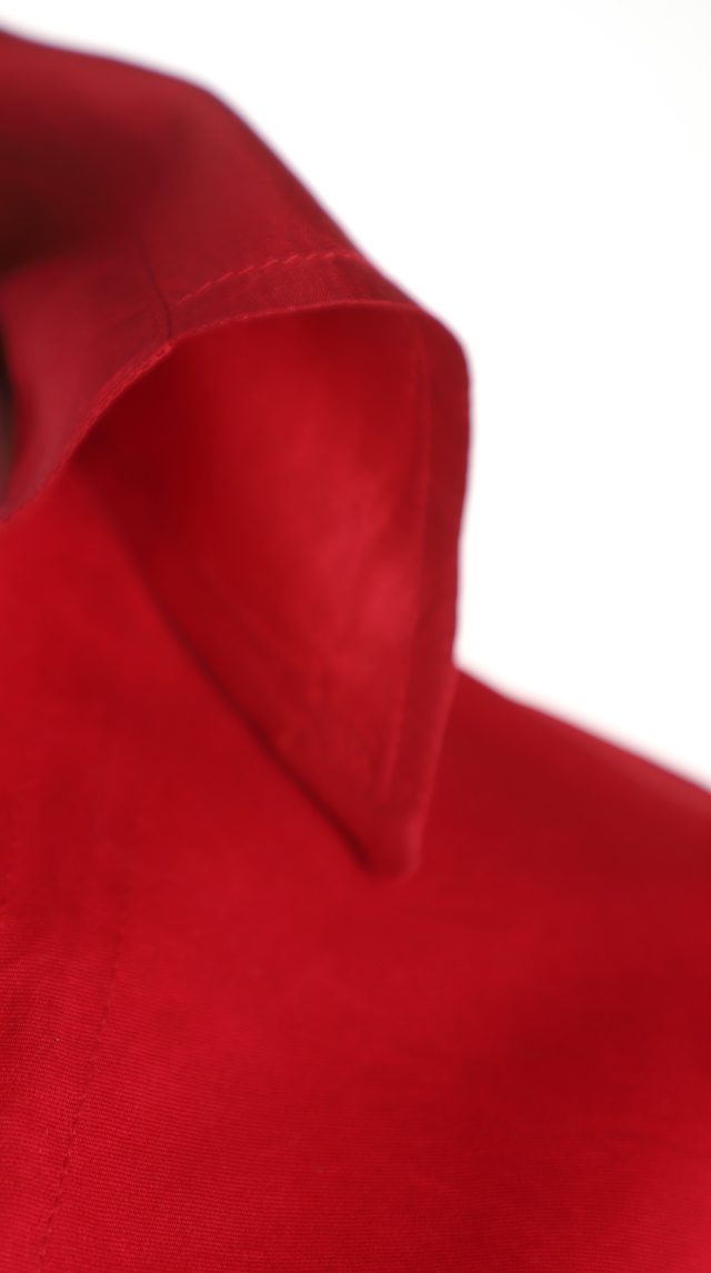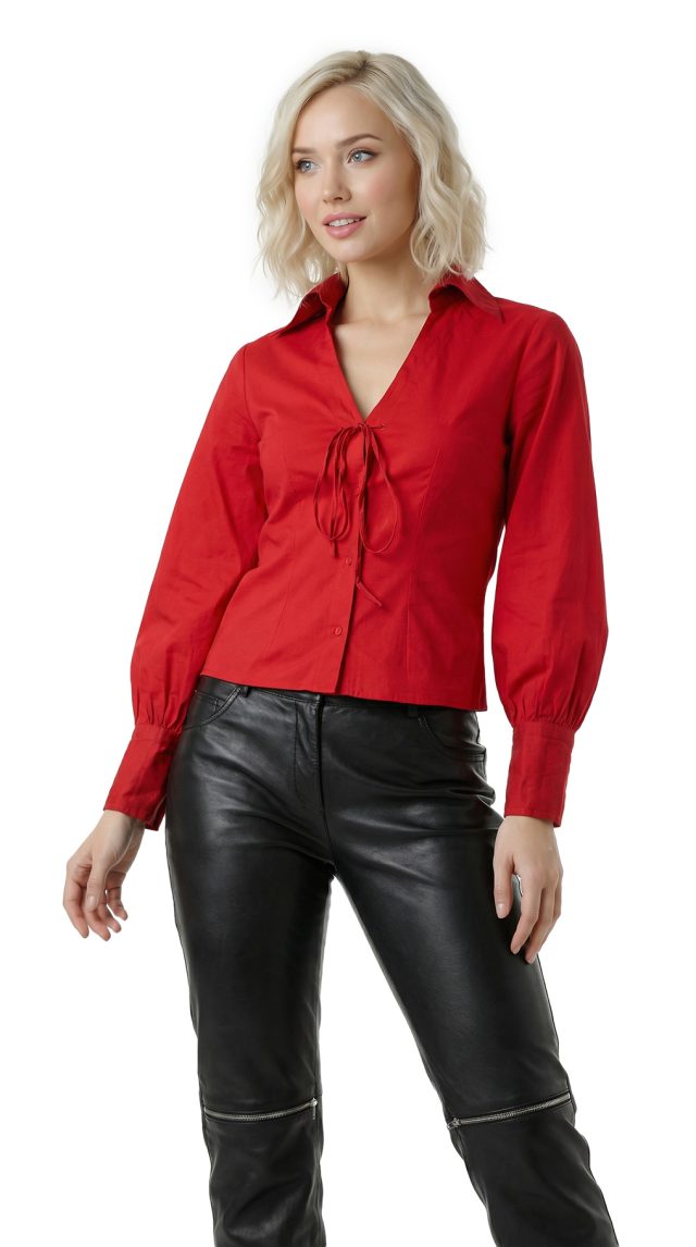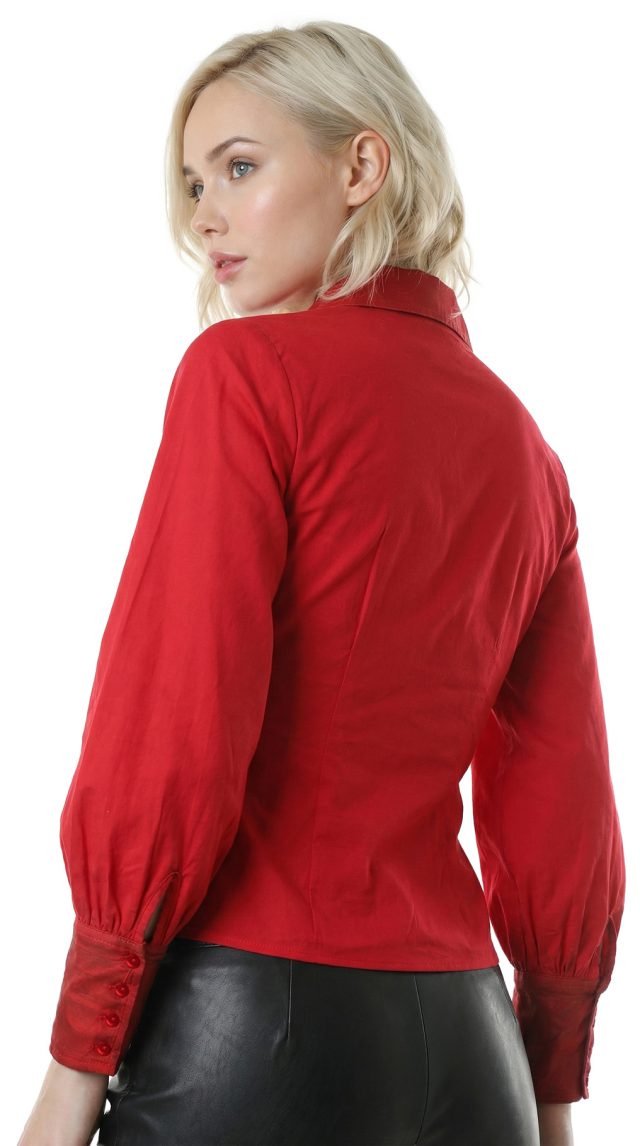 Новая дизайнерская хлопковая блузка французского бренда «прет-а-порте» L’Etincelle de Paris яркого красного цвета. Женственный приталенный фасон с длинным рукавом «фонарик». Мягкий отложной воротничок и манжеты из натурального атласного шелка. V-образный вырез горловины. Застежка на перламутровые пуговки с подвязкой на декоративный кантик. В составе 90% хлопок, 5% эластан, 5% шелк — ткань легкая, «хрустящая». Состояние — новое, с фирменной биркой магазина Etincelle.