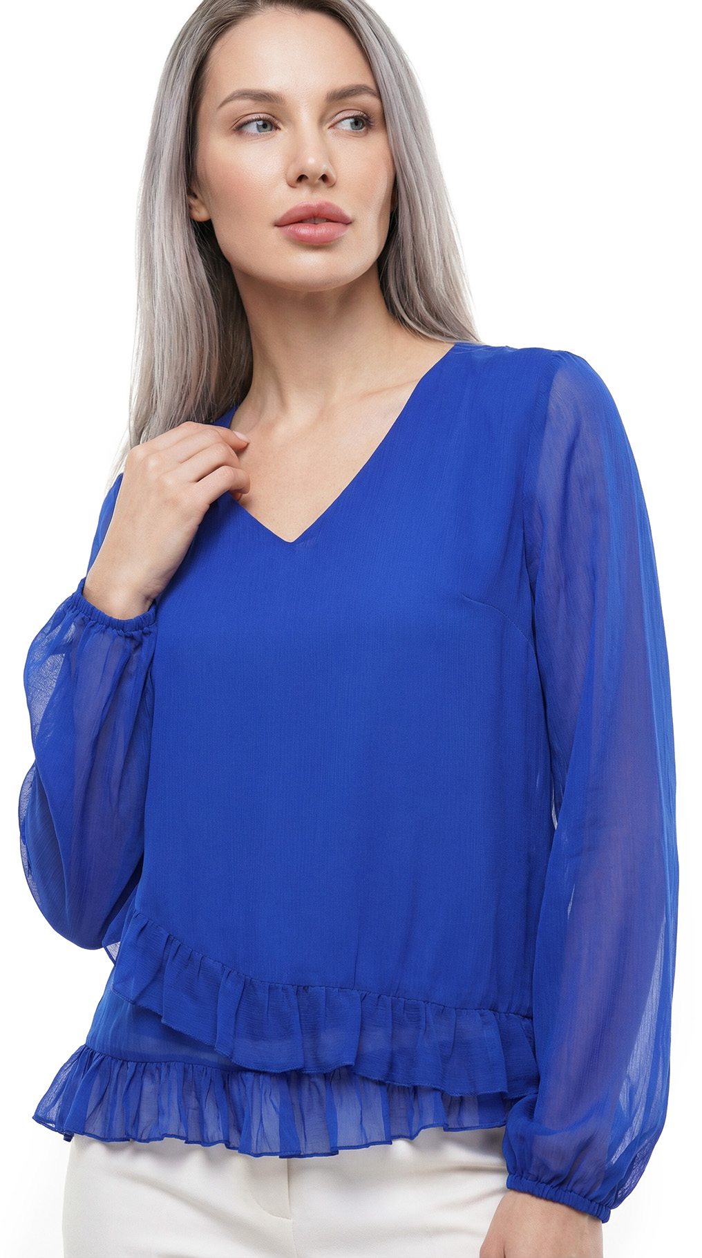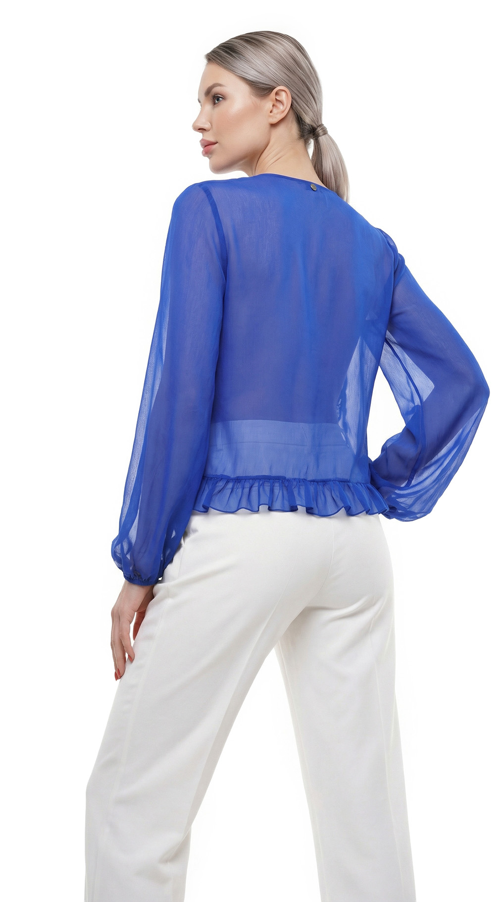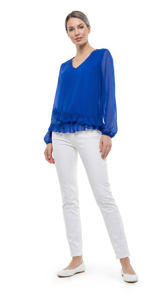 Оригинал. Новая блуза итальянского бренда в сегменте премиум Liu Jo глубокого синего цвета. Полу-приталенный фасон с V-вырезом горловины и воланами. Полу-прозрачный рукав и спинка, перед на подкладе (не прозрачный). Резинка на манжете рукавов — можно присборить в рукав 3/4. Пошив — Турция. Стильный элемент гардероба, подчеркивающий статус и отличный вкус. В составе: 100% вискоза, на подкладе из п.э (перед) — ткань экстра качества: мягкая, шелковистая. Состояние — новое, без бирки (пуговка с фирменной пломбой).