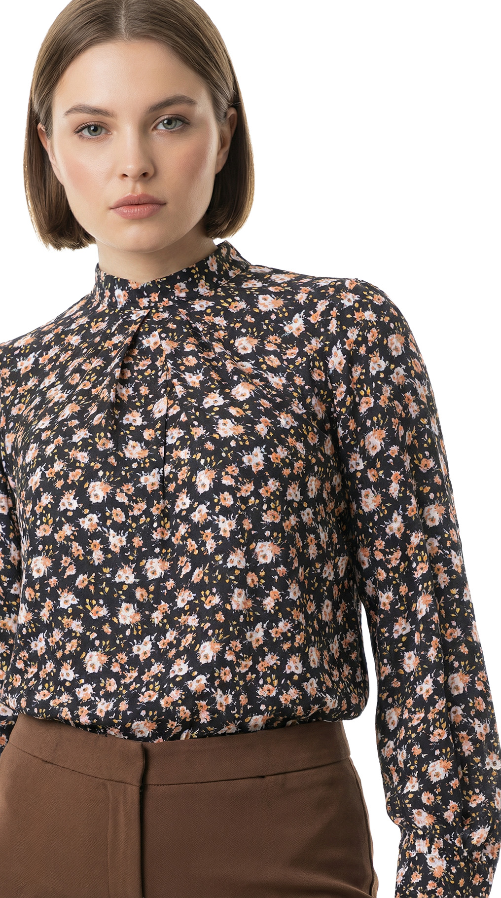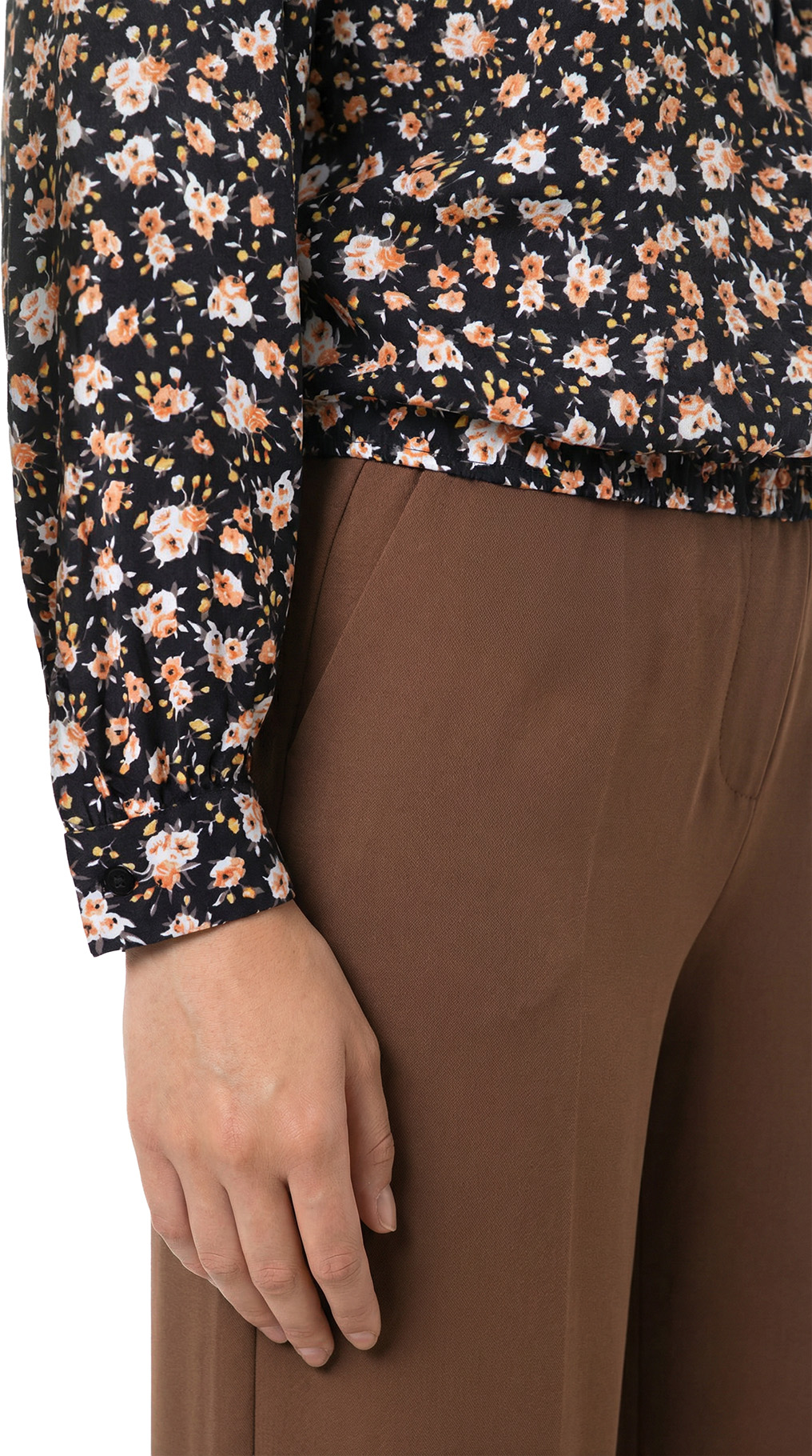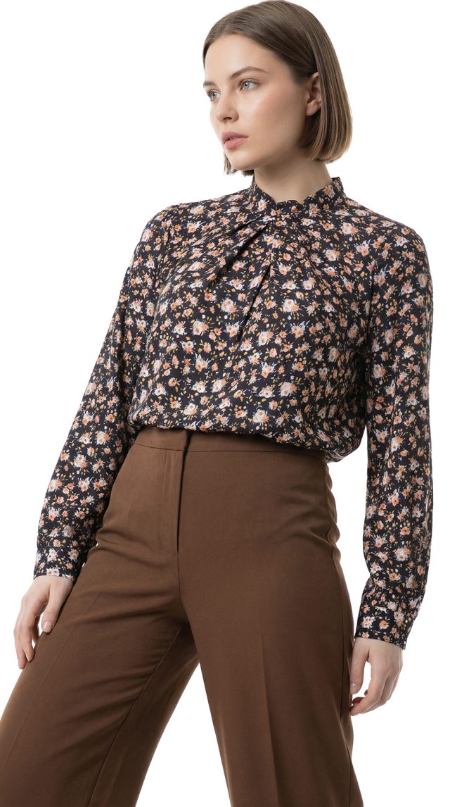 Оригинал с биркой. Новая блузка концерна Max Mara (линия iBlues) с цветочным принтом на темно-коричневом фоне. Прямой фасон с воротничком «стойка» и вырезом «капелька» по спинке с застежкой на пуговки. Складочки на линии декольте — подчеркивают грудь. Длинный рукав с манжетой на пуговках. В составе: 100% вискоза — ткань экстра качества: средней плотности, мягкая, шелковистая. Состояние — новое, с оригинальной биркой iBlues.