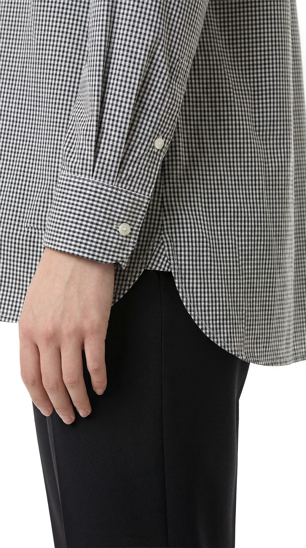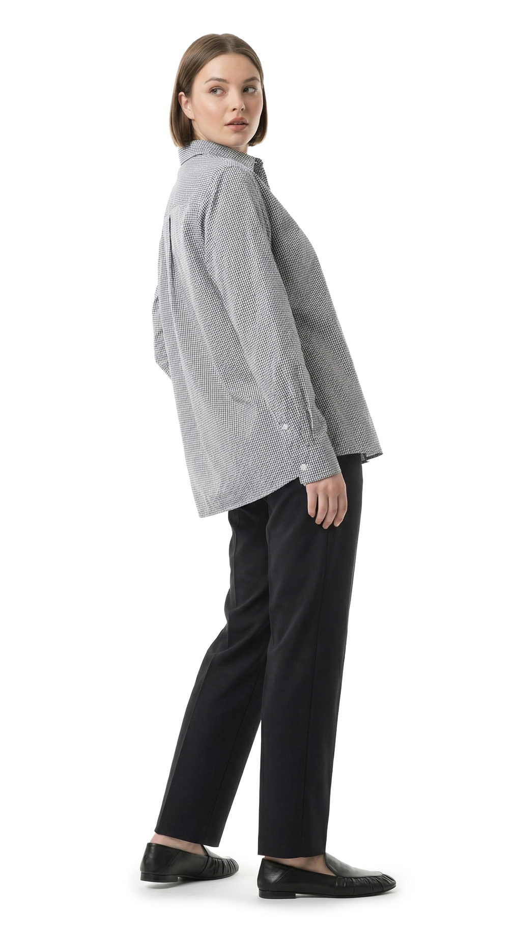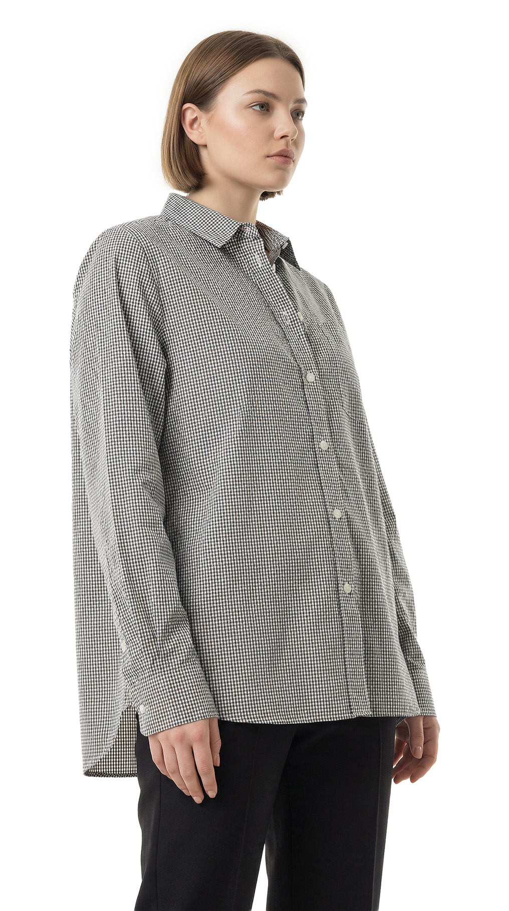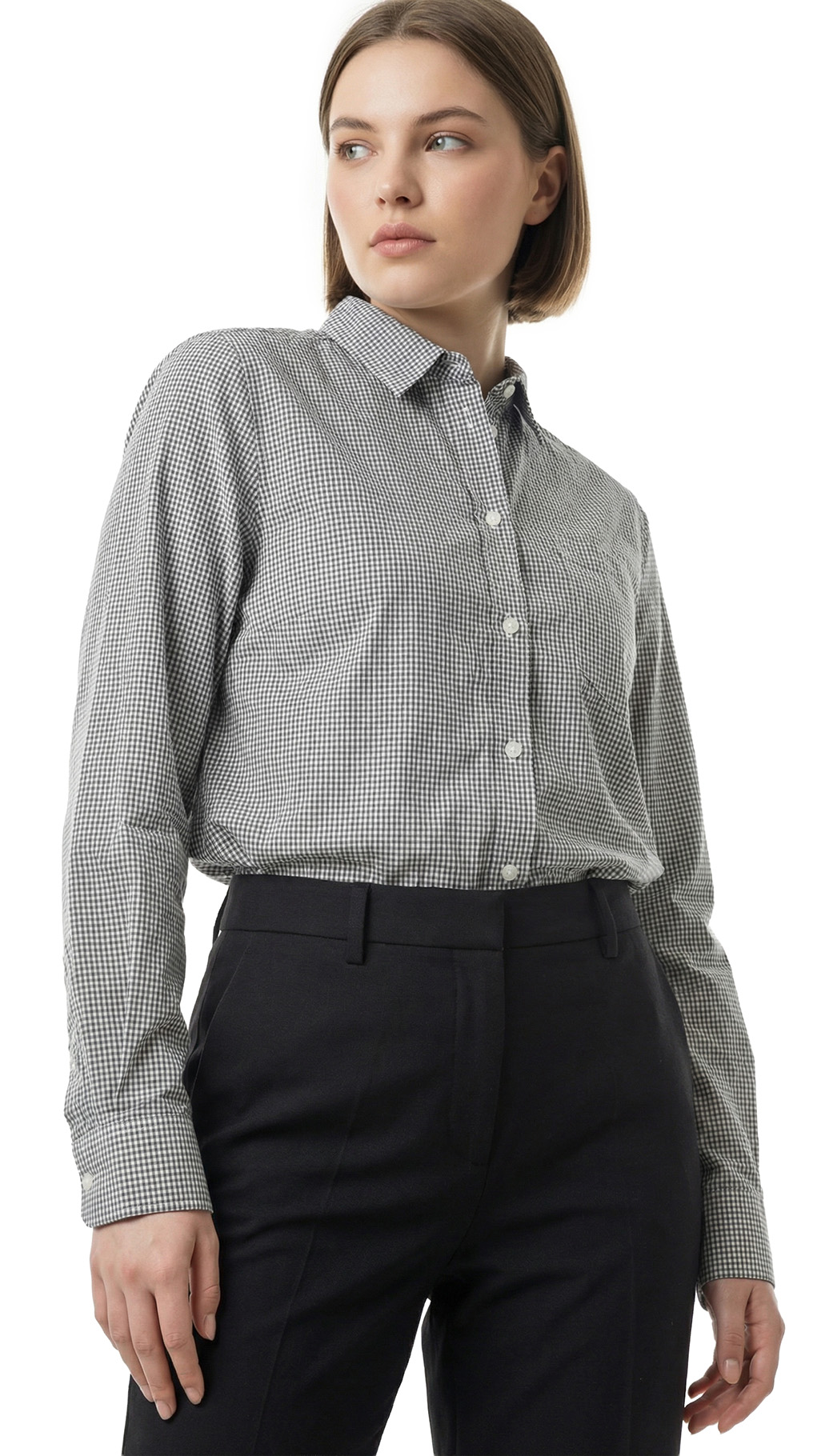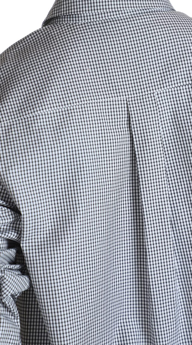 Оригинал. Новая хлопковая блузка концерна Max Mara (коллекция Weekend) в мелкую бело-серо-черную «шахматку». Удлиненный свободный фасон «трапеция» с длинным рукавом и классическим отложным воротничком. Застежка на перламутровые пуговки с гравировкой бренда Weekend. Накладной кармашек на груди. Складочка по спинке. В составе: 100% хлопок — ткань экстра качества: легкая, мягкая, комфортная в носке. Состояние — новое, из аутлета концерна Max Mara (ярлык бренда надрезан — это политика аутлета).