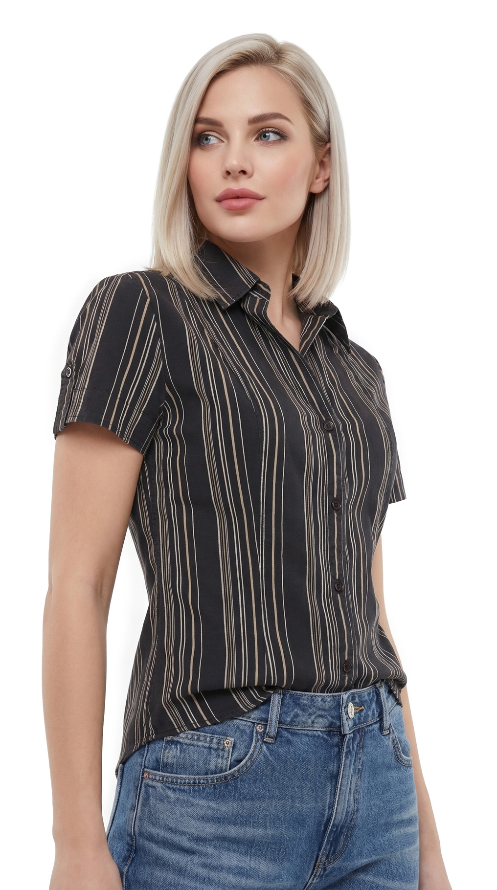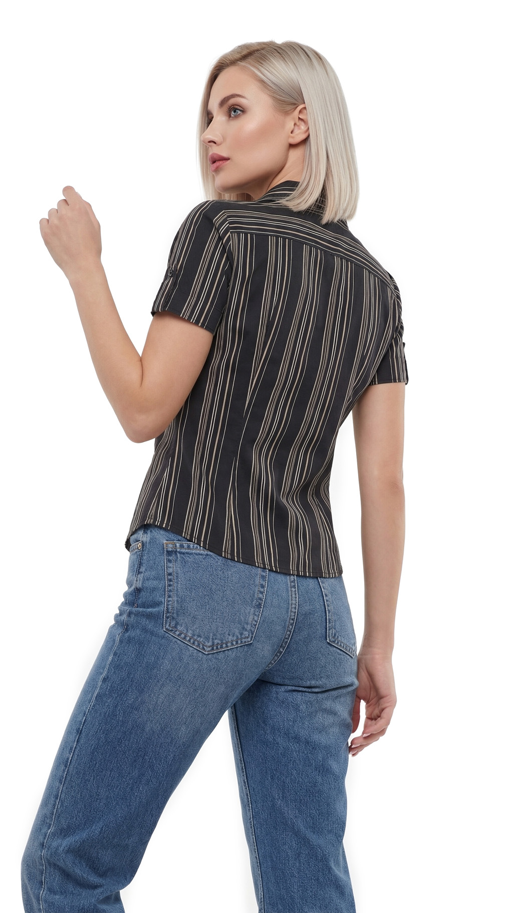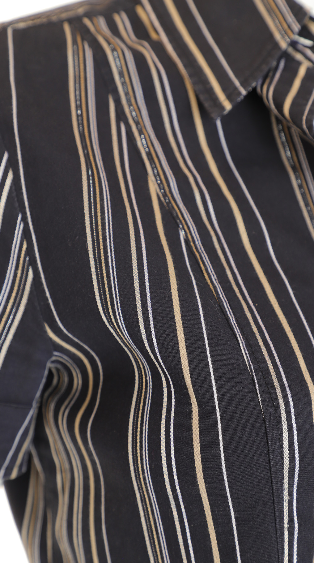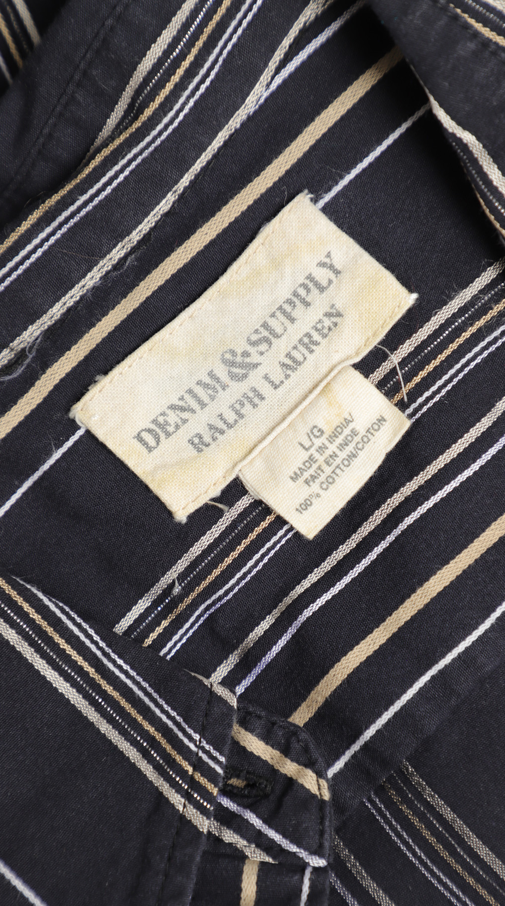 Оригинал. Хлопковая блузка Ralph Lauren (коллекция Denim & Supply) черного цвета с золотистыми и серебряными нитями. Женственный приталенный фасон с коротким рукавом, имеющим декоративный отворот на пуговку по линии плеча. Застежка на пуговки. Пошив — Индия. В составе: 100% хлопок. Состояние — отличное, как новое.