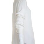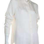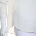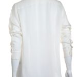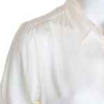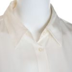 Шелковая блузка Ralph Lauren цвета слоновой кости. Женственный приталенный фасон с длинным рукавом на широкой манжете. Классический отложной воротничок. Застежка на фирменные перламутровые пуговки с гравировкой бренда. Драпировка по линии плеча и рукавам. Скругленная линия низа. В составе: 100% натуральный шелк экстра качества — плотный, мягкий, бархатистый на ощупь. Оригинал из США. Состояние — хорошее (практически незаметные следы носки на внутренней стороне воротничка и подмышках).
