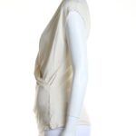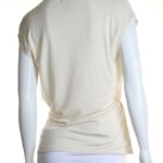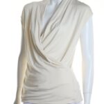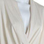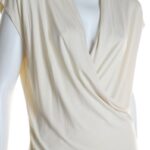 Женственная трикотажная блузка Ralph Lauren светло-бежевого цвета (слоновой кости). Глубокий вырез горловины с красивой драпировкой. Двухслойный удлиненный фасон с запахом по талии. Короткий приспущенный рукав. Без застежки. В составе 97% вискоза, 3% эластан — ткань экстра качества: мягкая, шелковистая, эластичная. Состояние — отличное.