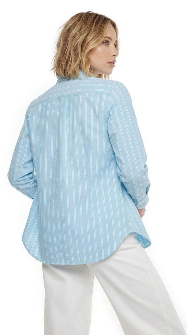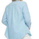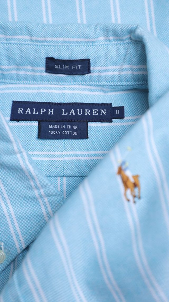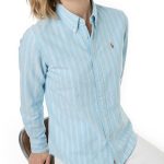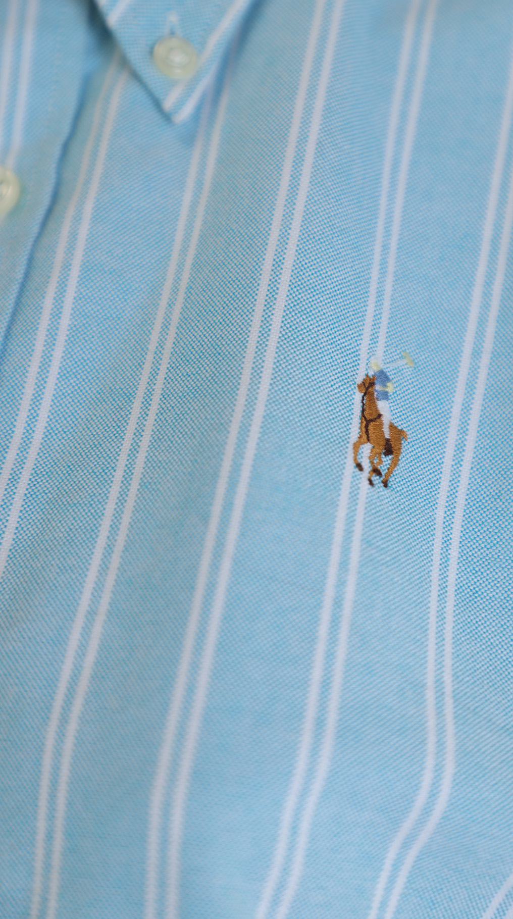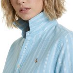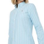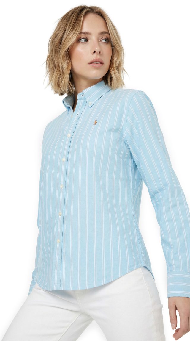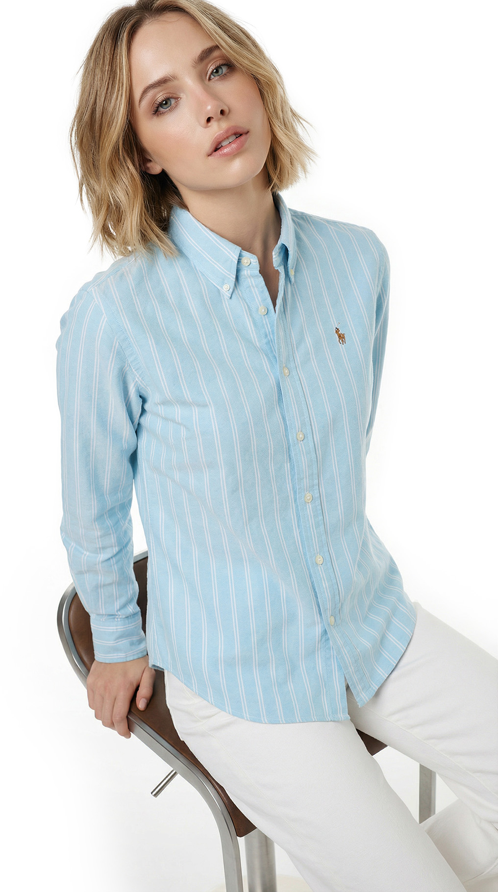 Новая хлопковая блузка рубашка Ralph Lauren голубого цвета с принтом «полосы» и фирменной вышивкой Polo на груди. Женственный полу-приталенный фасон с длинным рукавом и скругленной линией низа. Классический отложной воротничок. Застежка на перламутровые пуговки. В составе: 100% хлопок — ткань средней плотности, мягкая, бархатистая. Оригинал из США. Состояние — новое.