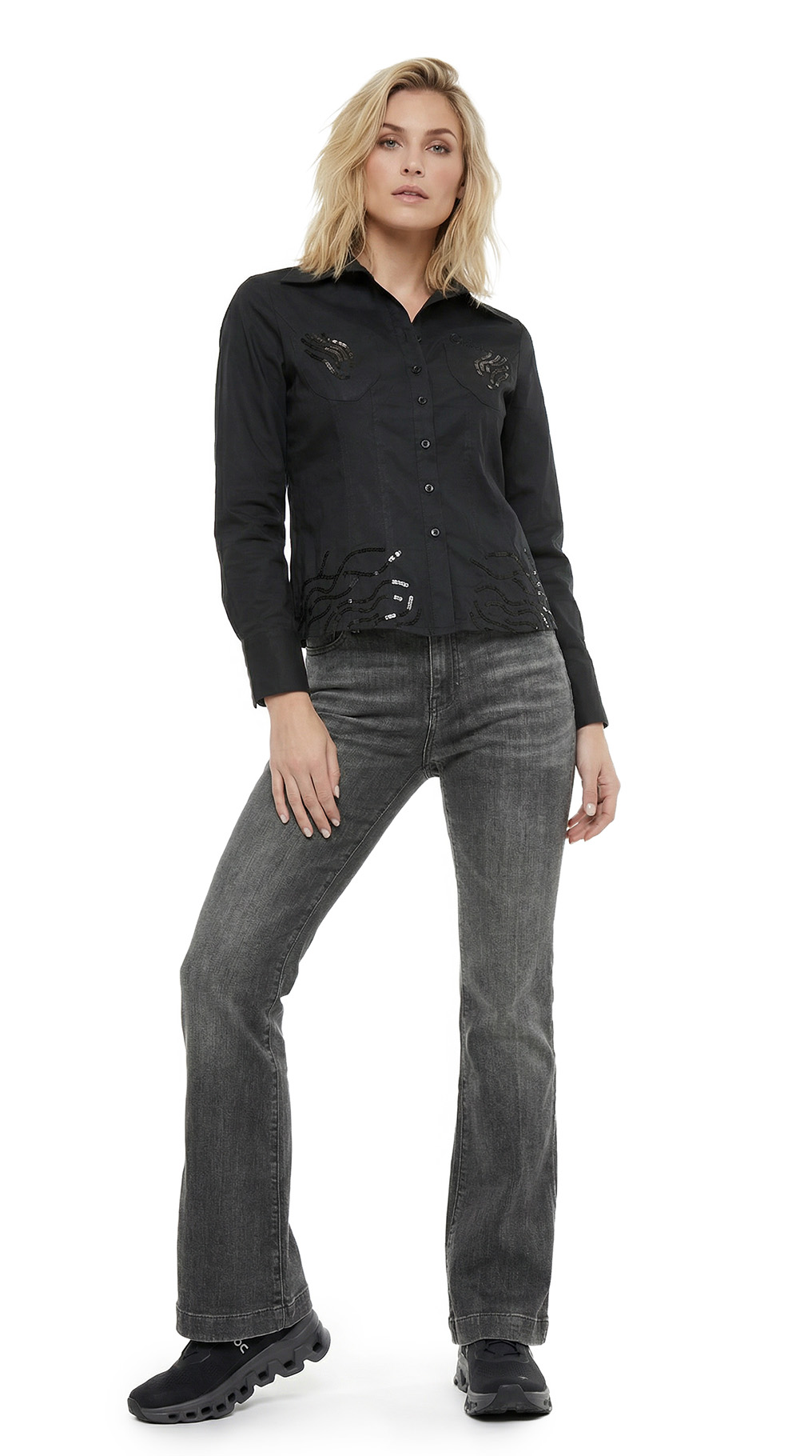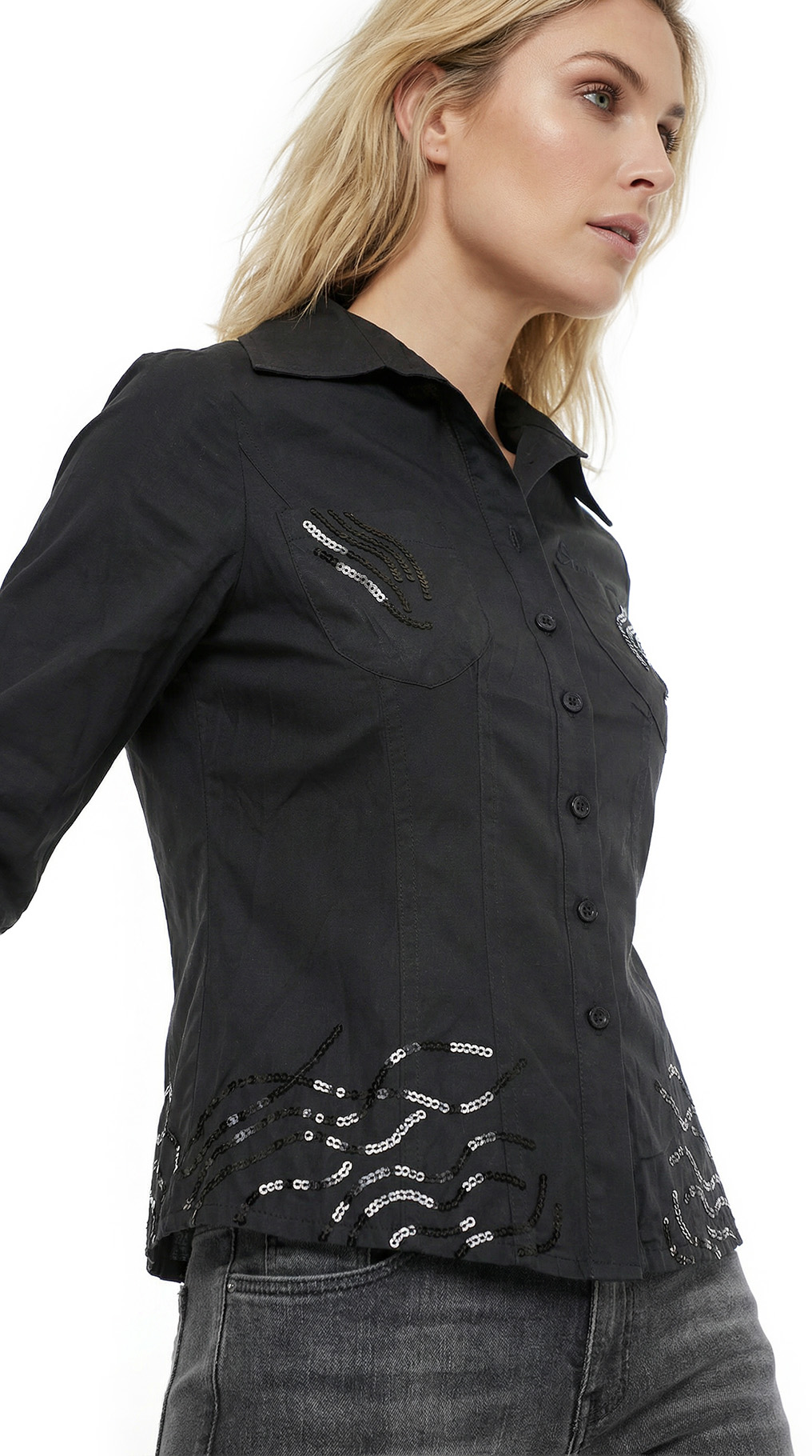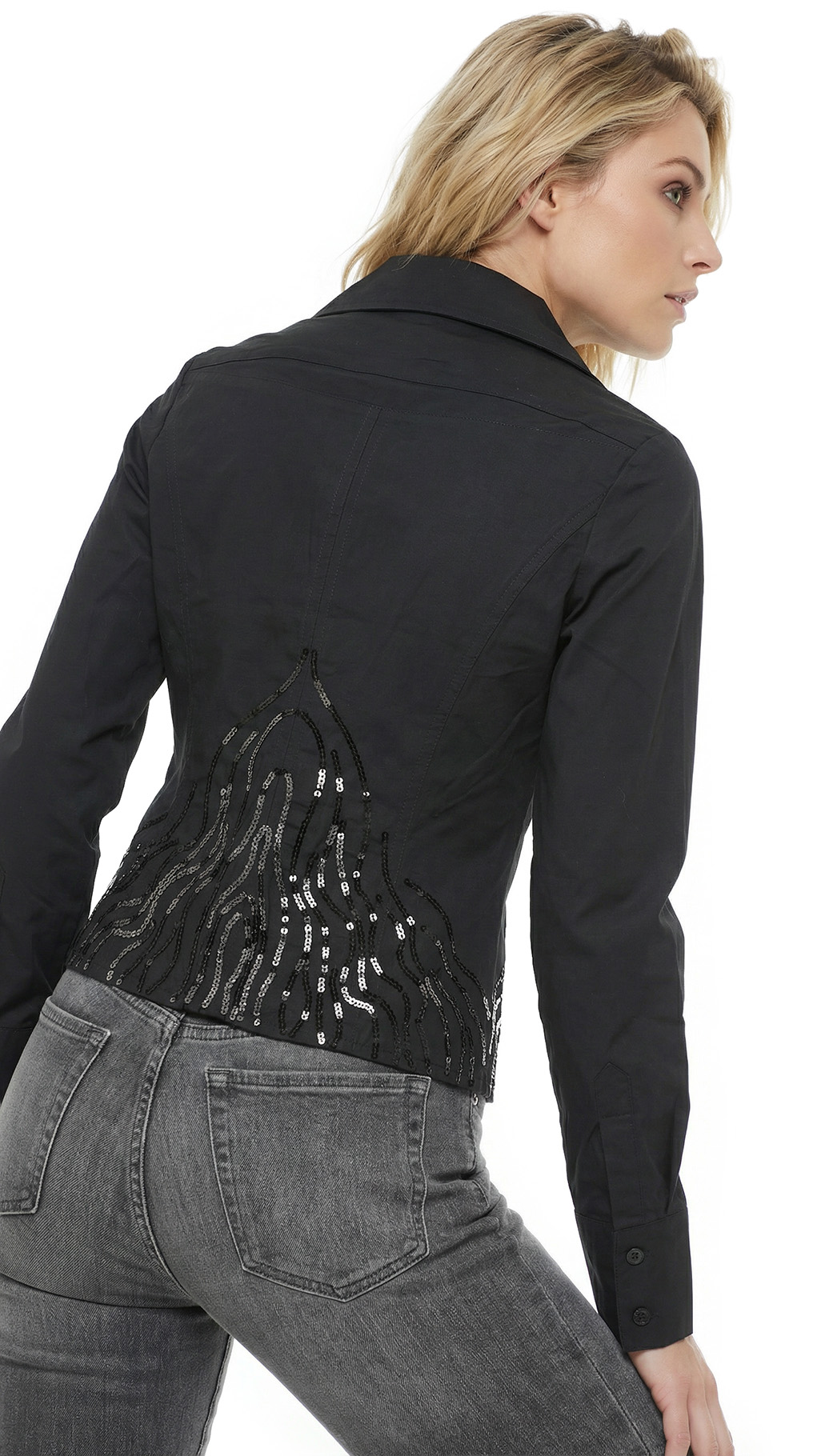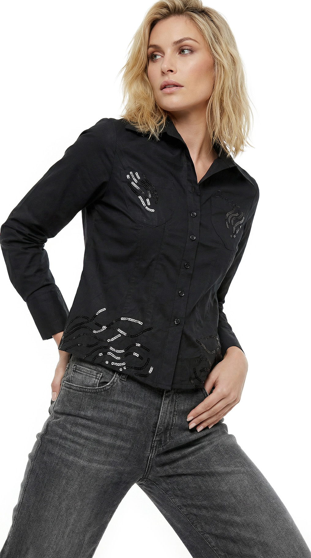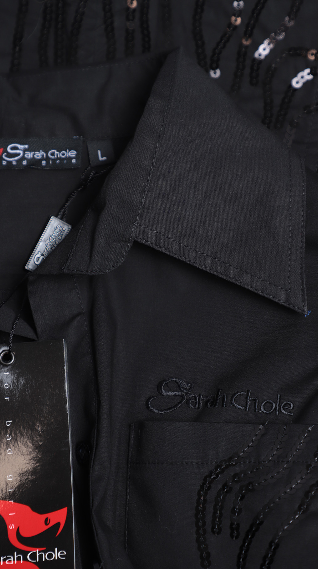 Новая эффектная блузка итальянского бренда Sarah Chole черного цвета, декорированная пайтками и фирменной вышивкой с названием бренда. Женственный приталенный фасон с отложным воротничком и длинным рукавом. Застежка на пуговки с гравировкой бренда. Накладные кармашки на груди. В составе 97% хлопок, 3% эластан — ткань легкая, «хрустящая». Состояние — новое, с фирменной биркой Sarah Chole.