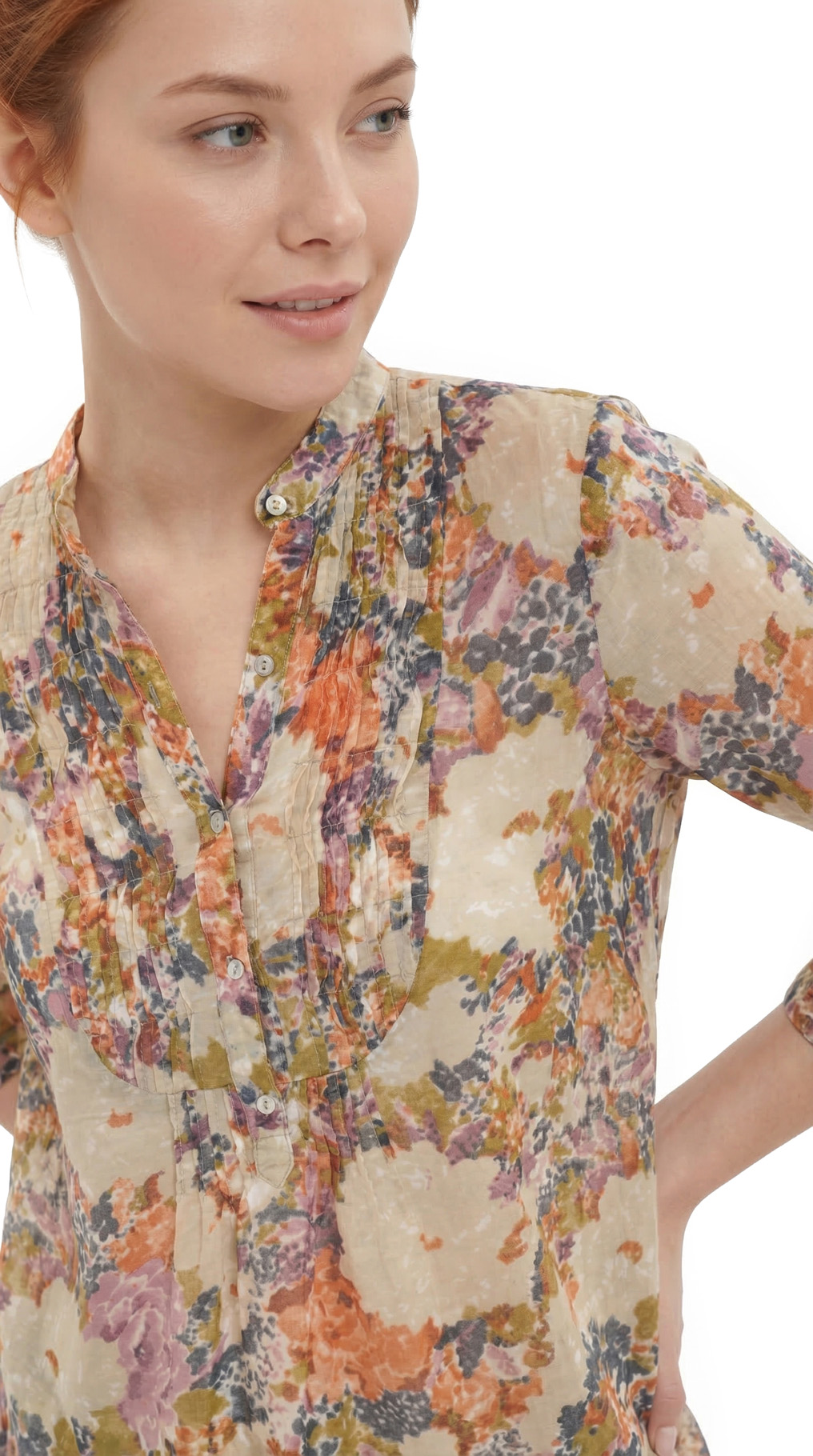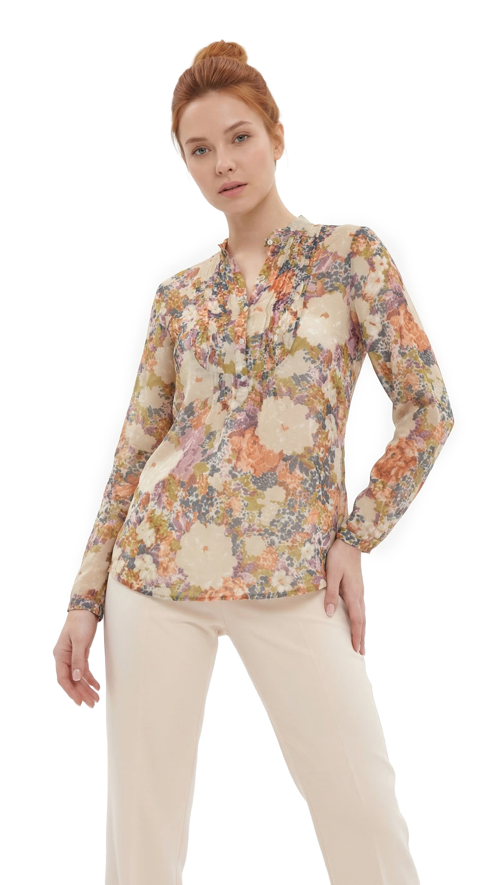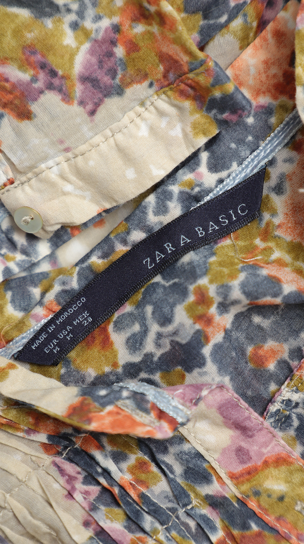 Летняя блузка Zara в приглушенных зелено-сине-фиолетовых тонах с цветочным принтом. Полуприталенный фасон. Длинный рукав, отворачиваемый на пуговку. Красивая оборка на груди. Бирка с составом срезана, по экспертной оценке — смесь хлопка и натурального шелка — ткань легкая, полупрозрачная, практически невесомая. Состояние — идеальное, как новое.