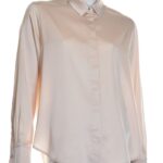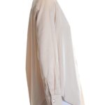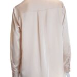Шелковая блузка Zarina нежного кремового цвета с классическим отложным воротничком, декорированным золотой пуговкой. Свободный рубашечный покрой с длинным рукавом и застежкой на пуговки на потайной планке. Бирка с составом срезана — экспертная оценка — натуральный шелк: мягкий с характерным благородным отливом. Состояние — отличное (мини-зацепка, в носке не заметна).