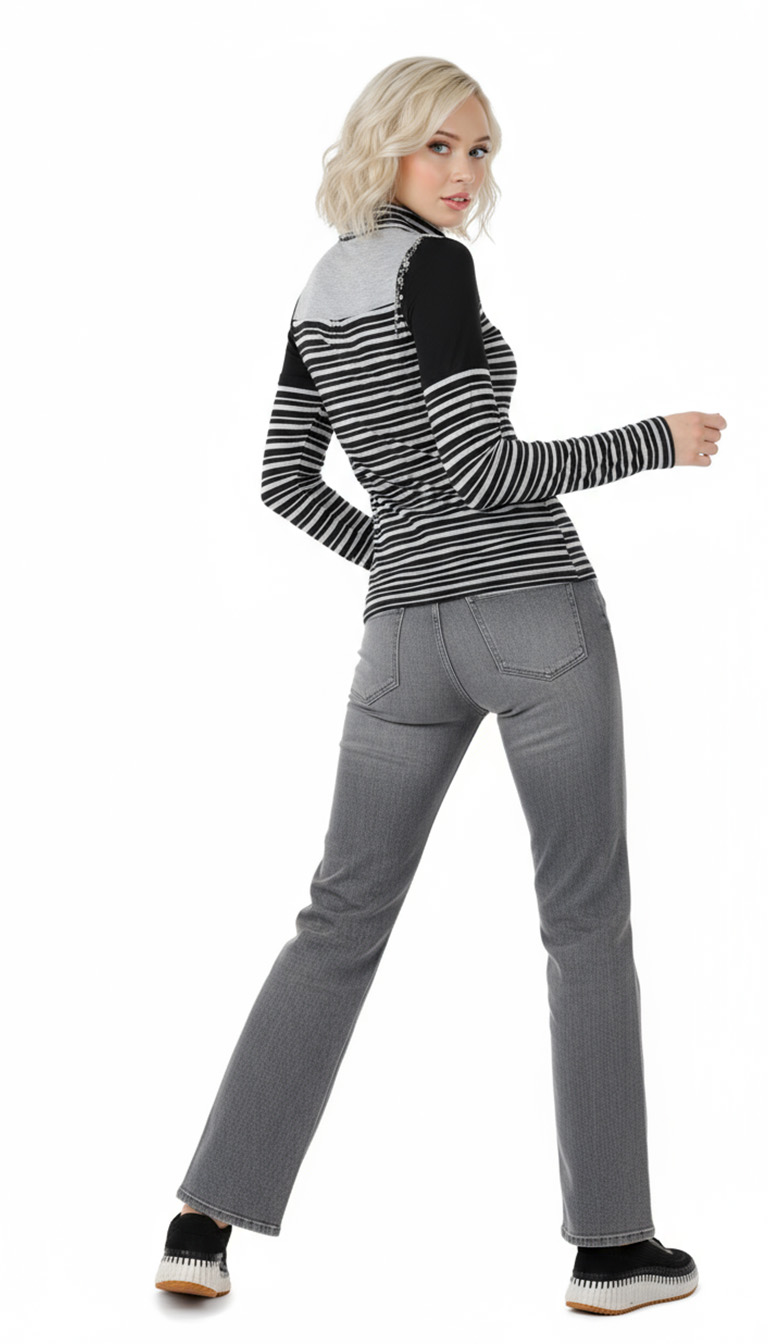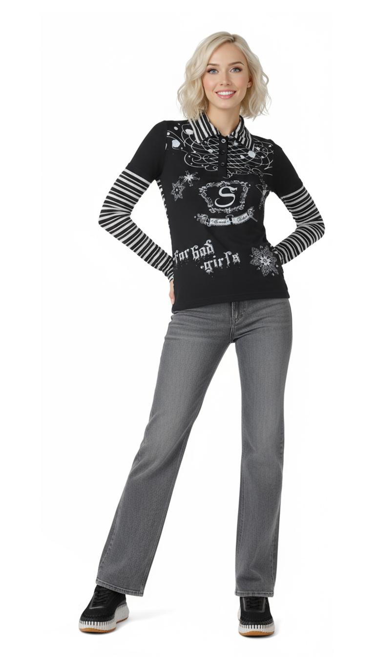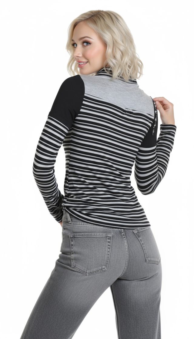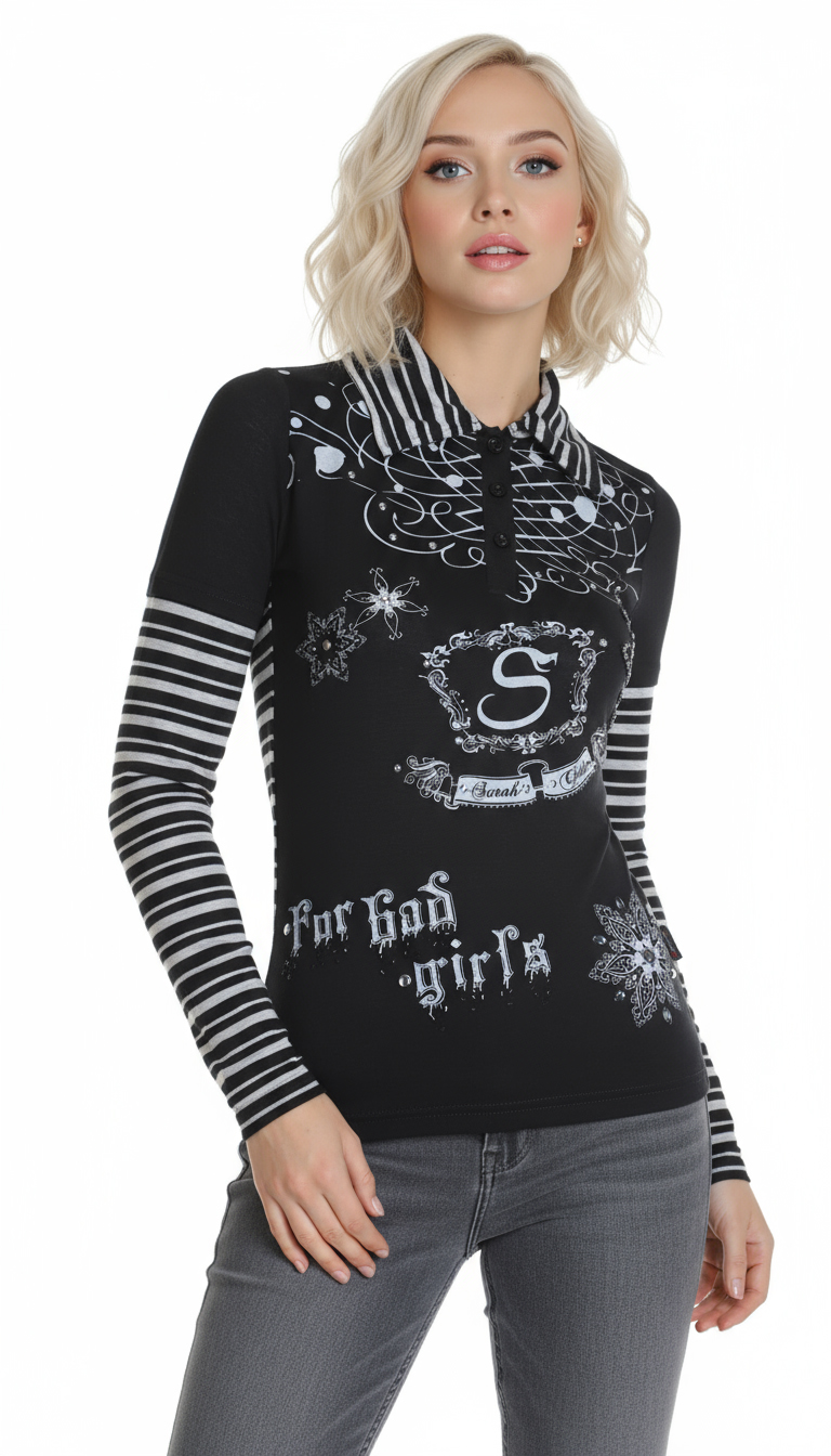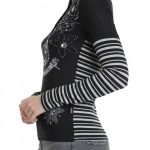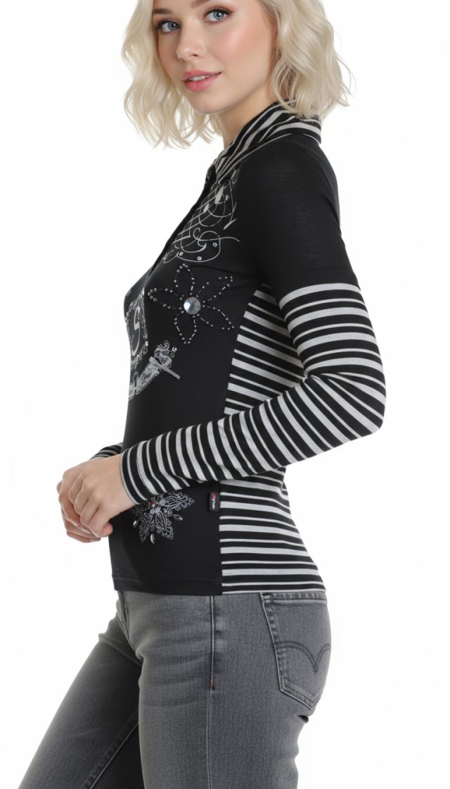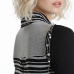 Новый стильный трикотажный лонгслив итальянского бренда Sarah Chole черно-серого цвета с «полосатыми» рукавами, спинкой и отложным воротничком. Яркий декор бисером (по спинке) и заклепками. Плашка с пуговками по горловине. В составе: 95% вискоза, 5% эластан — ткань легкая, очень мягкая, хорошо тянется. Состояние — новое, с фирменной биркой Sarah Chole.