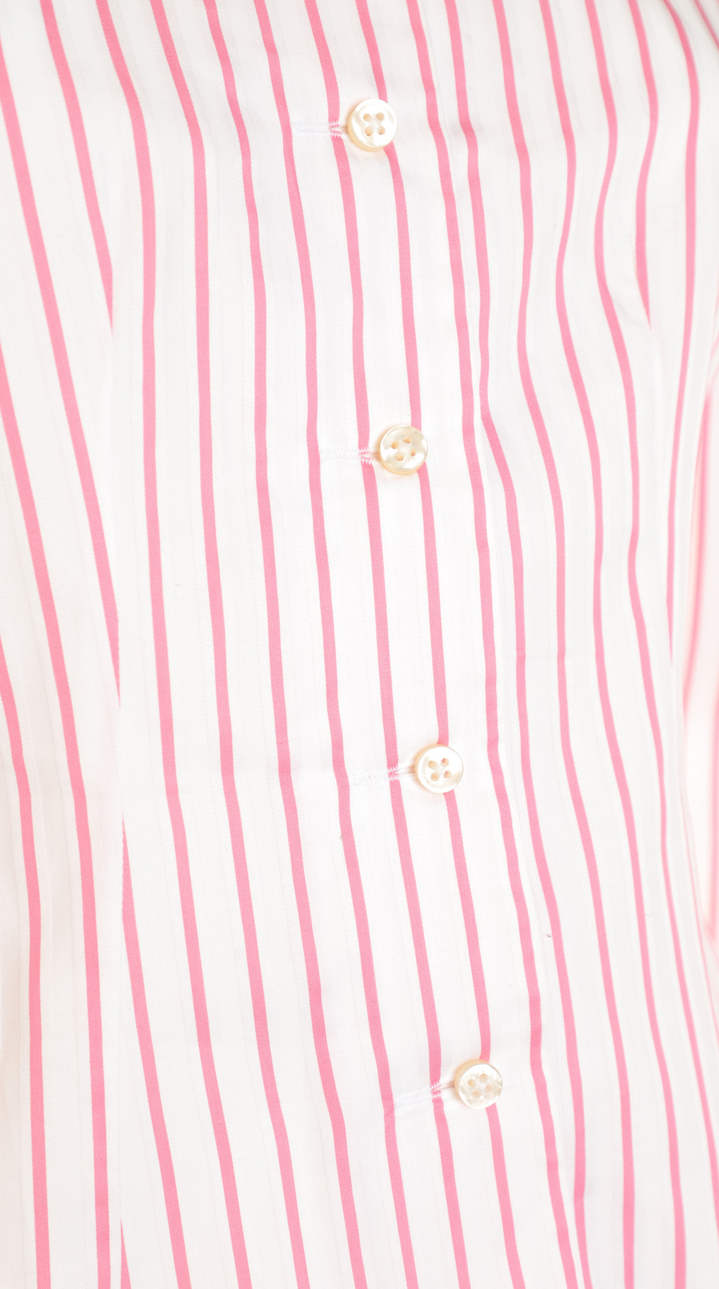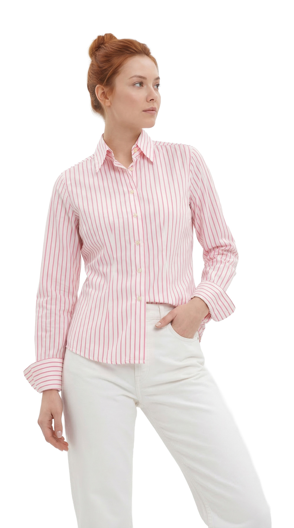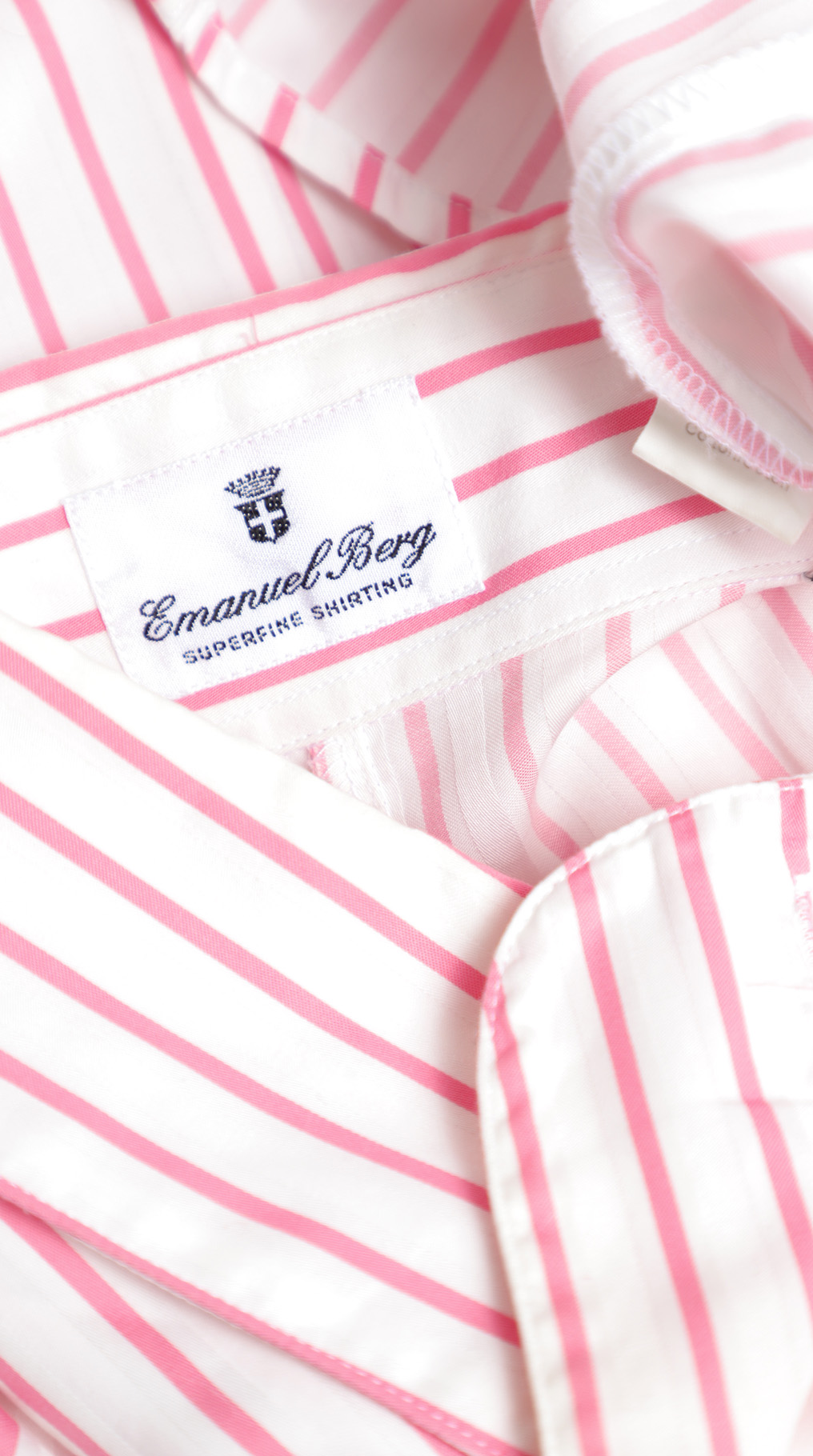 Хлопковая рубашка премиального немецкого бренда Emanuel Berg белого цвета в розовую полоску из 100% хлопка. Женственный приталенный покрой. Длинный рукав с широкой отворачиваемой манжетой, застегиваемой на запонки. Классический воротничок. Застежка на перламутровые пуговки. В составе: из 100% хлопок — ткань легкая, шелковистая, приятная к телу. Состояние — идеальное, как новое.