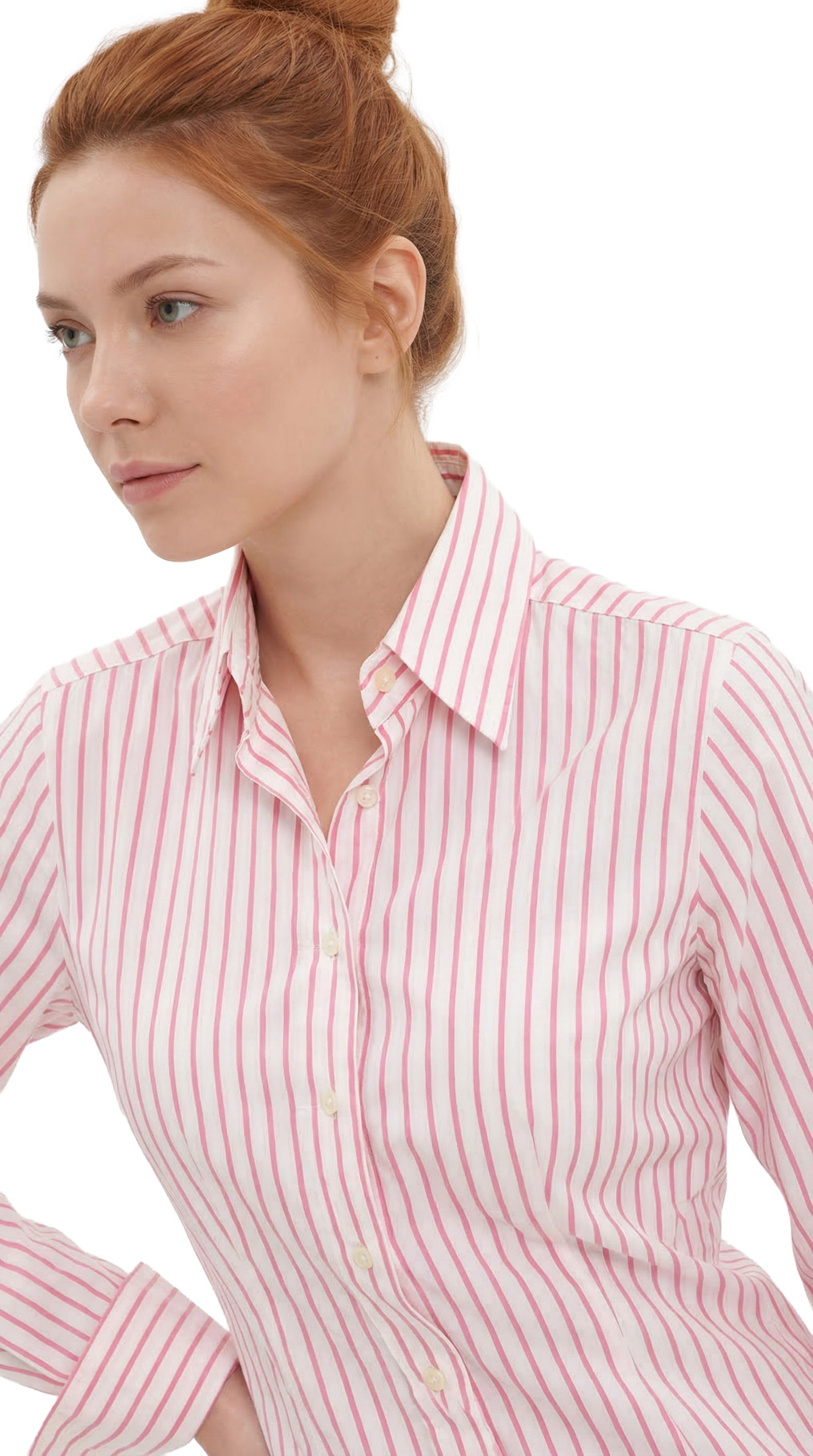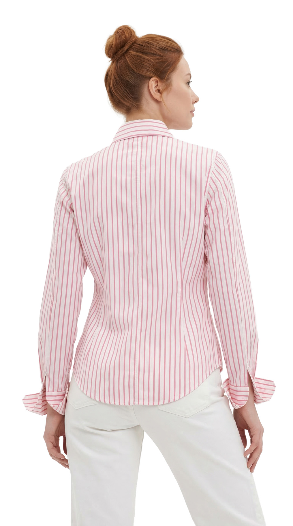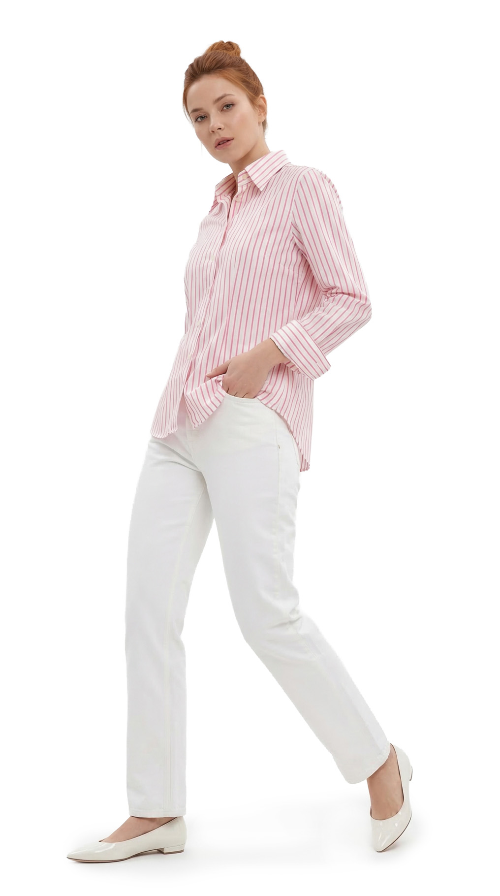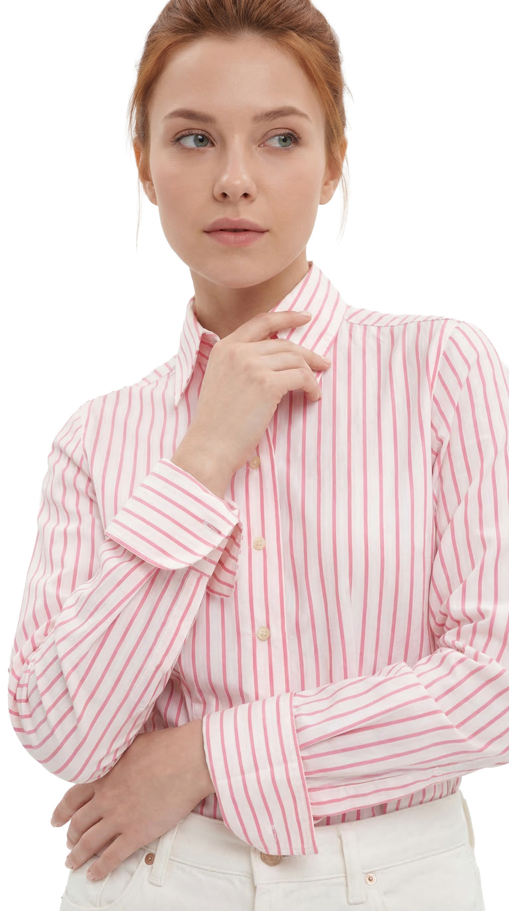 Хлопковая рубашка премиального немецкого бренда Emanuel Berg белого цвета в розовую полоску из 100% хлопка. Женственный приталенный покрой. Длинный рукав с широкой отворачиваемой манжетой, застегиваемой на запонки. Классический воротничок. Застежка на перламутровые пуговки. В составе: из 100% хлопок — ткань легкая, шелковистая, приятная к телу. Состояние — идеальное, как новое.