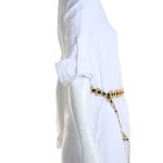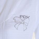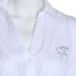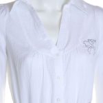 Новая блузка-рубашка итальянского бренда PDK белого цвета. Удлиненный полу-приталенный покрой с длинным отворачиваемым на пуговки в 3/4 рукавом и отложным воротничком с V-вырезом горловины. Фирменная аппликация стразами на груди. Застежка на пуговки. Будет отлично смотреться с поясом (для примера, в комплект не входит). В составе: 100% хлопок — ткань легкая, мягкая. Состояние — новое, с фирменной биркой PDK.