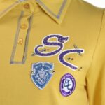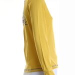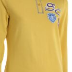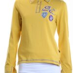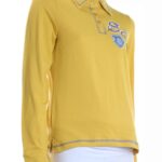 Новая яркая рубашка-поло итальянского бренда Sarah Chole желтого цвета с классическим отложным воротничком и длинным рукавом с широкой манжетой. Фирменная аппликация и декорация бисером и стразами на груди и по спинке. Шлички в боковых швах для комфортной посадки. Застежка на пуговки по планке. Контрастная окантовка швов голубой нитью. В составе 95% хлопок, 5% эластан — ткань средней плотности, мягкая, хорошо тянется. Состояние — новое, с фирменной биркой Sarah Chole.