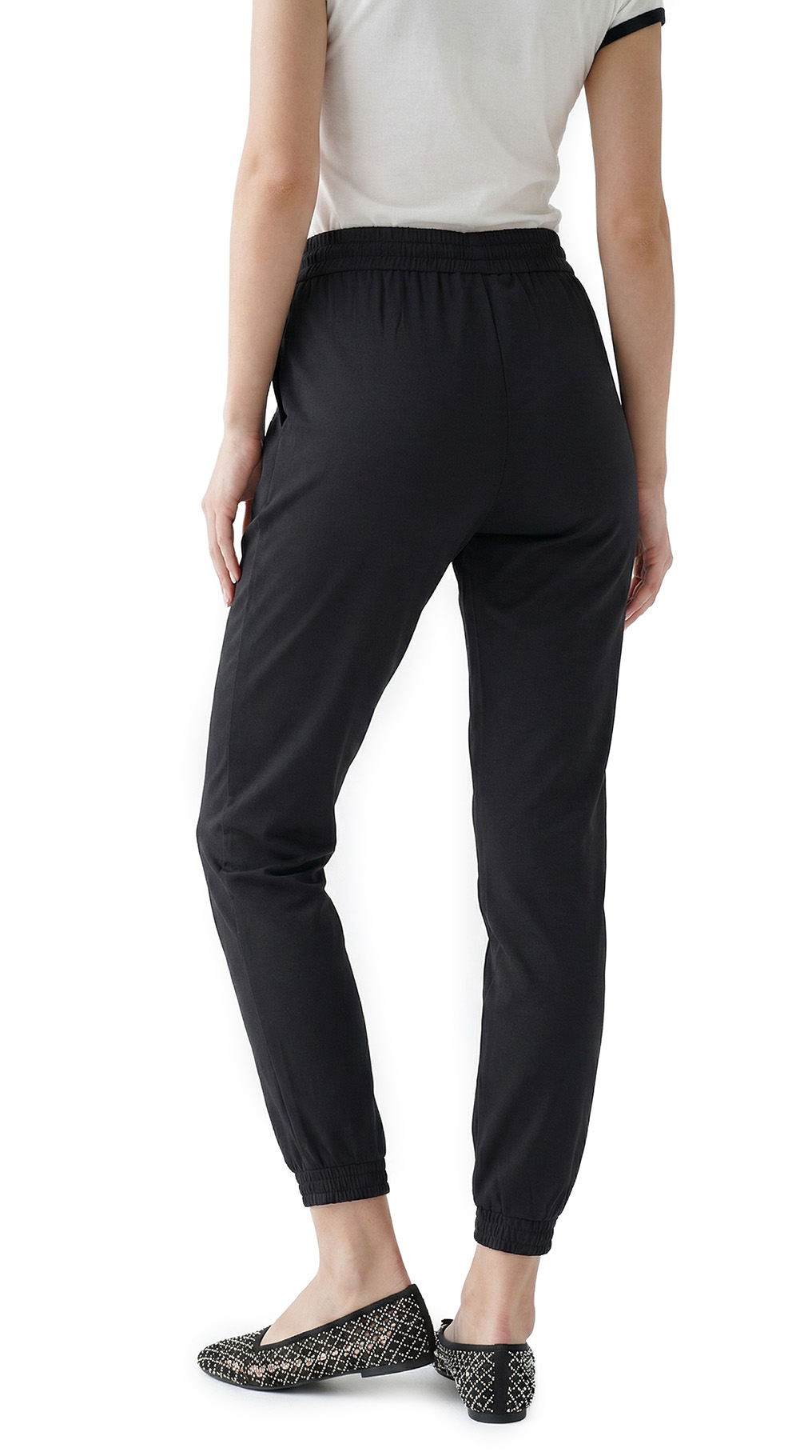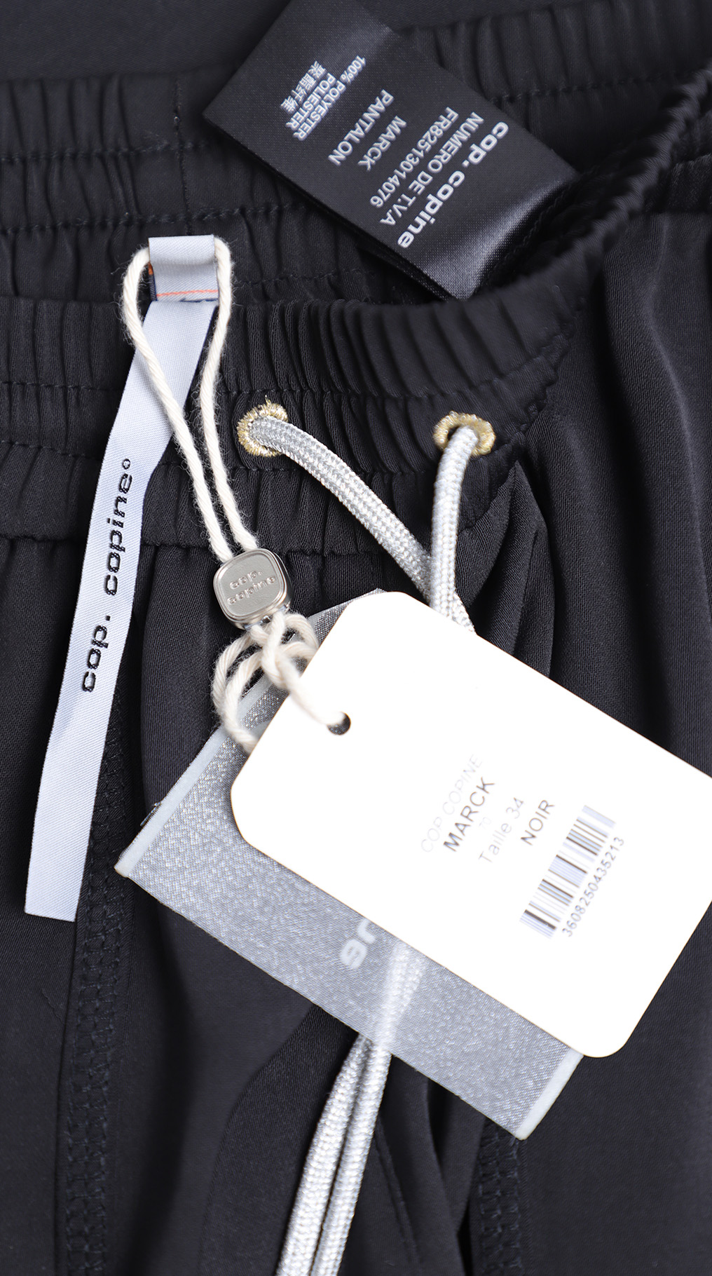 Новые брюки легендарного французского бренда Cop Copine черного цвета. Свободный в бедрах фасон с широкой резинкой по талии и щиколоткам. Посадка по талии с подвязкой на серебряный кантик. Врезные кармашки по бокам. Фирменная плашка Cop Copine на кармашке. Без застежки. Пошив — Португалия. В составе: 100% п.э, без подклада: ткань экстра качества: легкая, мягкая,шелковистая. Состояние — новое, с оригинальной запломбированной биркой Cop Copine.