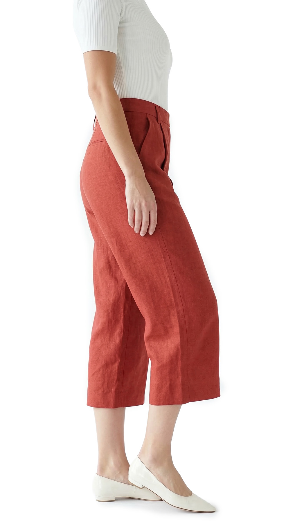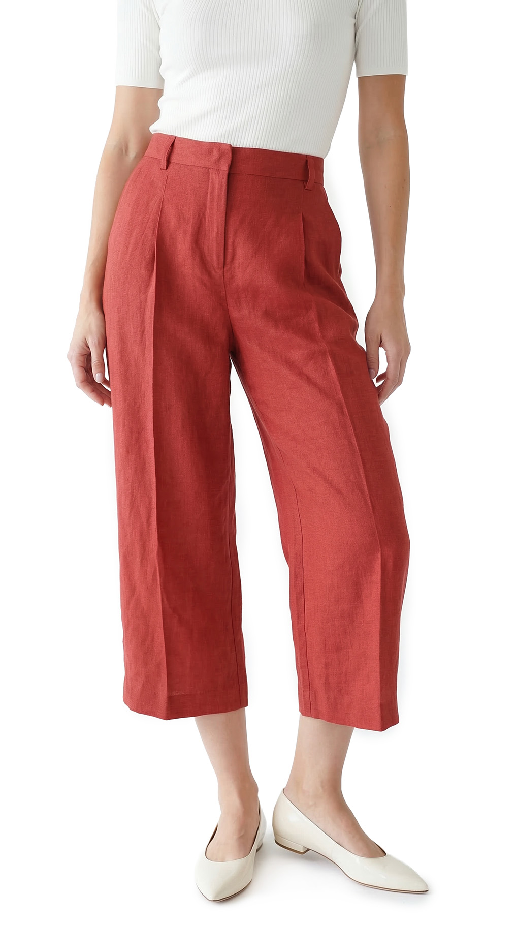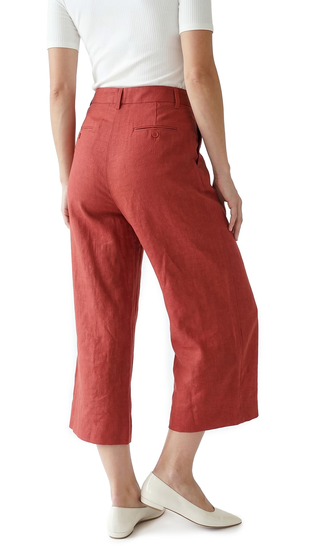 Оригинал. Новые льняные брюки-кюлоты концерна Max Mara (линия Weekend) шикарного терракотового цвета. Широкие укороченные брючины свободного кроя от бедра и посадкой по талии. Складочки по переду добавляют комфорта при посадке и придают стильный, модный, образ. Застежка на потайную молнию, пуговку и крючок. Кармашки по бокам, и по спинке на пуговке. Пошив — Албания. В составе: 100% лен, без подклада — ткань экстра качества: средней плотности, мягкая, приятная к телу, с красивым отблеском. Состояние — новое, из аутлета концерна MaxMara (ярлык бренда надрезан — это политика аутлета).