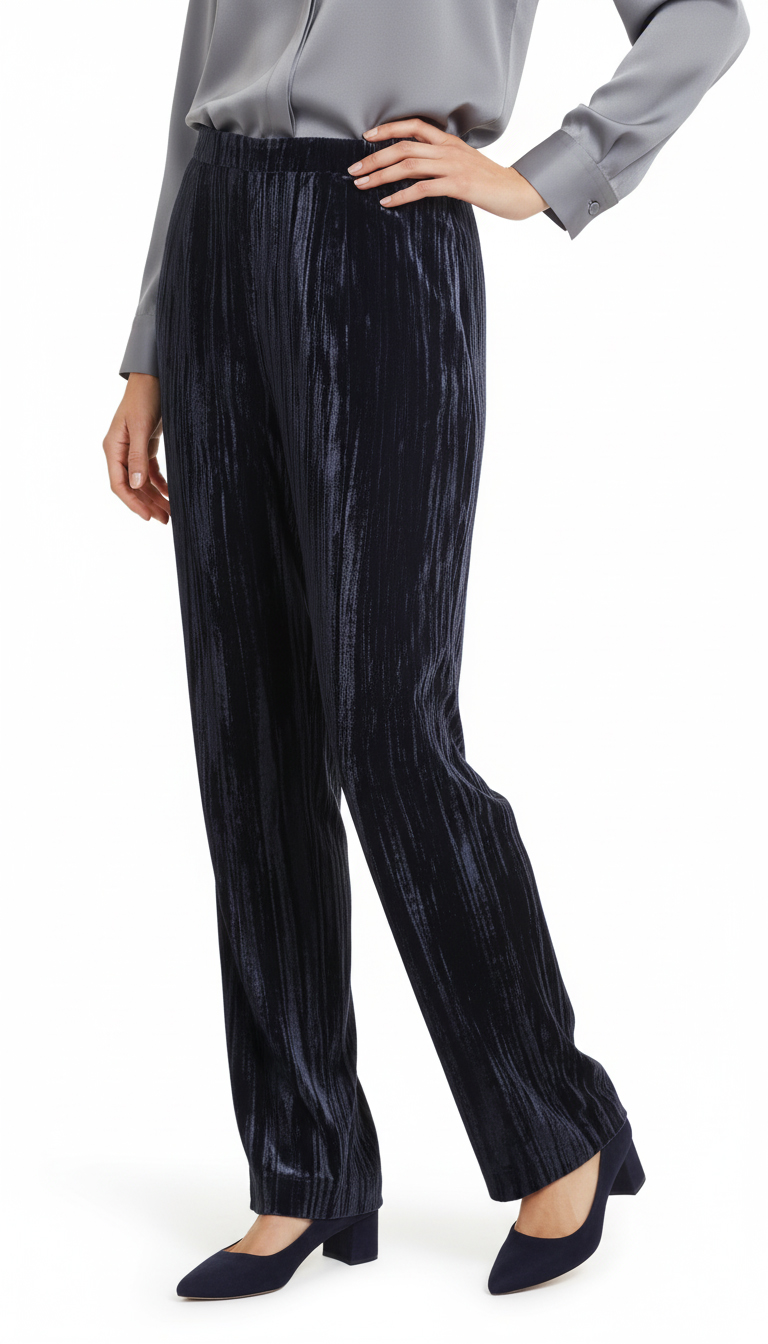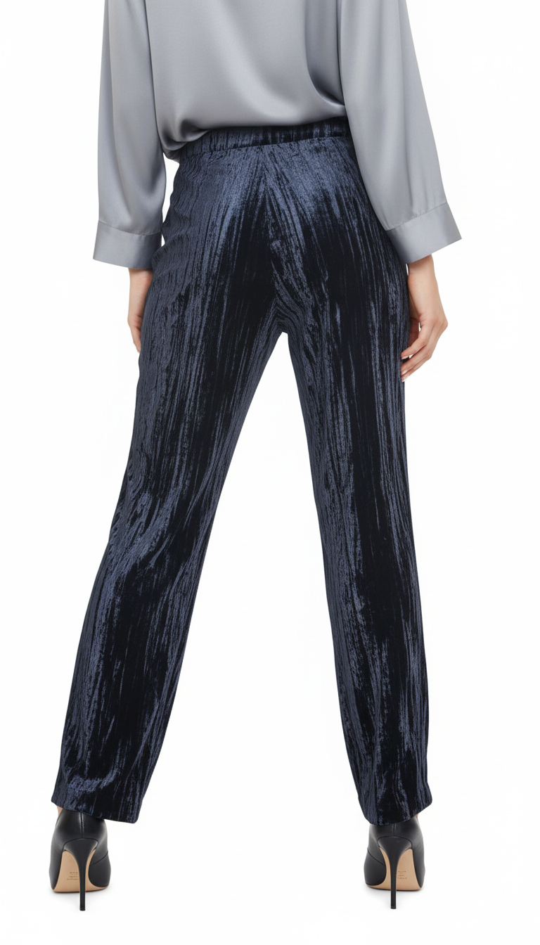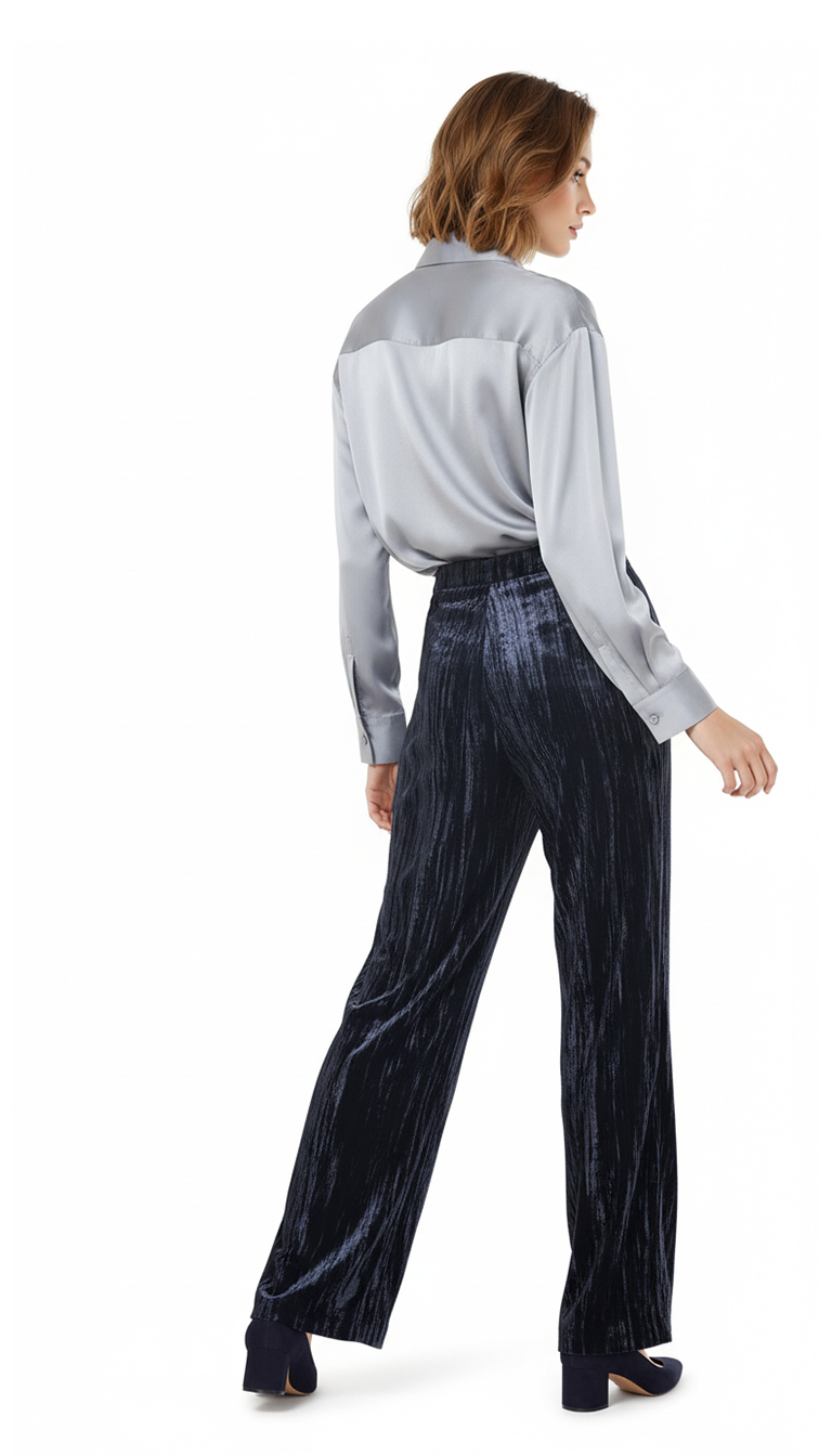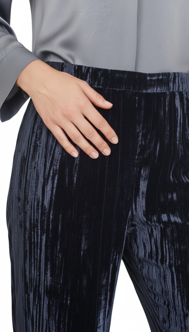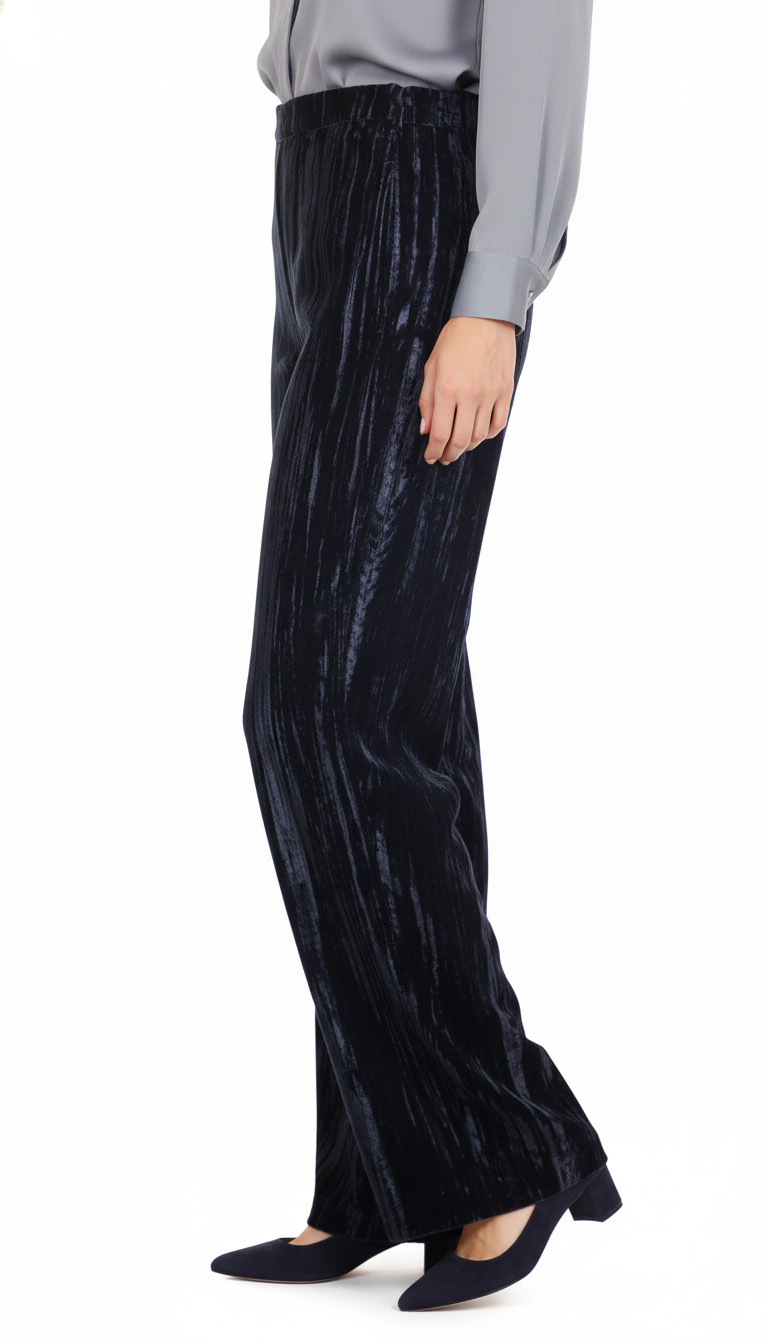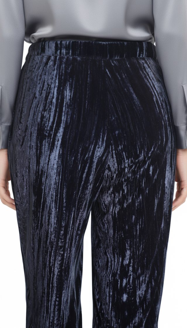 Оригинал. Новые бархатные брюки концерна Max Mara глубокого темно-синего (почти черного) цвета. Фасон с широкими брючинами и классической посадкой по талии. Застежка сбоку на молнию. Врезные кармашки по бокам. Мега-стильный, модный, вариант — универсальное дополнение к гардеробу. В составе: 100% п.э, без подклада — ткань экстра качества: плотная, с мягким бархатистым ворсом, фактурная — продольные линии создают объемный световой эффект — матового перелива на свету. Состояние — новое, из аутлета концерна MaxMara (ярлык бренда надрезан — это политика аутлета).