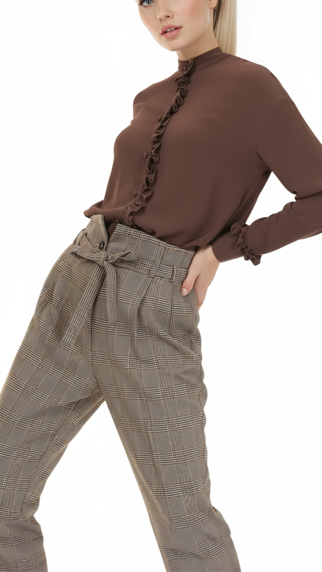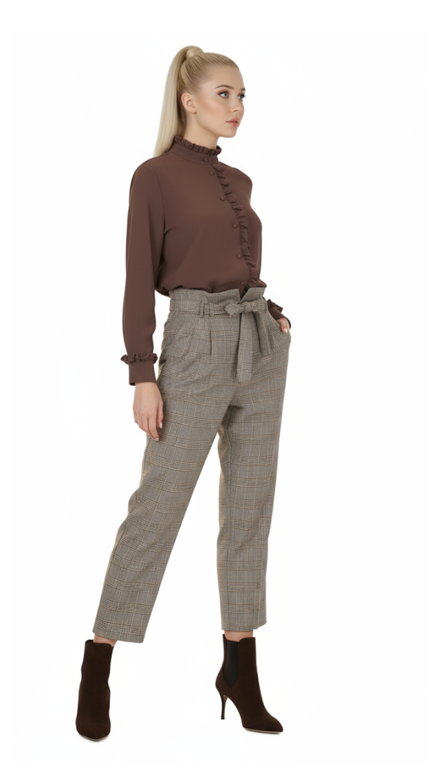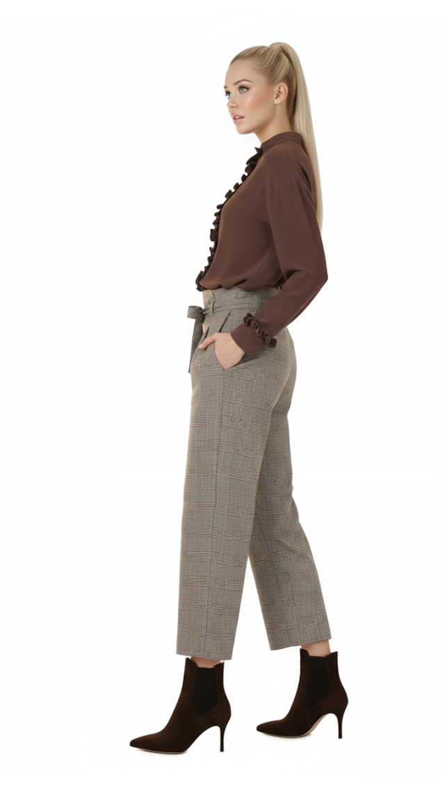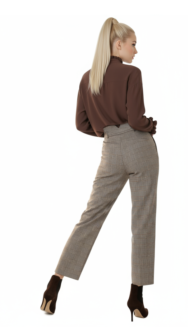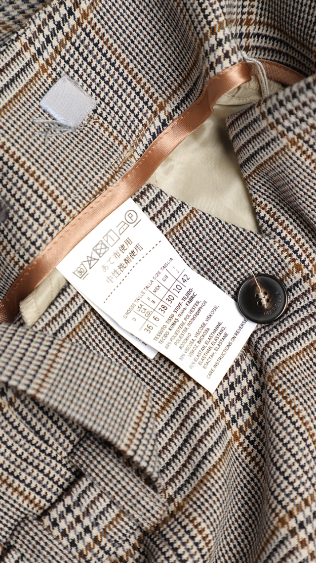 Оригинал. Новые брюки концерна Max Mara (линия Emme Marella) с серо-бежевым клетчатым узором. Укороченный фасон с завышенной талией и поясом на шличках. Застежка на молнию и пуговку с гравировкой Marella. Врезные кармашки в боковых швах, фальшь-кармашки по спинке. Пошив — Италия. В составе: 30% вискоза, 69% п.э, 1% эластан, без подклада — ткань средней плотности, мягкая. Состояние — новое, из аутлета концерна MaxMara (ярлык бренда надрезан — это политика аутлета).