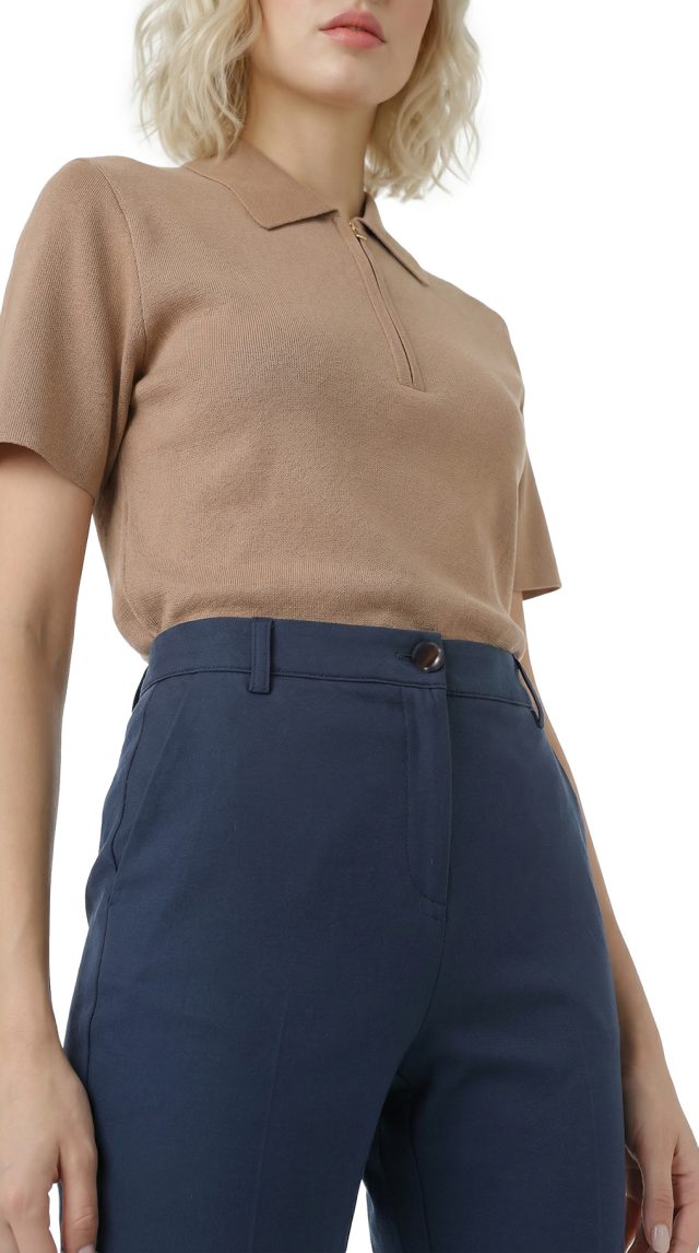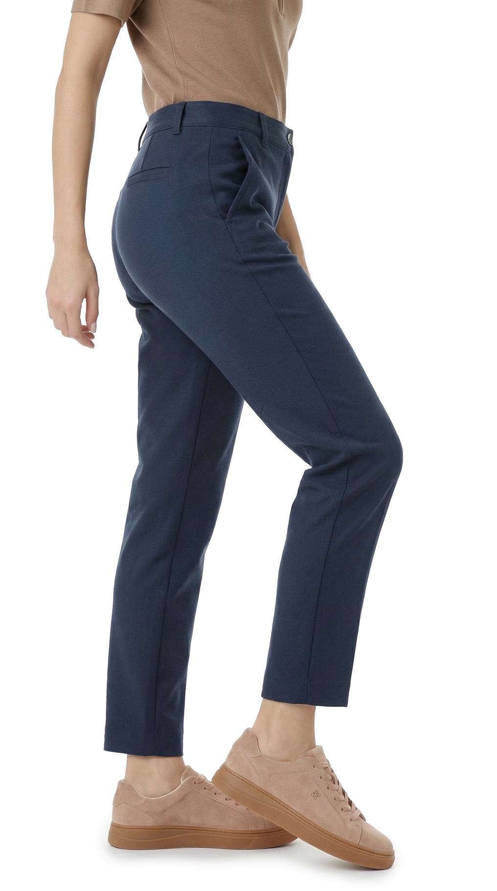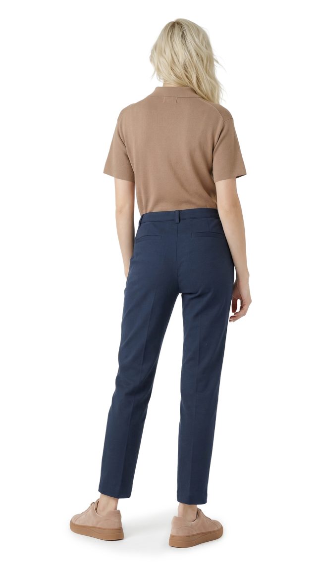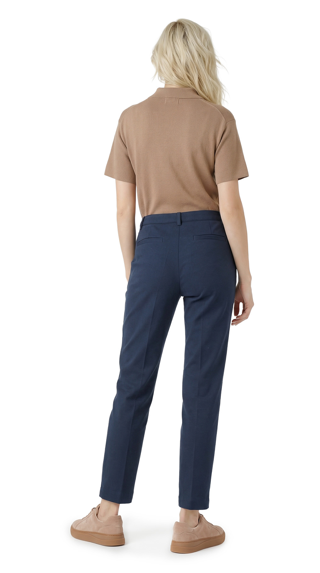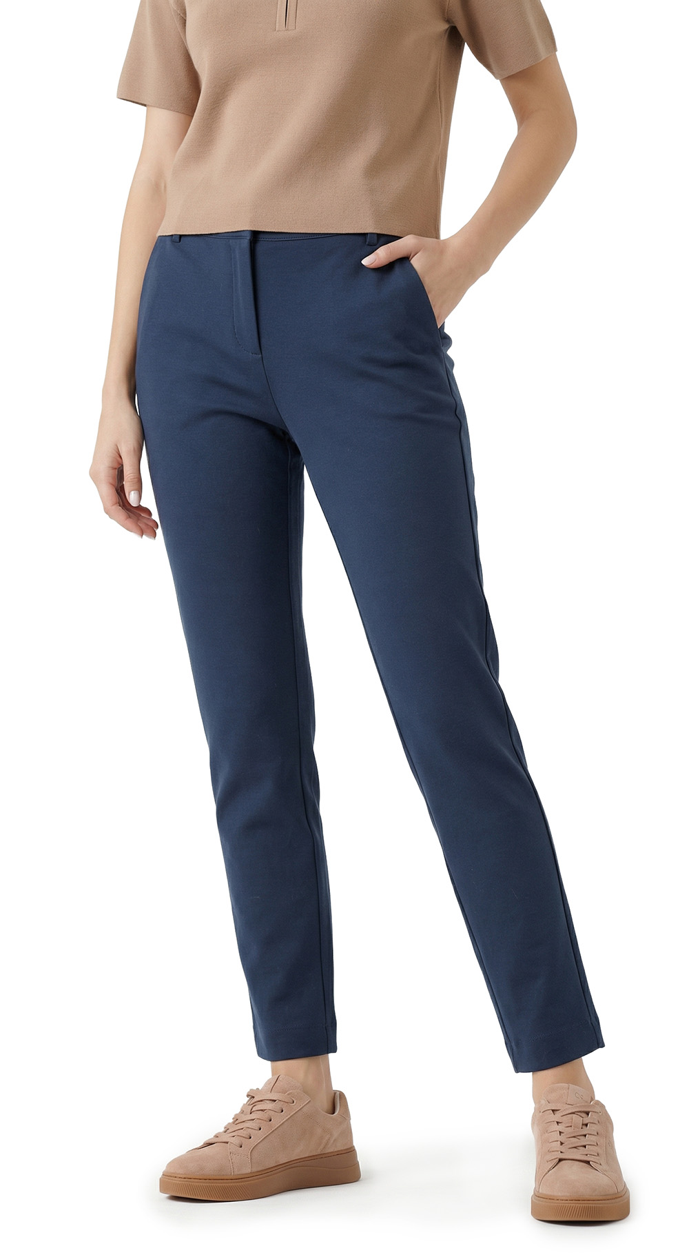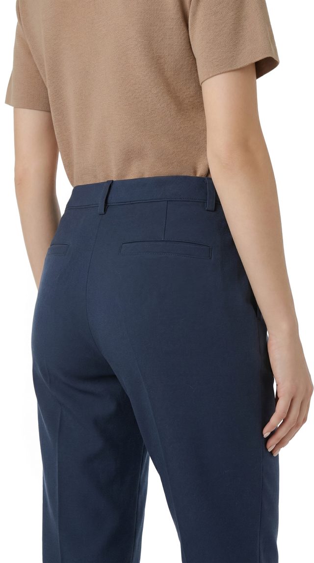 Новые трикотажные брюки легендарного итальянского бренда Max Mara темно-синего (чернильного) цвета немного зауженные книзу. Пояс со шличками под ремень. Застежка на потайную молнию и серебряную пуговку. Врезные кармашки по бокам и спинке. В составе: 96% хлопок, 4% эластан — ткань плотная, трикотажная, немного тянется. Состояние — новое, из аутлета концерна MaxMara (ярлык бренда надрезан — это политика аутлета).