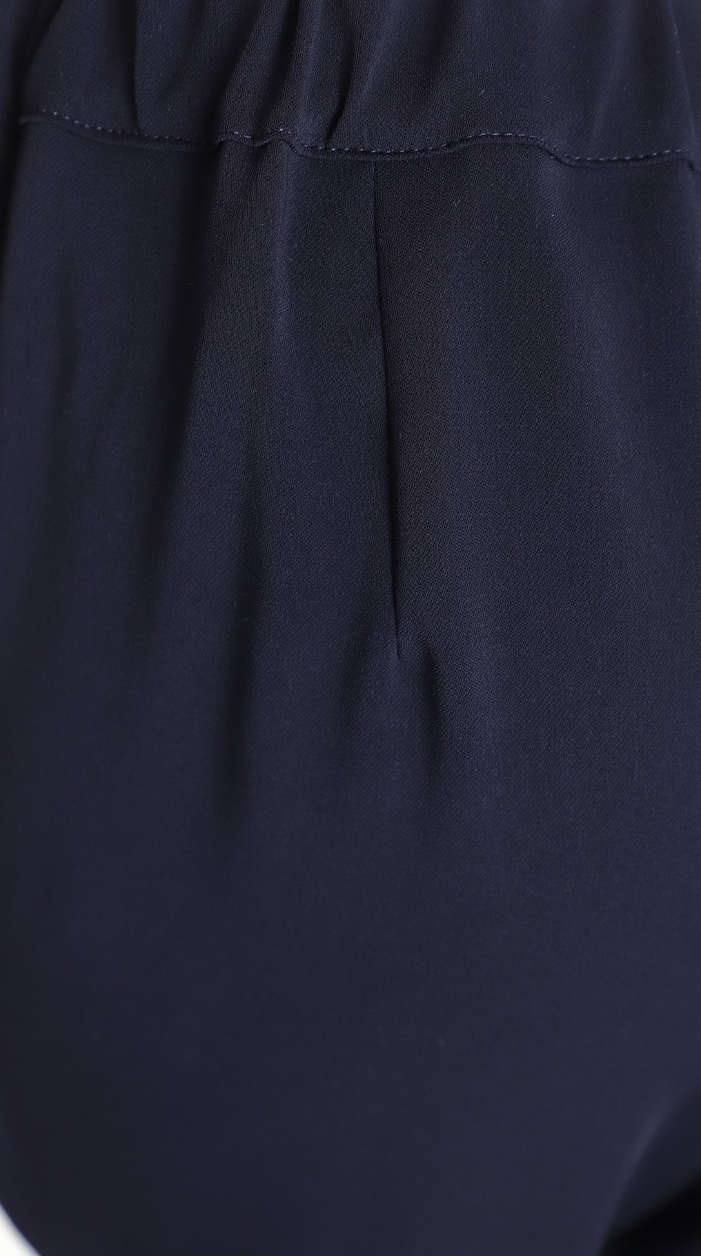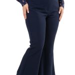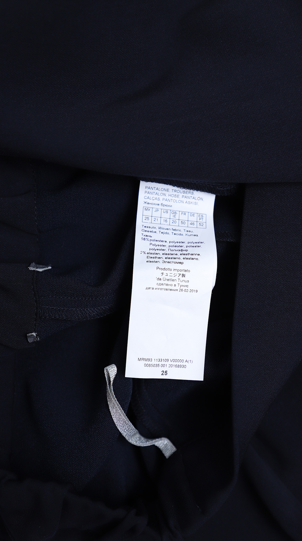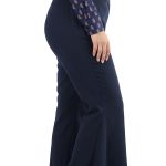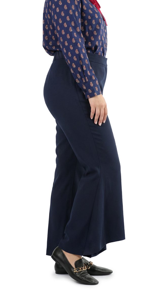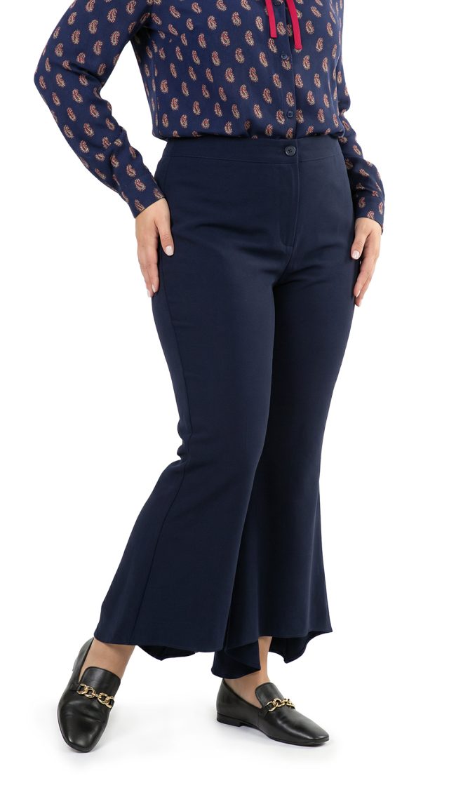 Оригинал. Новые дизайнерские брюки концерна Max Mara (линия Marina Rinaldi) темно-синего цвета. Интересный фасон с брючинами, расклешенными от колена. Комфортный пояс на резинке по спинке. Застежка на потайную молнию и пуговку. Без кармашков. Пошив — Тунис. В составе: 95% п.э, 5% эластан, без подклада — ткань средней плотности, очень мягкая, шелковистая, эластичная. Состояние — новое, из аутлета концерна MaxMara (ярлык бренда надрезан — это политика аутлета).