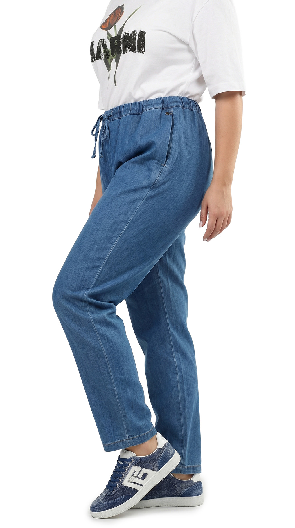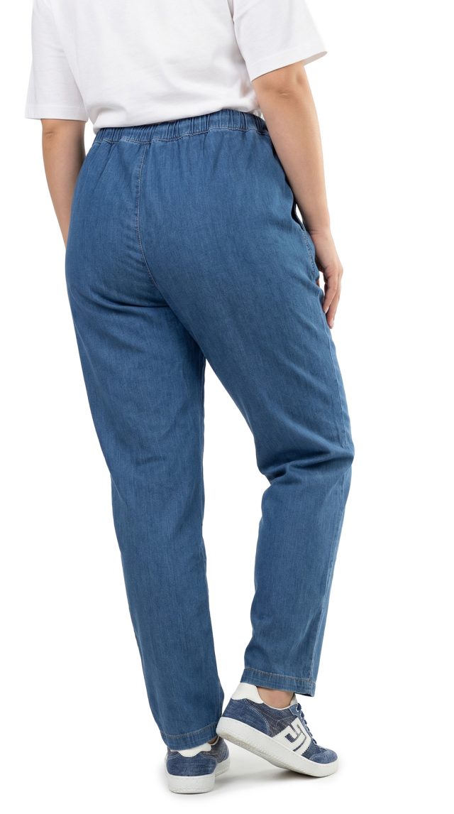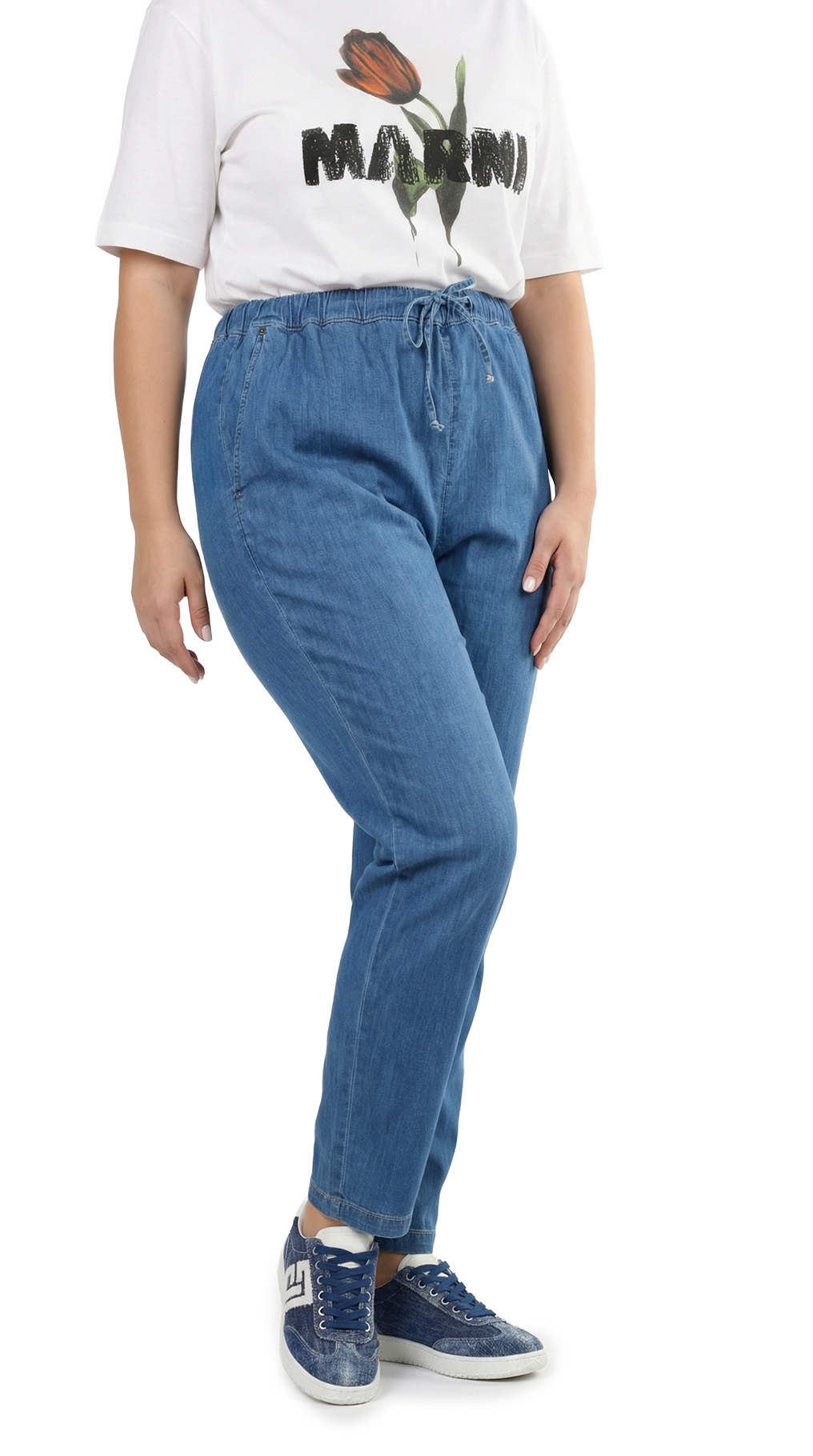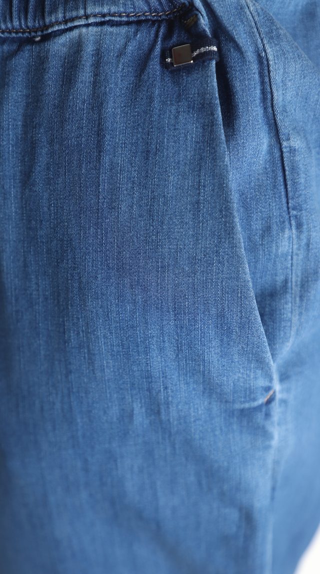 Оригинал. Новые летние брюки концерна Max Mara (коллекция Marina Rinaldi) голубого цвета под легкую “джинсу”. Зауженный фасон с посадкой по талии. Комфортный пояс на резинке с подвязкой на кантик. Врезные кармашки по бокам. Фирменная серебряная бусина на серебристой плашке. Без застежки. В составе: 98% хлопок, 2% эластан – ткань экстра качества: легкая, мягкая, эластичная. Состояние — новое, из аутлета концерна MaxMara (ярлык бренда надрезан – это политика аутлета).