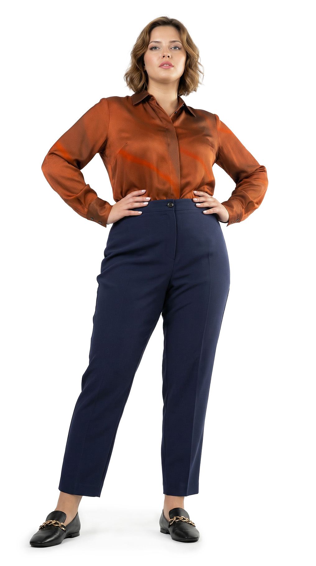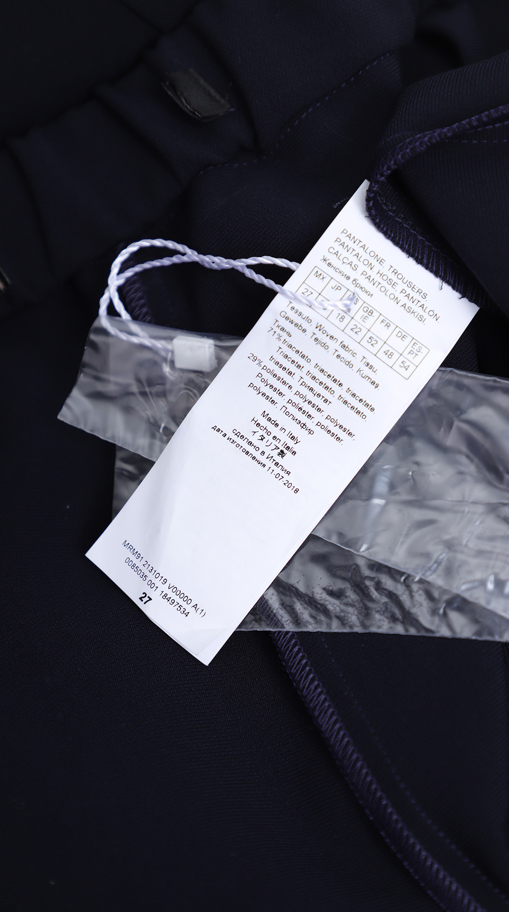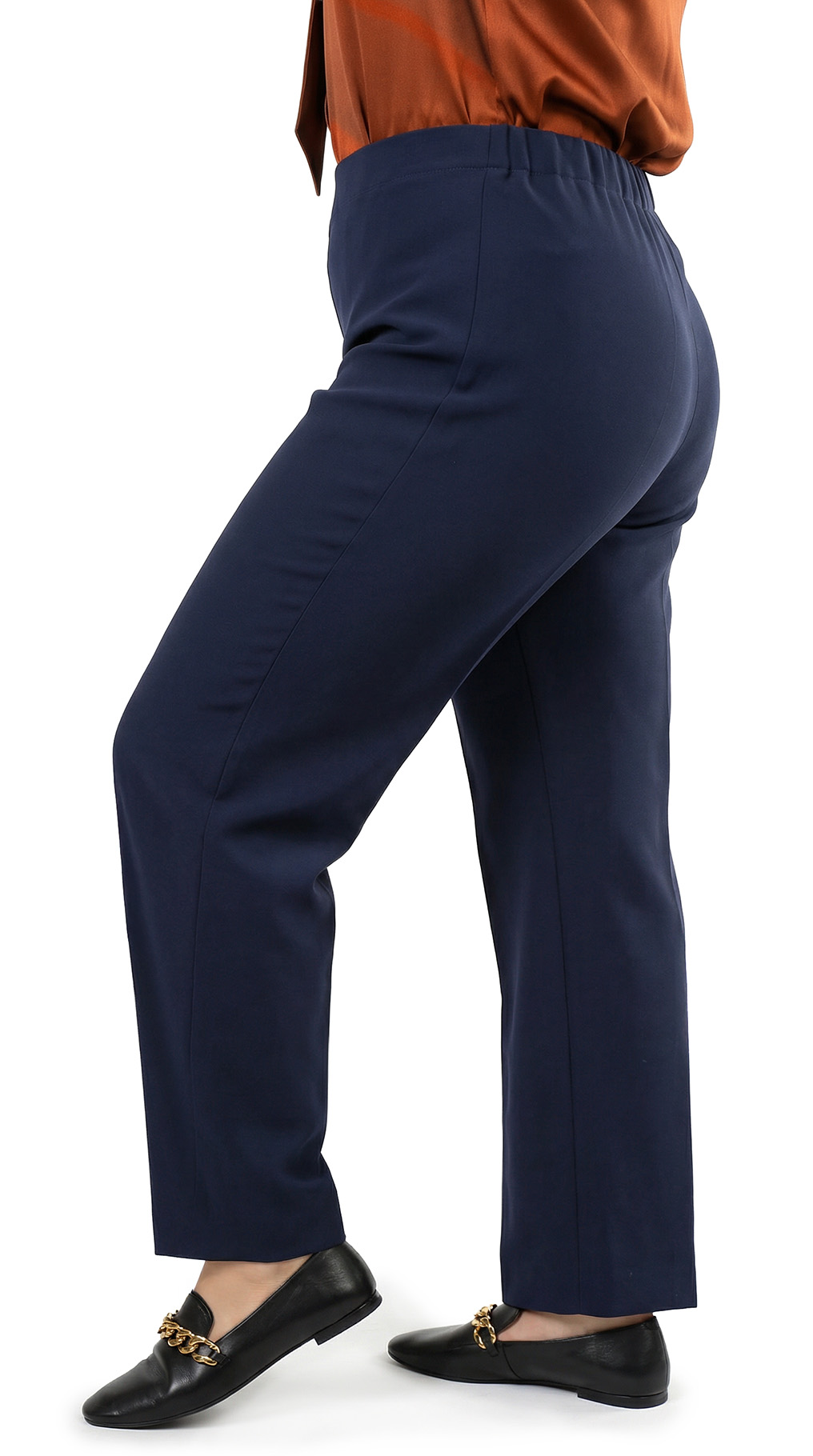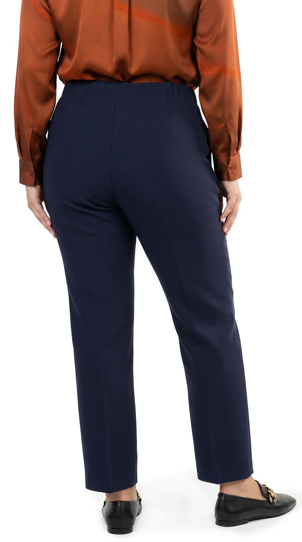 Оригинал. Новые классические брюки легендарного итальянского бренда Max Mara (линия Marina Rinaldi) темно-синего цвета. Зауженный фасон брючин с посадкой по талии. Комфортный пояс с резинкой по спинке. Застежка на потайную молнию и пуговку. Без кармашков. Пошив — Италия. В составе: 71% триацетат, 29% п.э., без подклада — ткань средней плотности, мягкая, бархатистая, эластичная, фактурная (крепе). Состояние — новое, из аутлета концерна MaxMara (ярлык бренда надрезан — это политика аутлета).